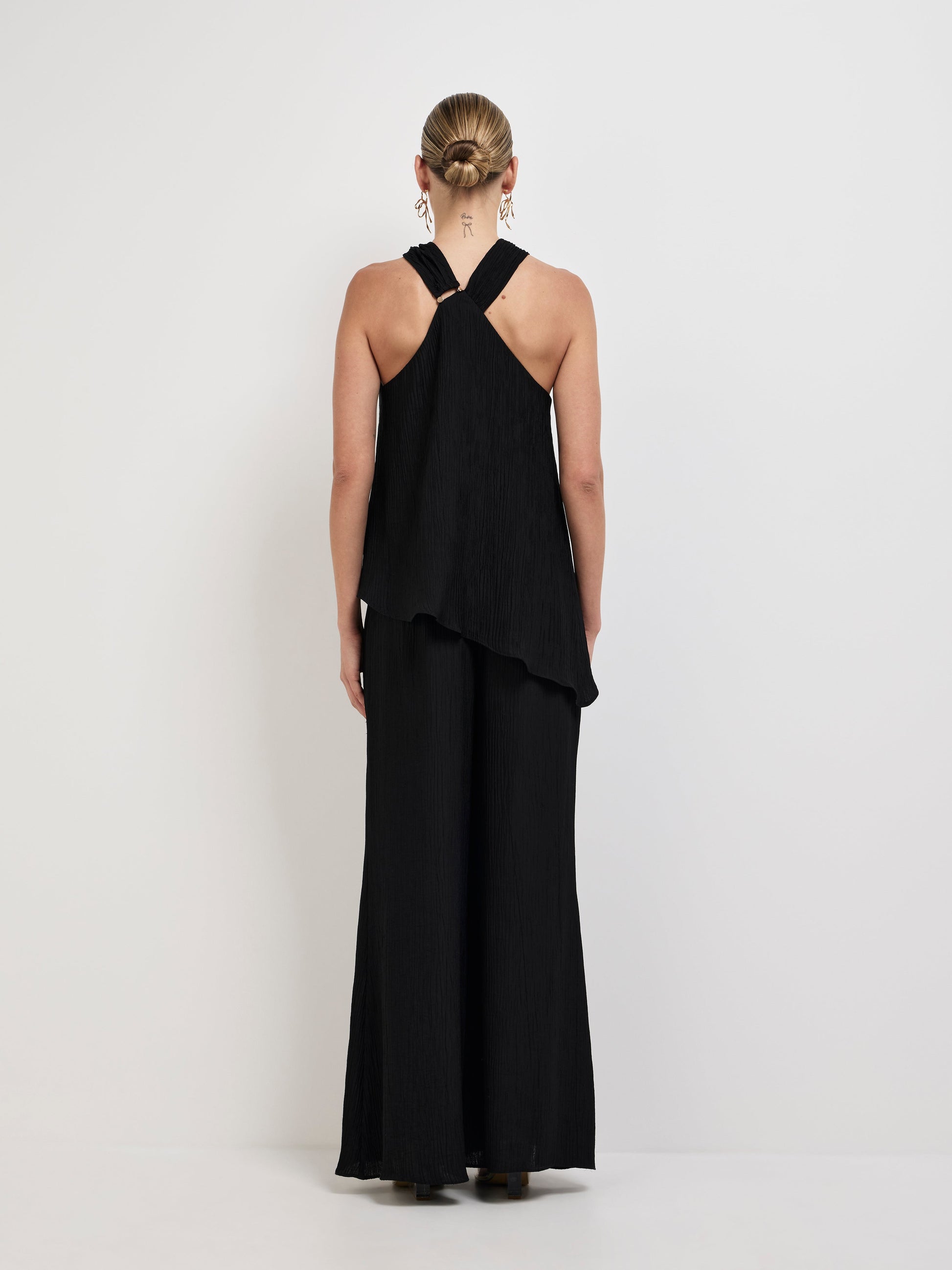 Elevate your evening look with the Gemini Top in Black. Crafted from a soft crinkle woven fabric, this flattering fit-and-flare style features an asymmetrical halter neckline with a luxe gold buckle for a modern edge. Sleek racer front and back detailing keep it sharp, while a soft gold button at the collar adds a refined finish. With its asymmetrical hem, this piece is all about statement style and versatile elegance. Pair it with our Gemini Pant for the ultimate power duo!