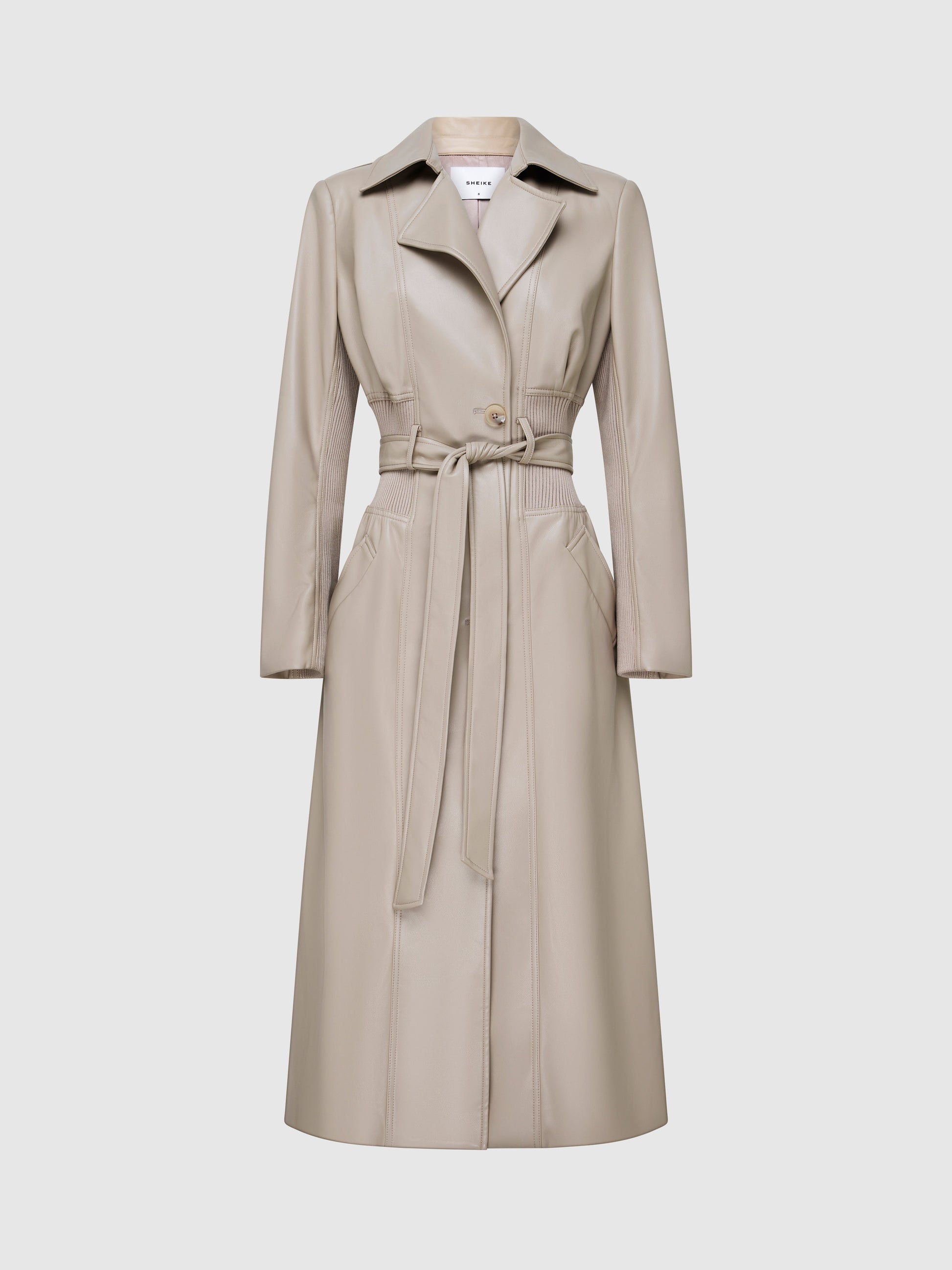 Combining timeless elegance with modern sophistication. Introducing the Gianni Trench showcasing a bone faux leather fabrication, slim fit, lapel collar, self fabric tie, rib insets at waist and back of sleeves and pockets. Pair with our Milano Earrings to complete the look.