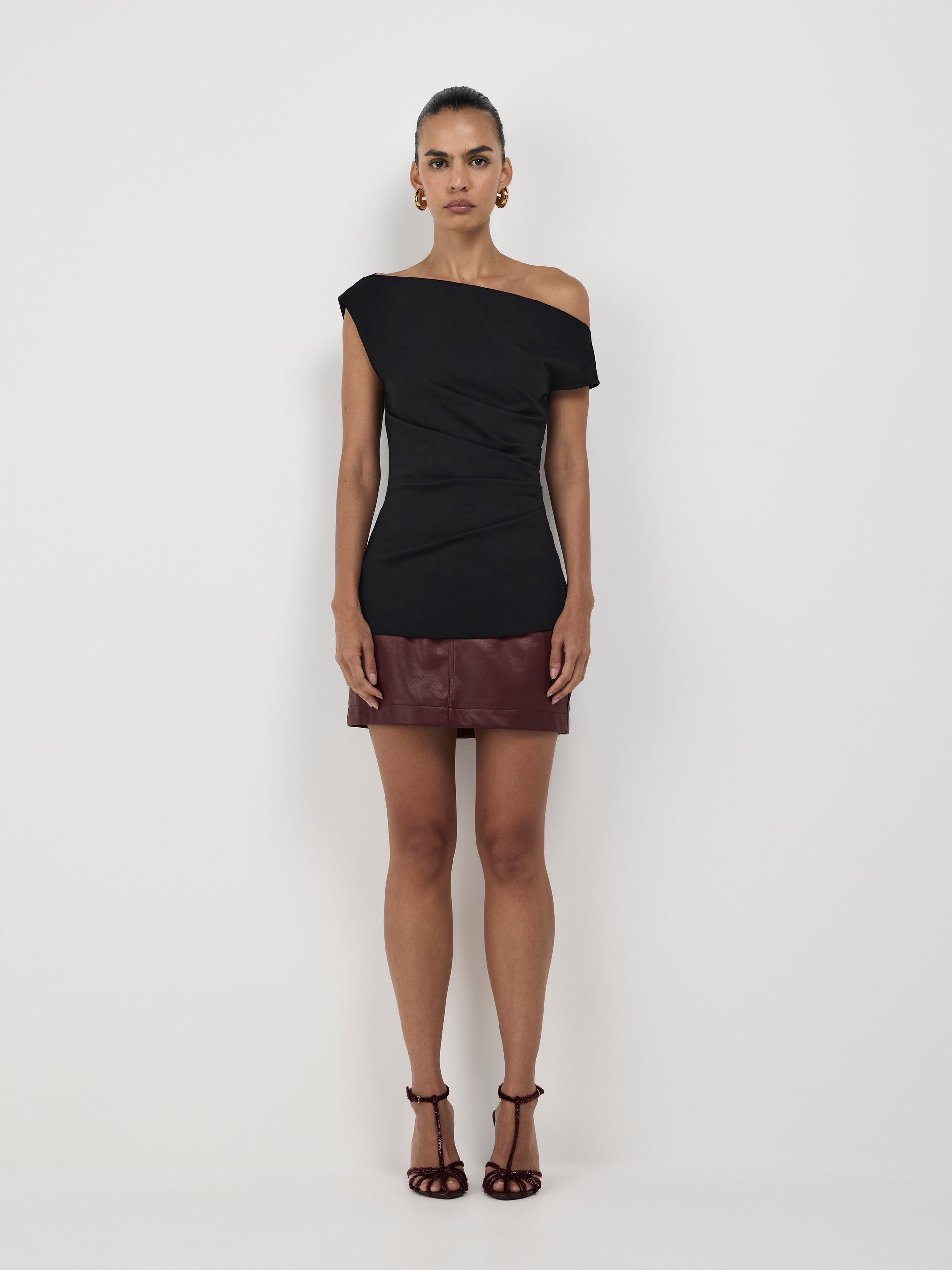 Effortlessly elevate your wardrobe with this staple classic. Introducing our Gigi Top - showcasing a black stretch fabrication, slim fit, off the shoulder strap, waist tucks and asymmetric neckline. Pair with our Monica Skirt to complete the look.