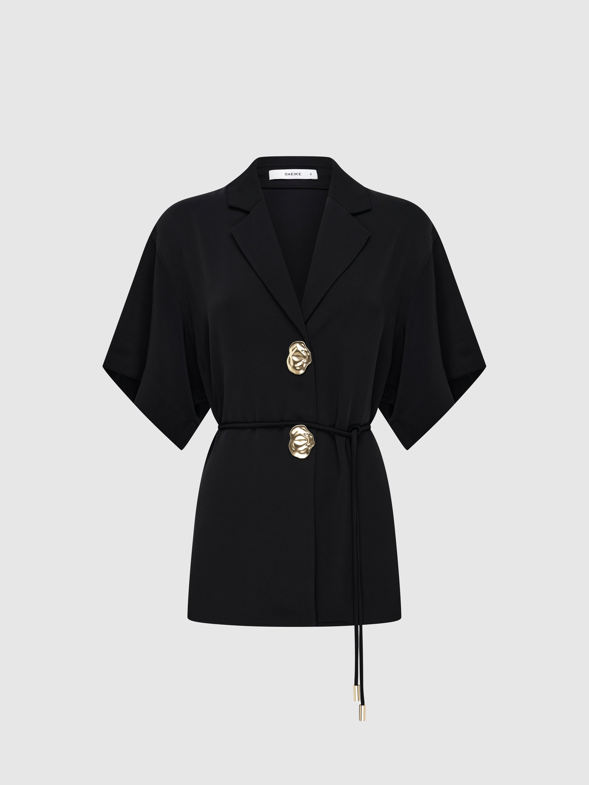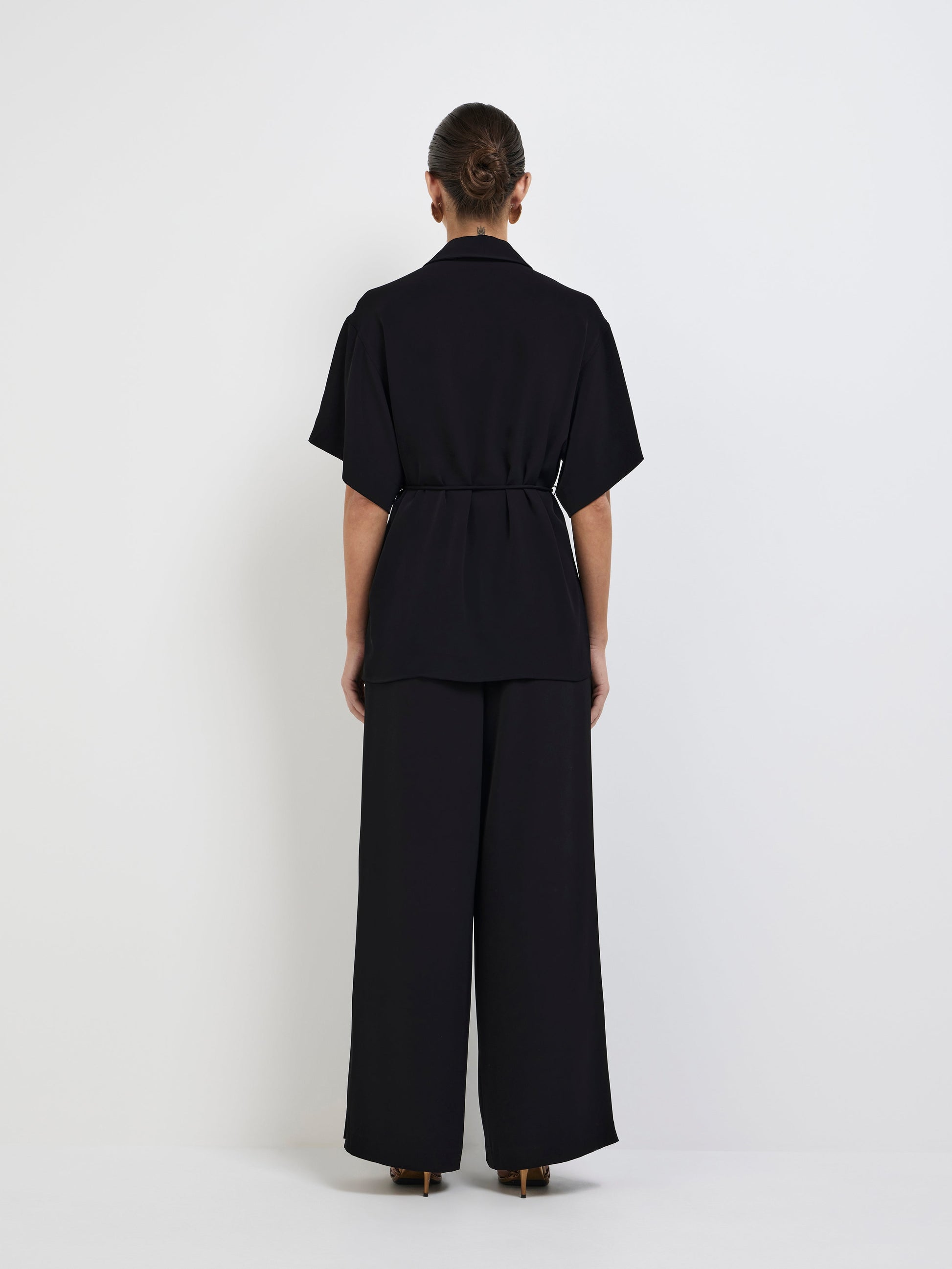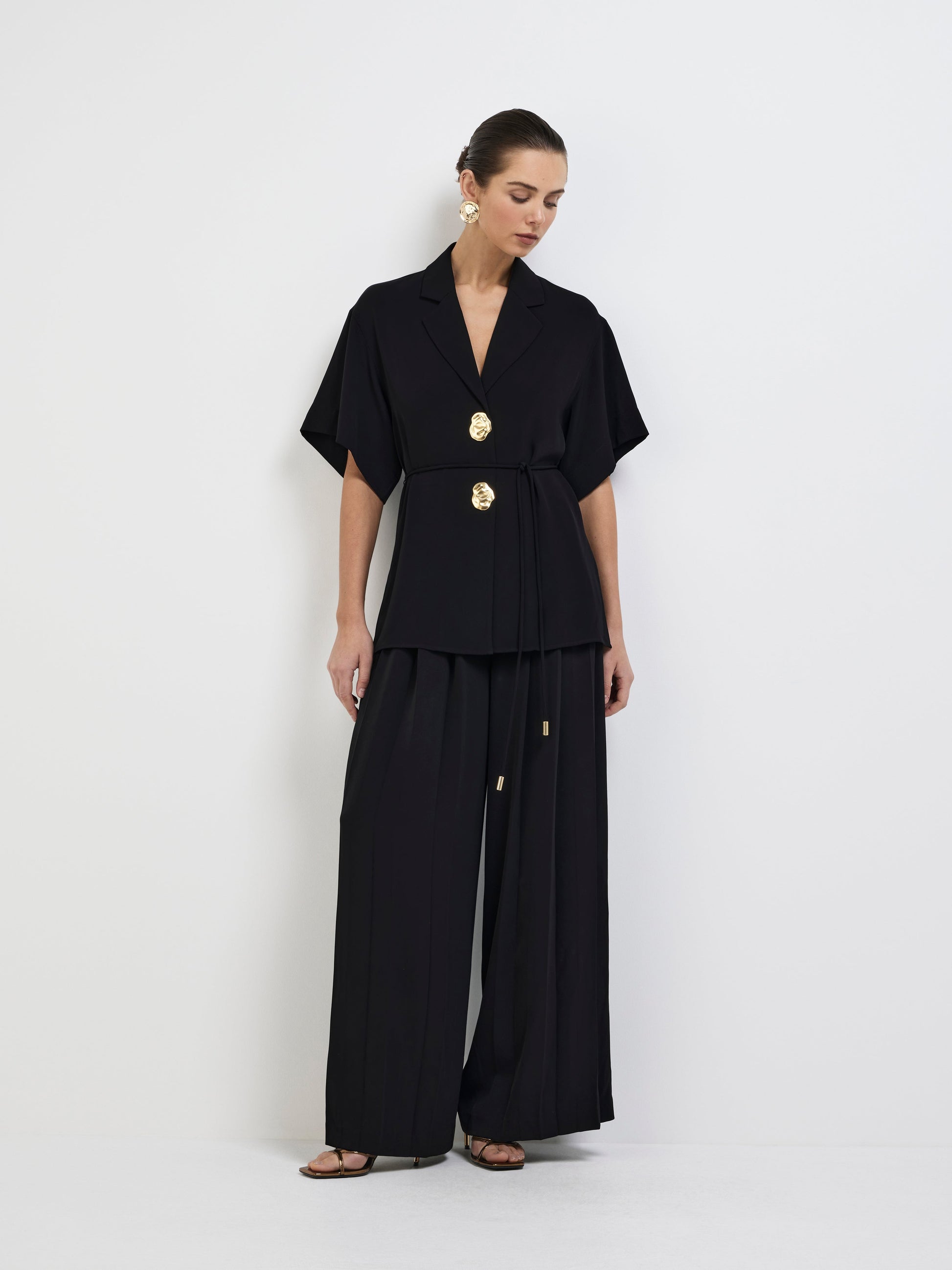 Effortlessly Elevated. Introducing the Grace Shirt - showcasing a black woven fabrication, relaxed longline styling, shawl collar and lapel neckline, short sleeves, rouleau belt, and large gold motif buttons. Pair with our matching Adele Pants to complete the look.