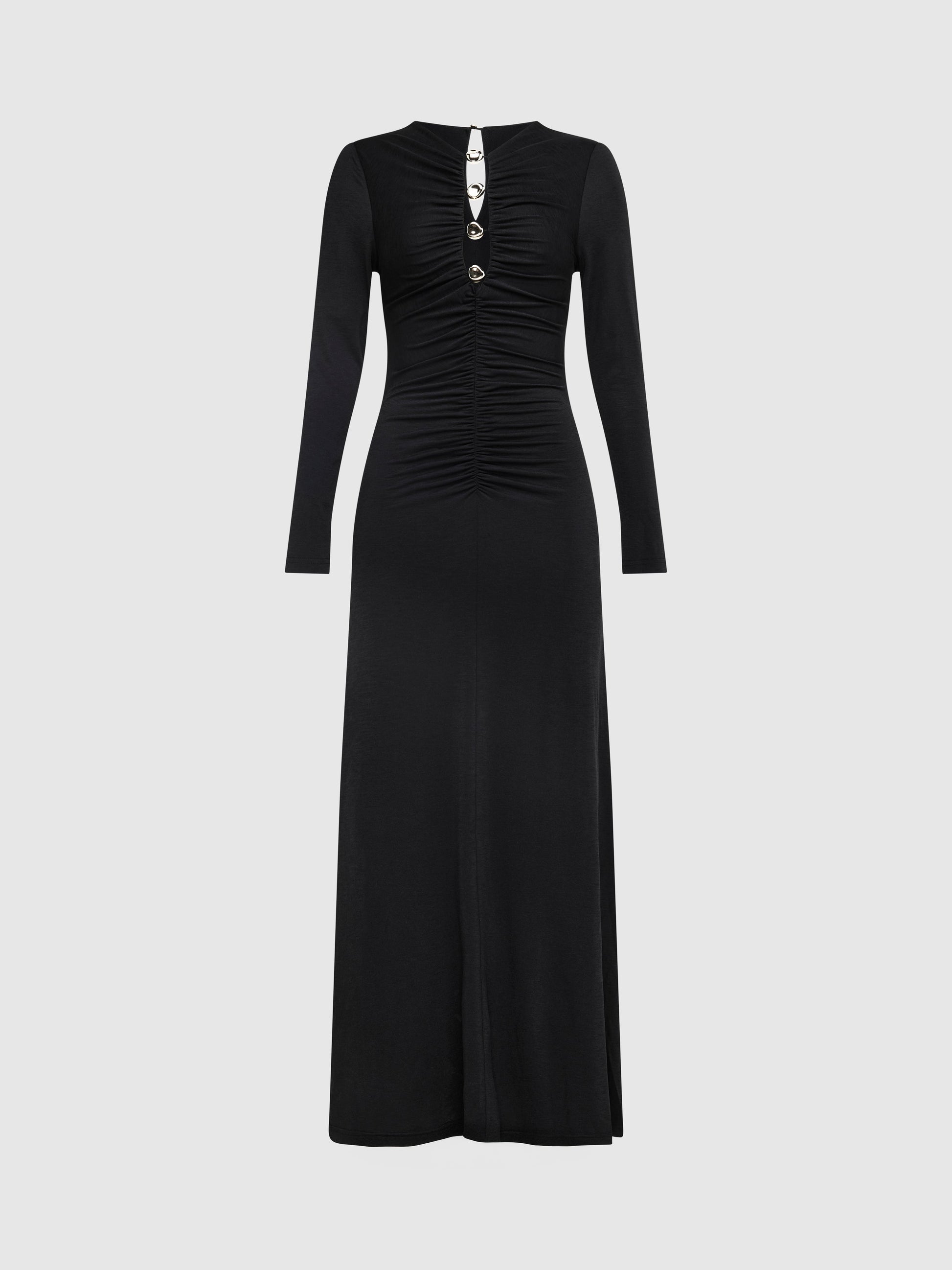 Detailed to perfection. Introducing the Harley Dress - showcasing a black stretch fabrication, slim fit cut, high V neckline with gold hardware detail, ruching at waist, long sleeves and maxi A-line skirt. Pair with our Estelle Earrings to complete the look.