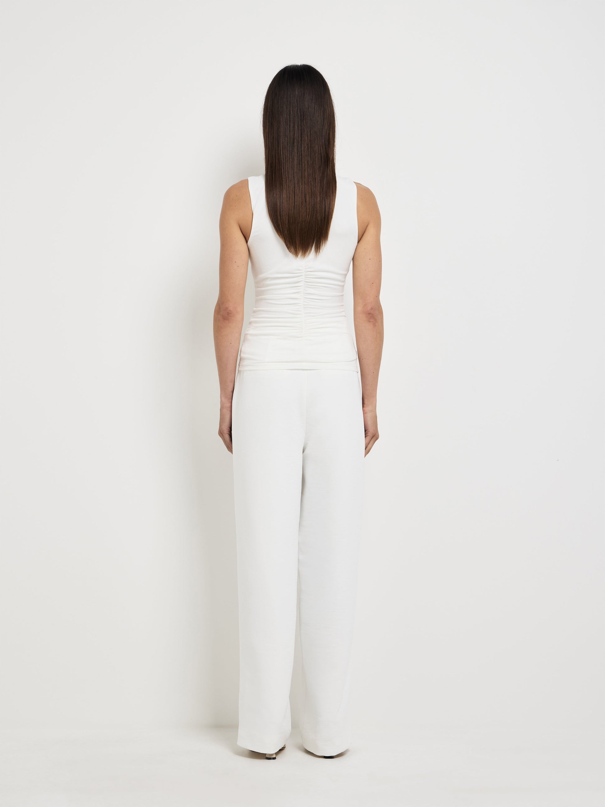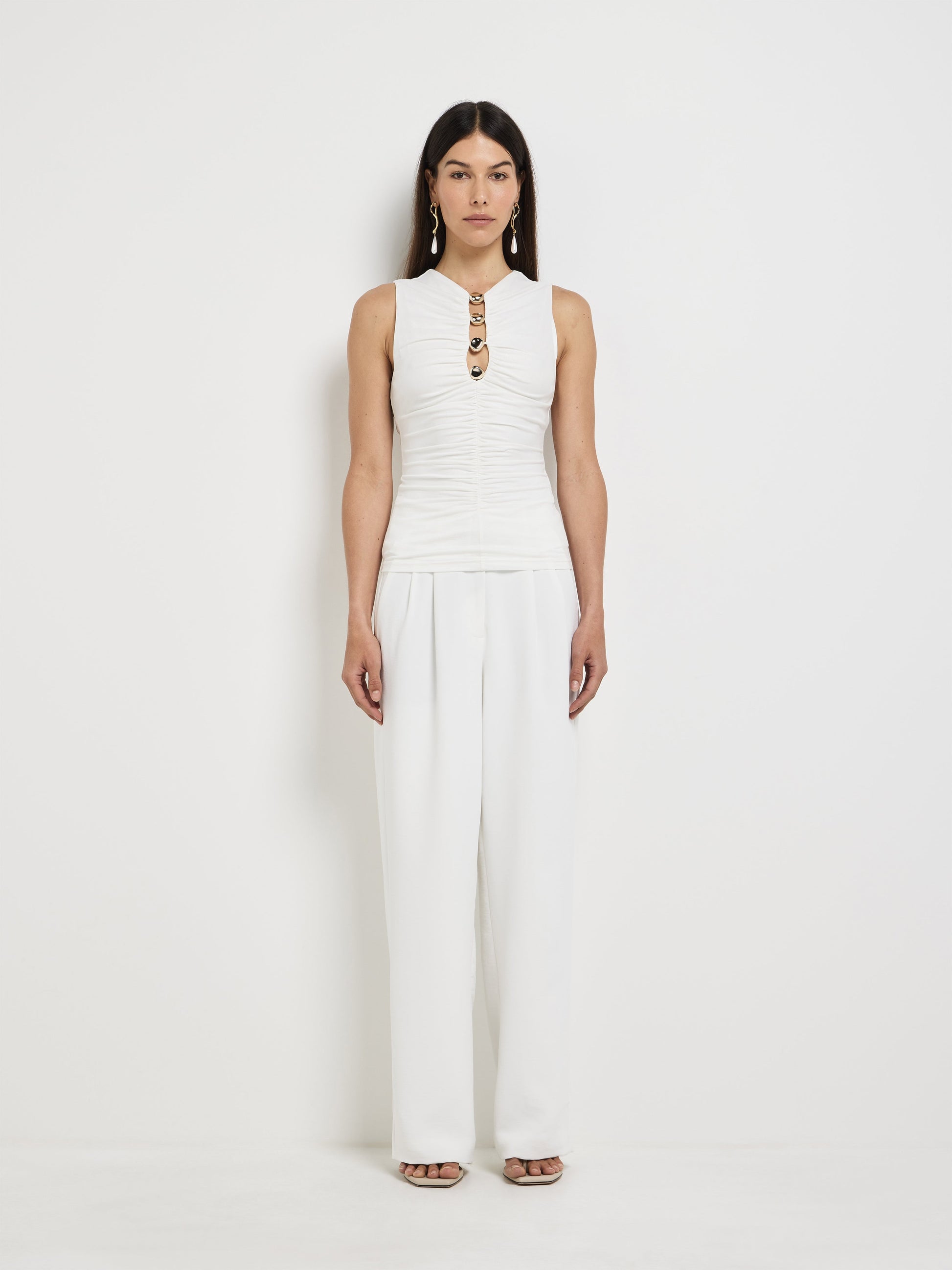 Detailed to perfection. Introducing the Harley Top - showcasing a white stretch fabrication, slim fit cut, high V neckline with gold hardware detail, ruching at waist and is sleeveless. Pair with our Atomic Pant to complete the look.