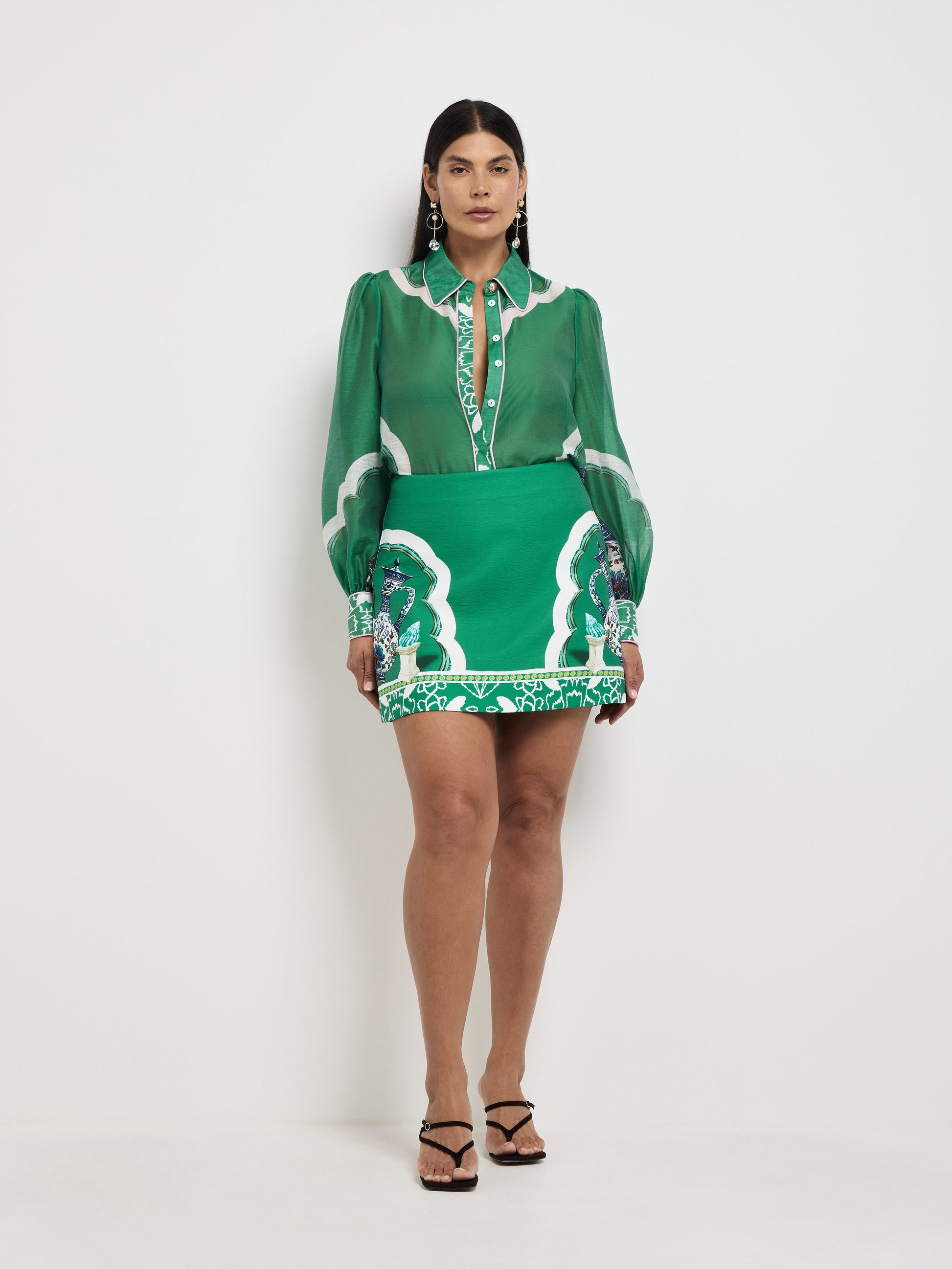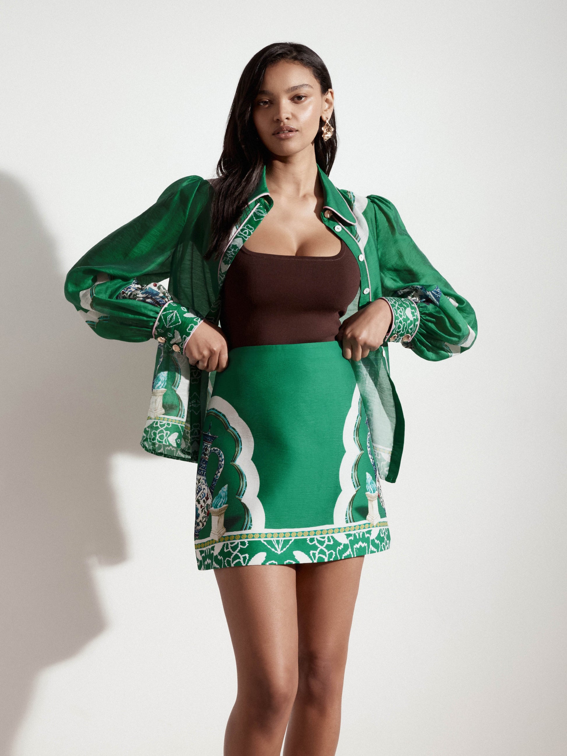 Designed to be admired! The Helena Mini Skirt features a woven fabrication, A-line styling, fixed waist, placement print and mini skirt length. Pair with our matching Helena Shirt to complete the look.