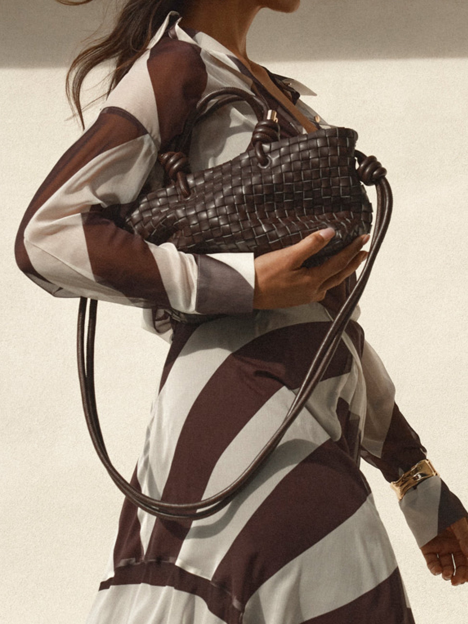 Rich chocolate tones and intricate weave detailing make up the Jardan Bag. Featuring a chocolate woven body, magnetic closure, knot handles and long shoulder strap.
