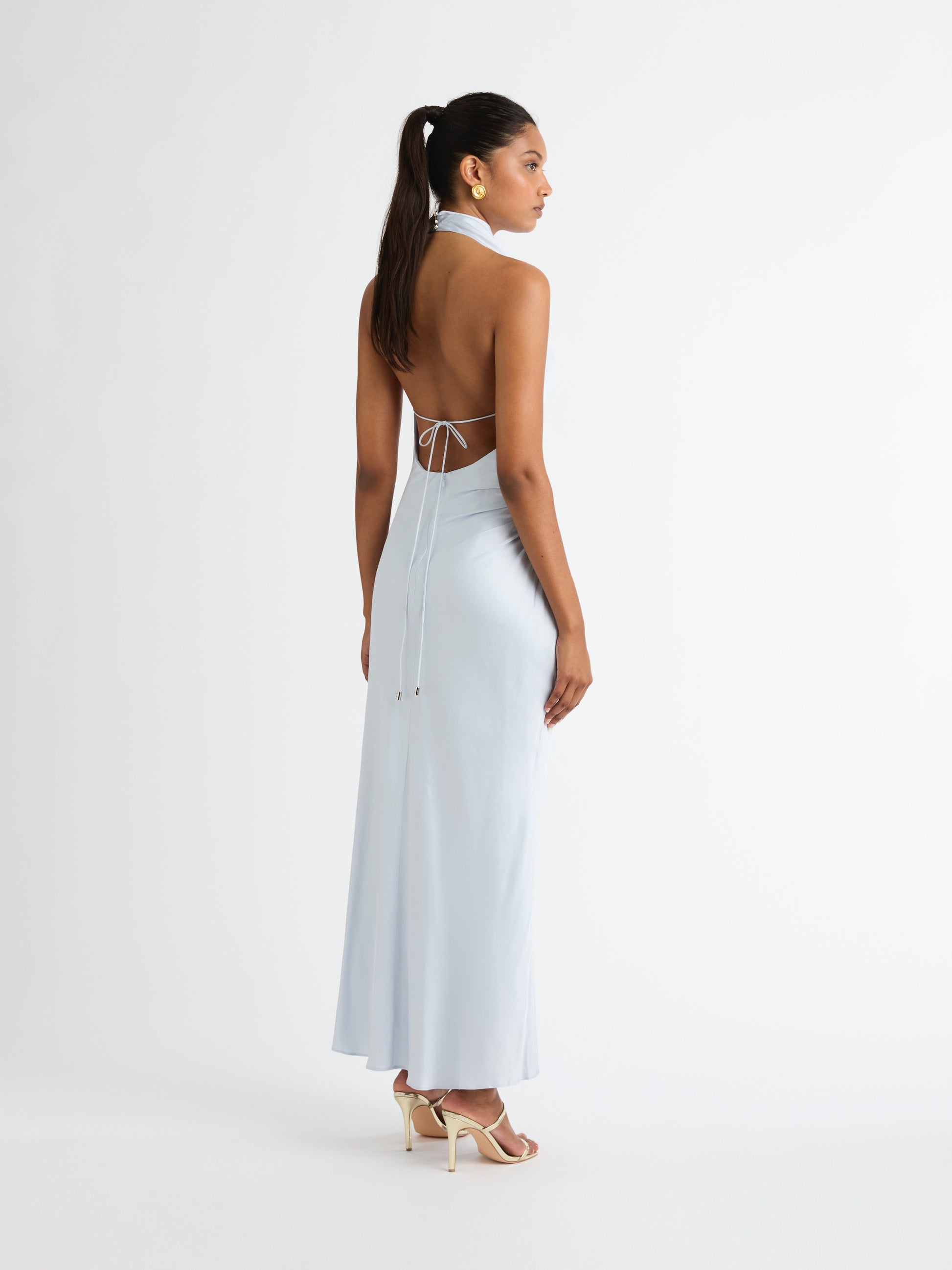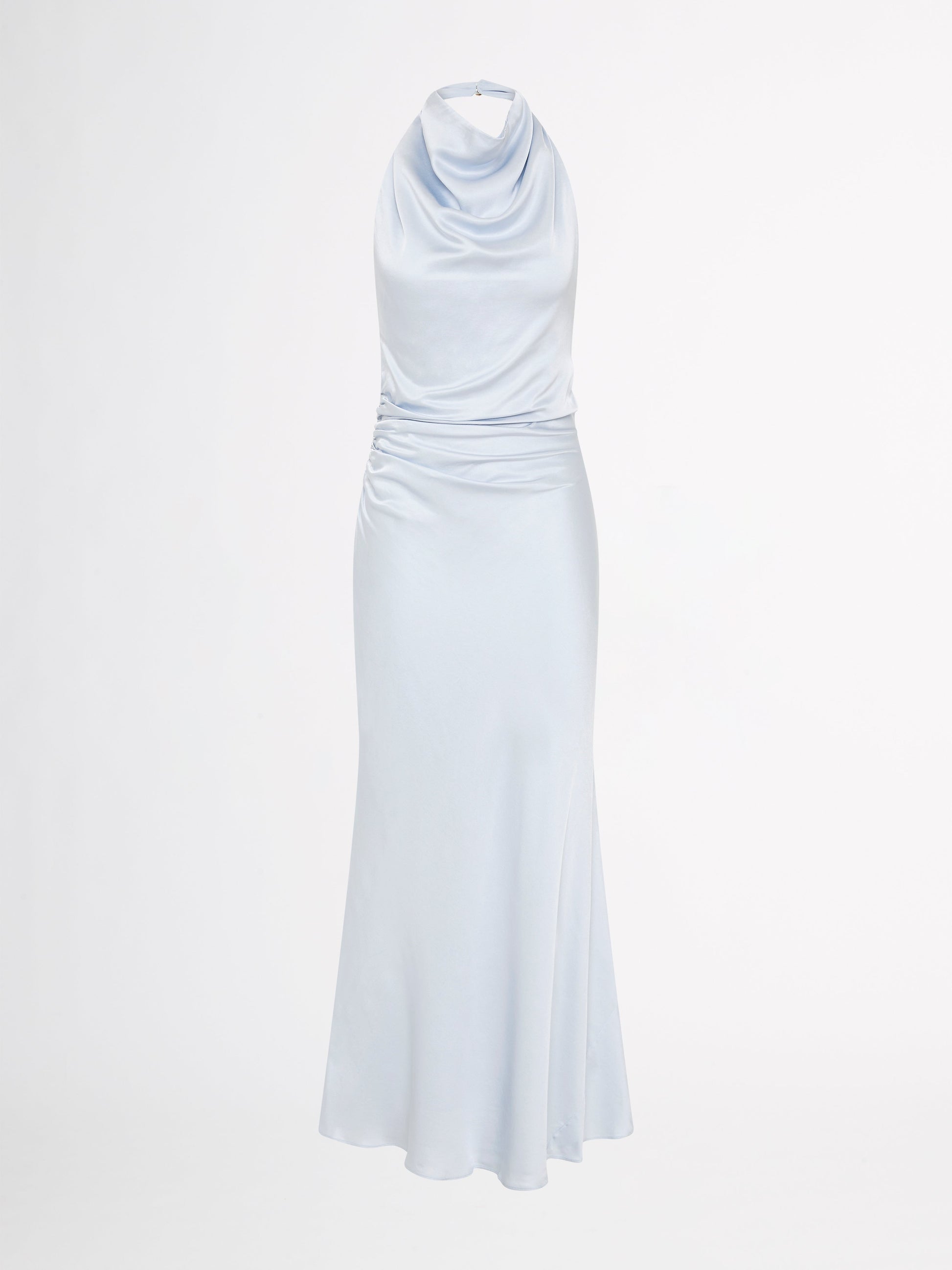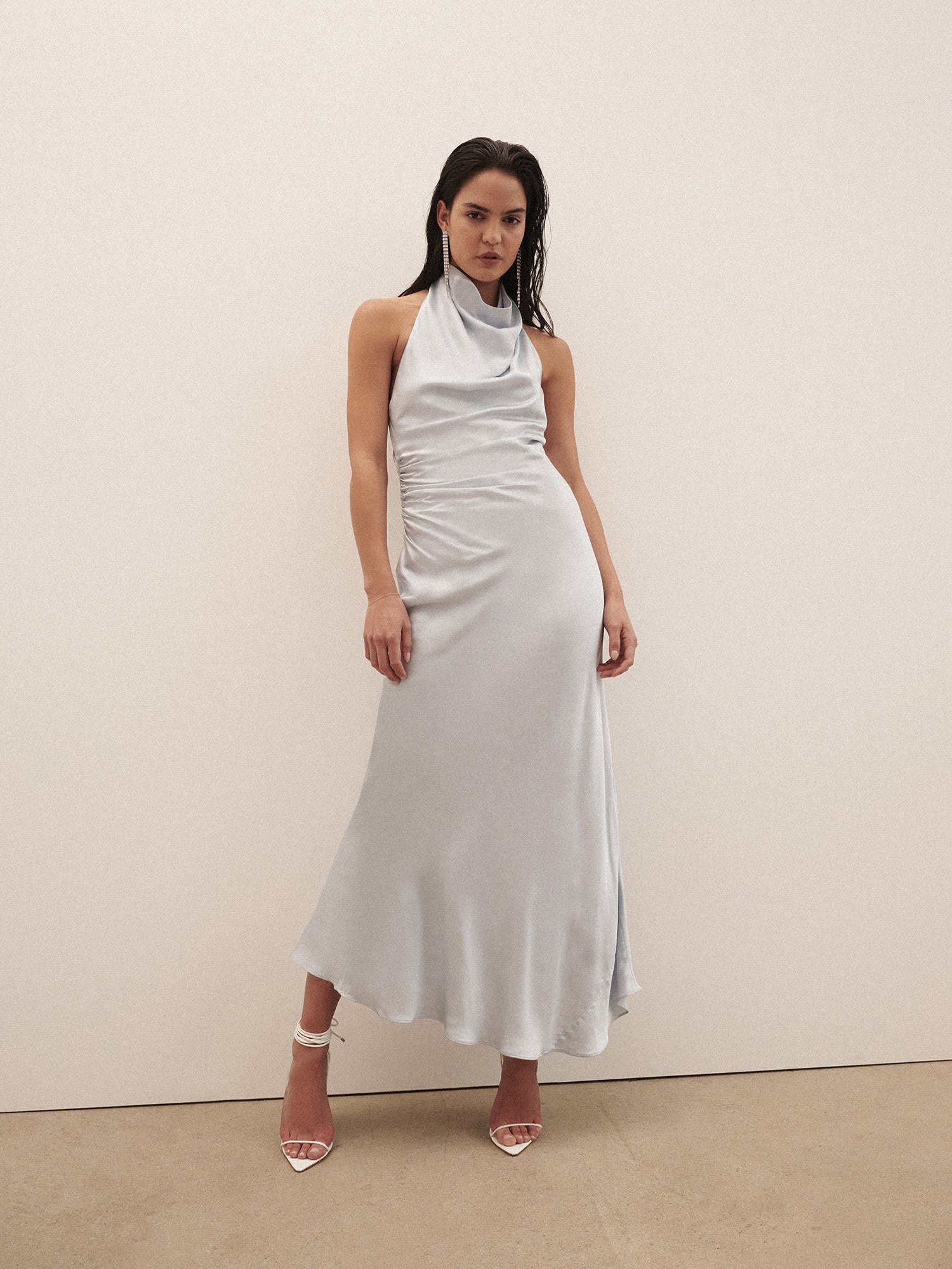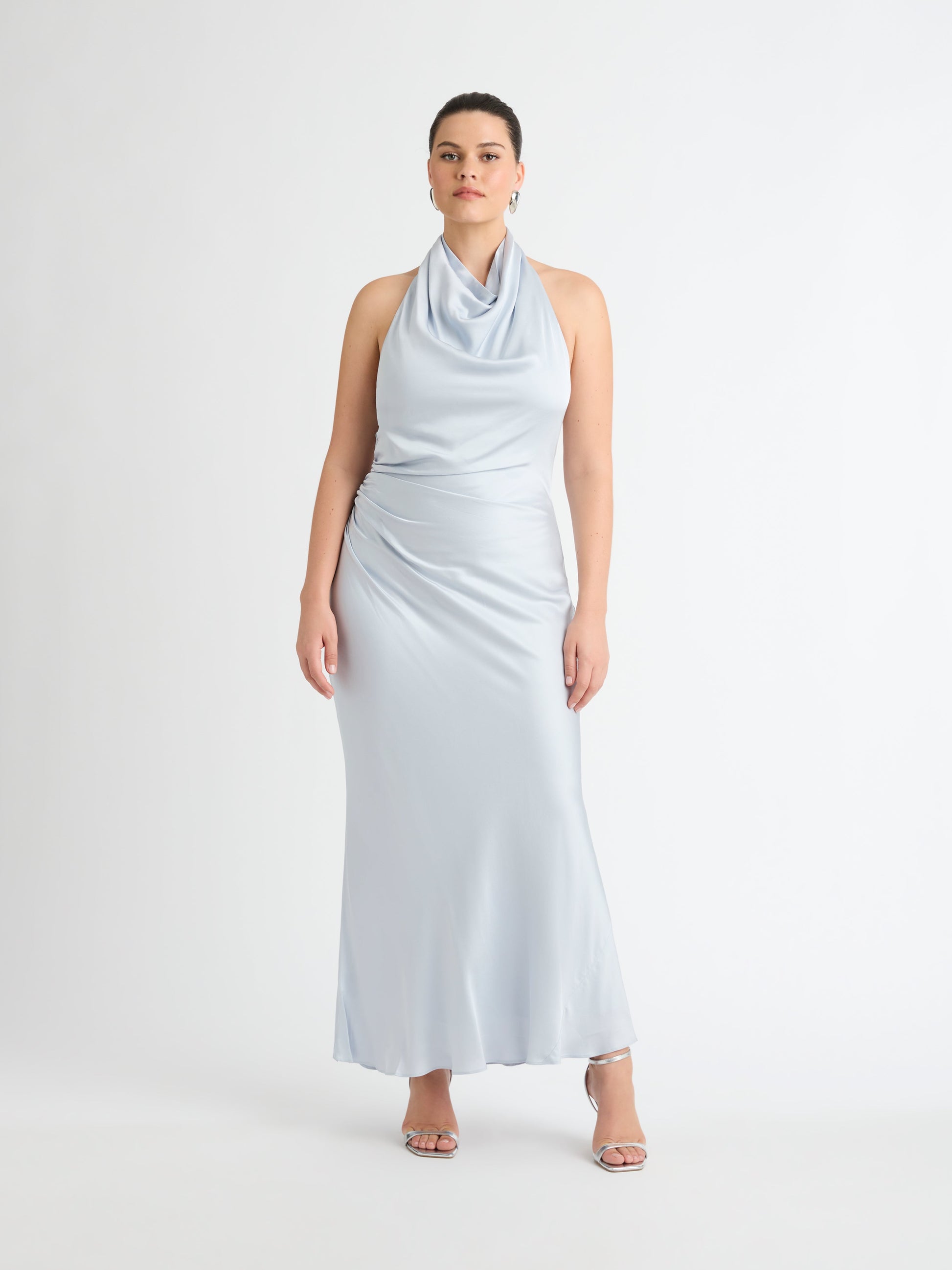 Make your move in the whimsical Jessica Maxi Dress - showcasing a luxe satin fabrication, high front cowl neckline, scoop low back with rouleau strap detail, ruching detail on right side seam and maxi length skirt. Pair with our Audrina Earrings to complete the look.
