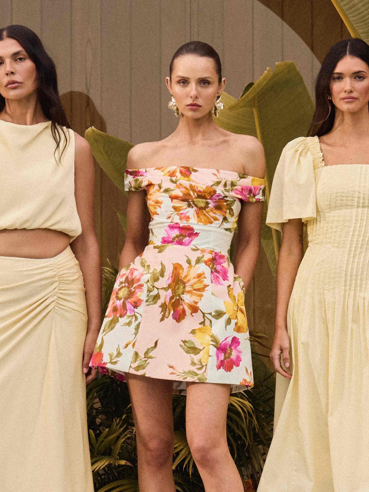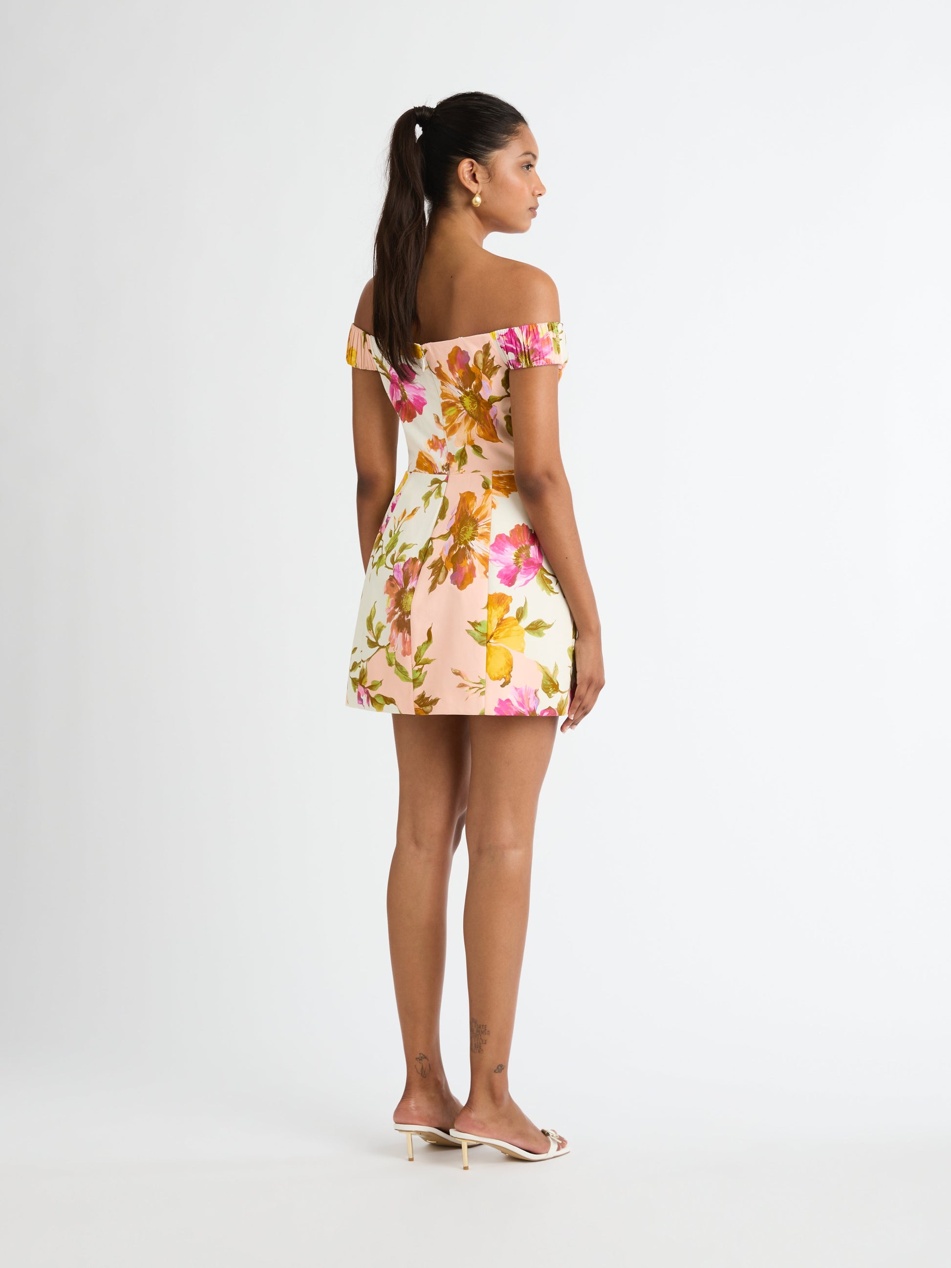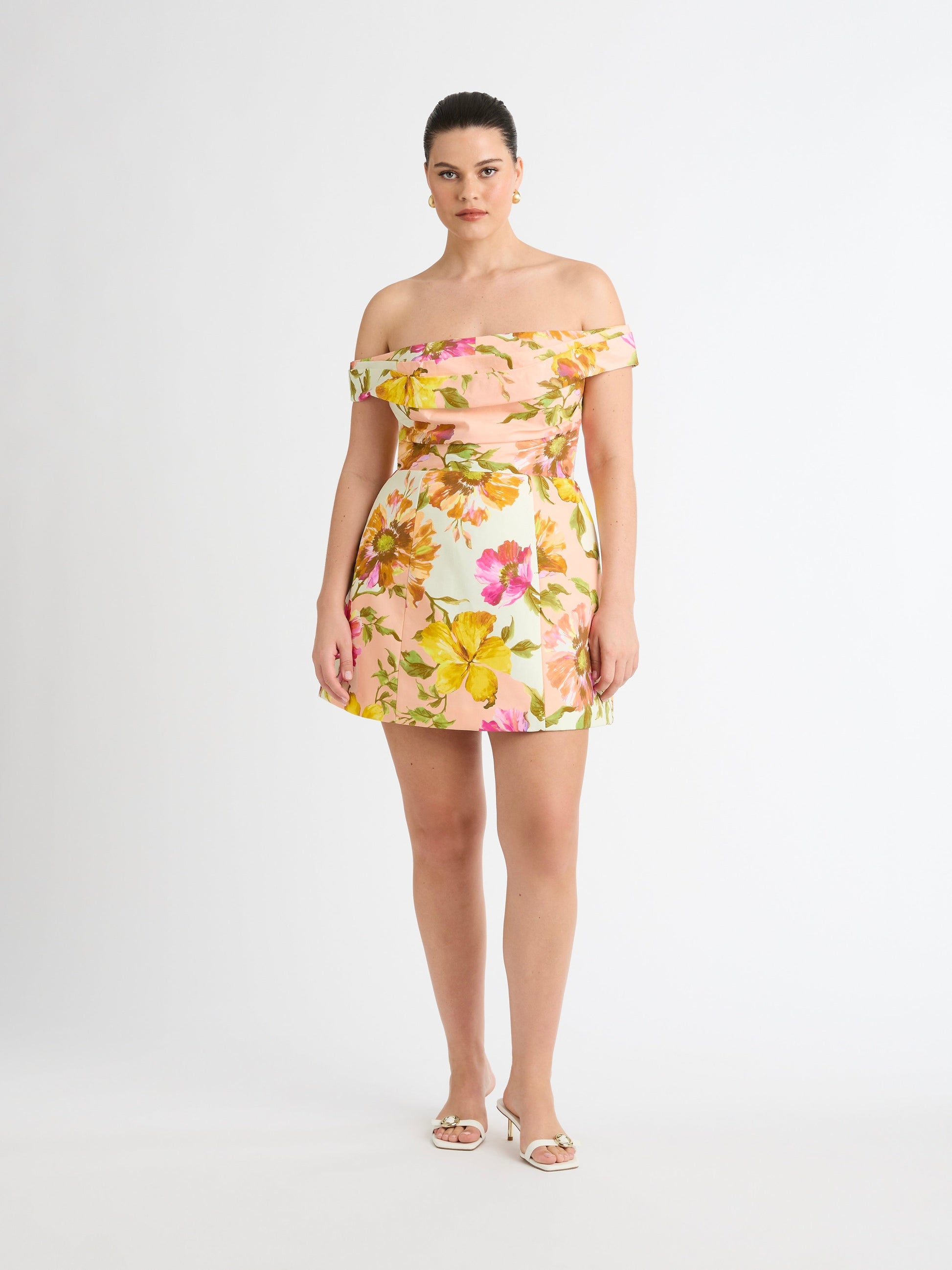 Celebrate floral prints and feminine colourways with the Juliette Mini Dress. Showcasing a floral printed cotton fabrication, straight neckline with off shoulder straps, tucking detail along front neckline and bodice, pockets and A-line mini skirt. Pair with the Raye Earrings to complete the look!