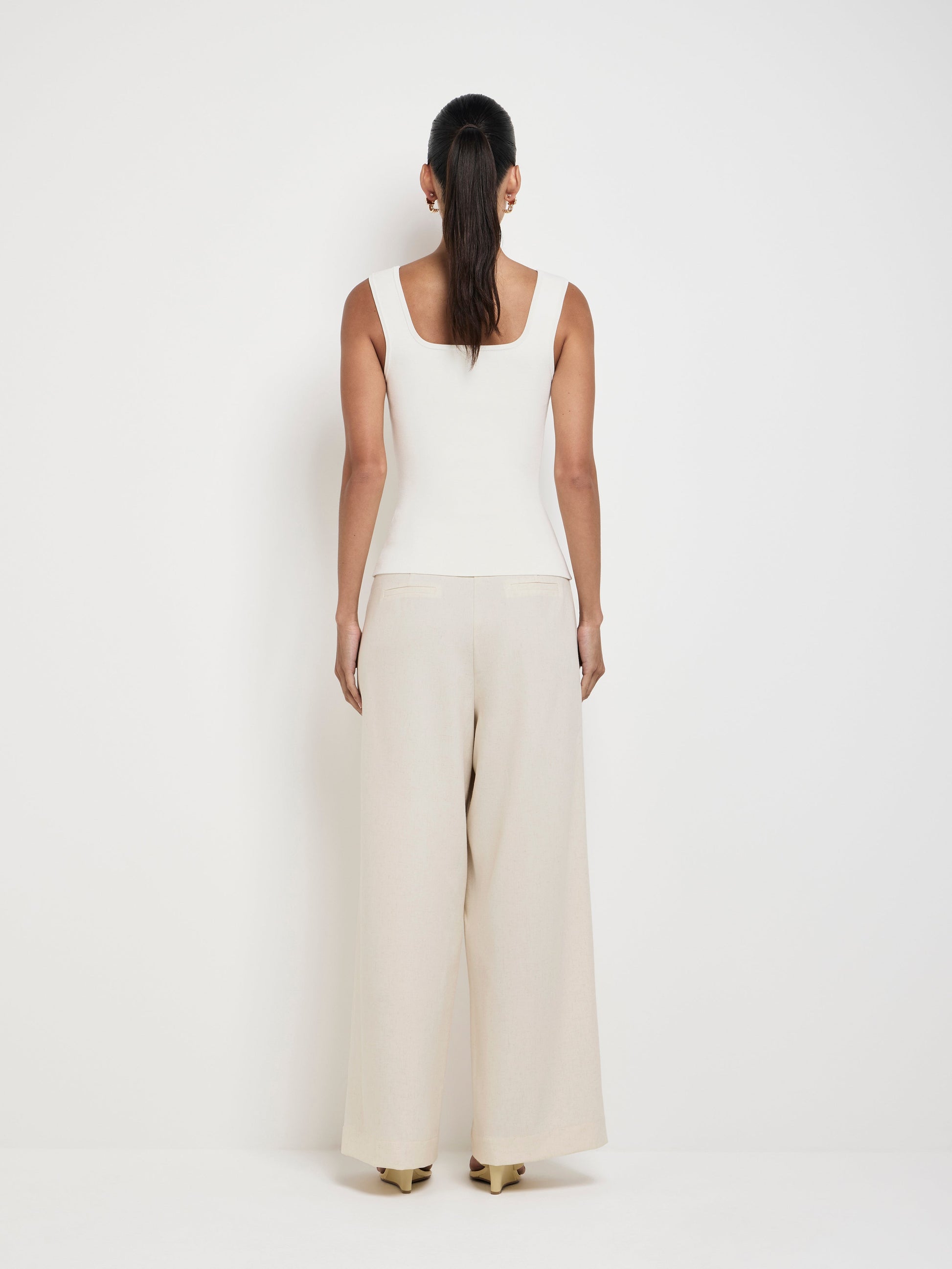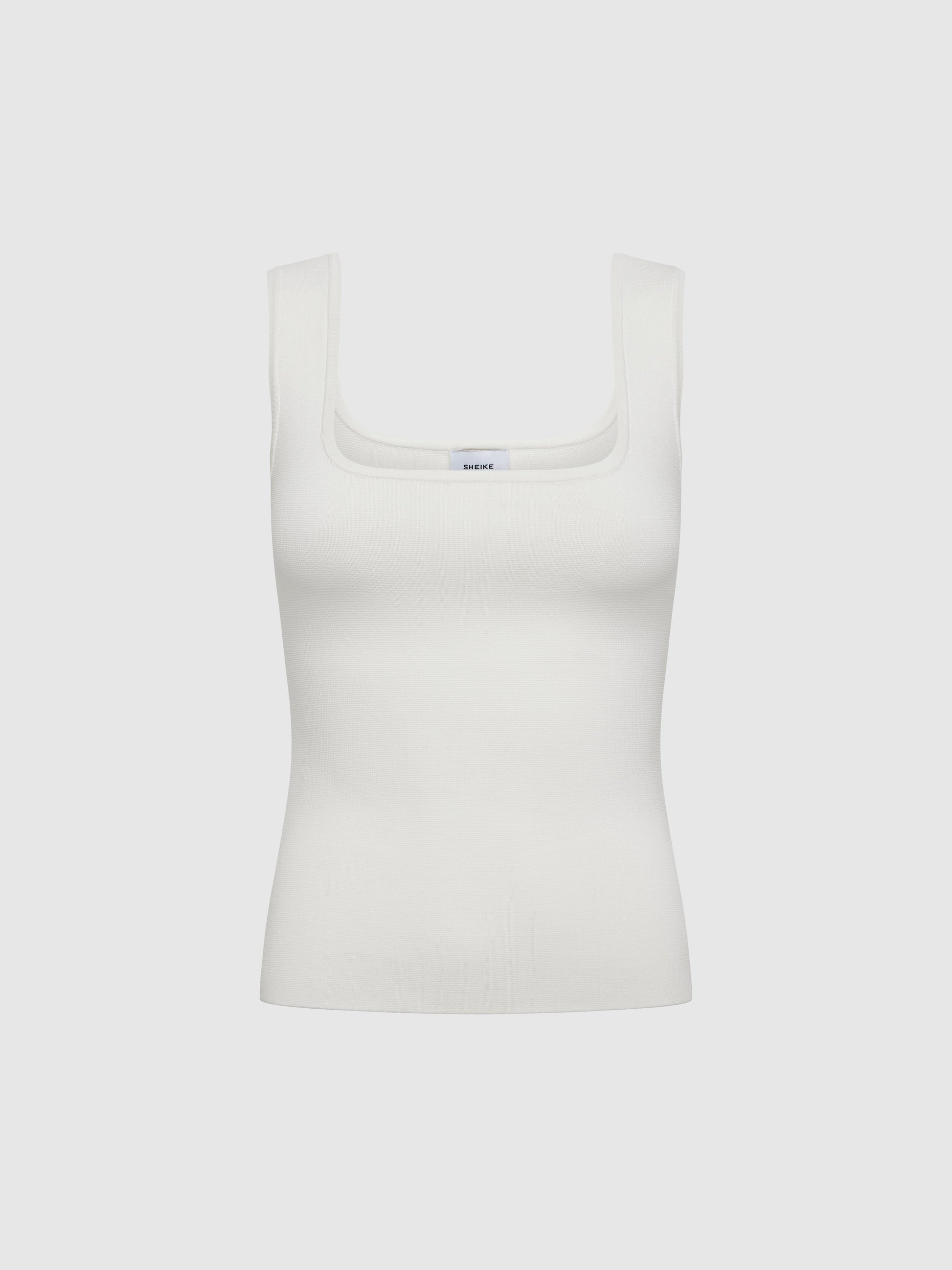 Our Kaia Top is the must have knit top of this Season. Featuring an ivory stretch knit fabrication, soft square neckline, slim fit and sleeveless design. Pair back with our Liaison Pants for the look of the season.