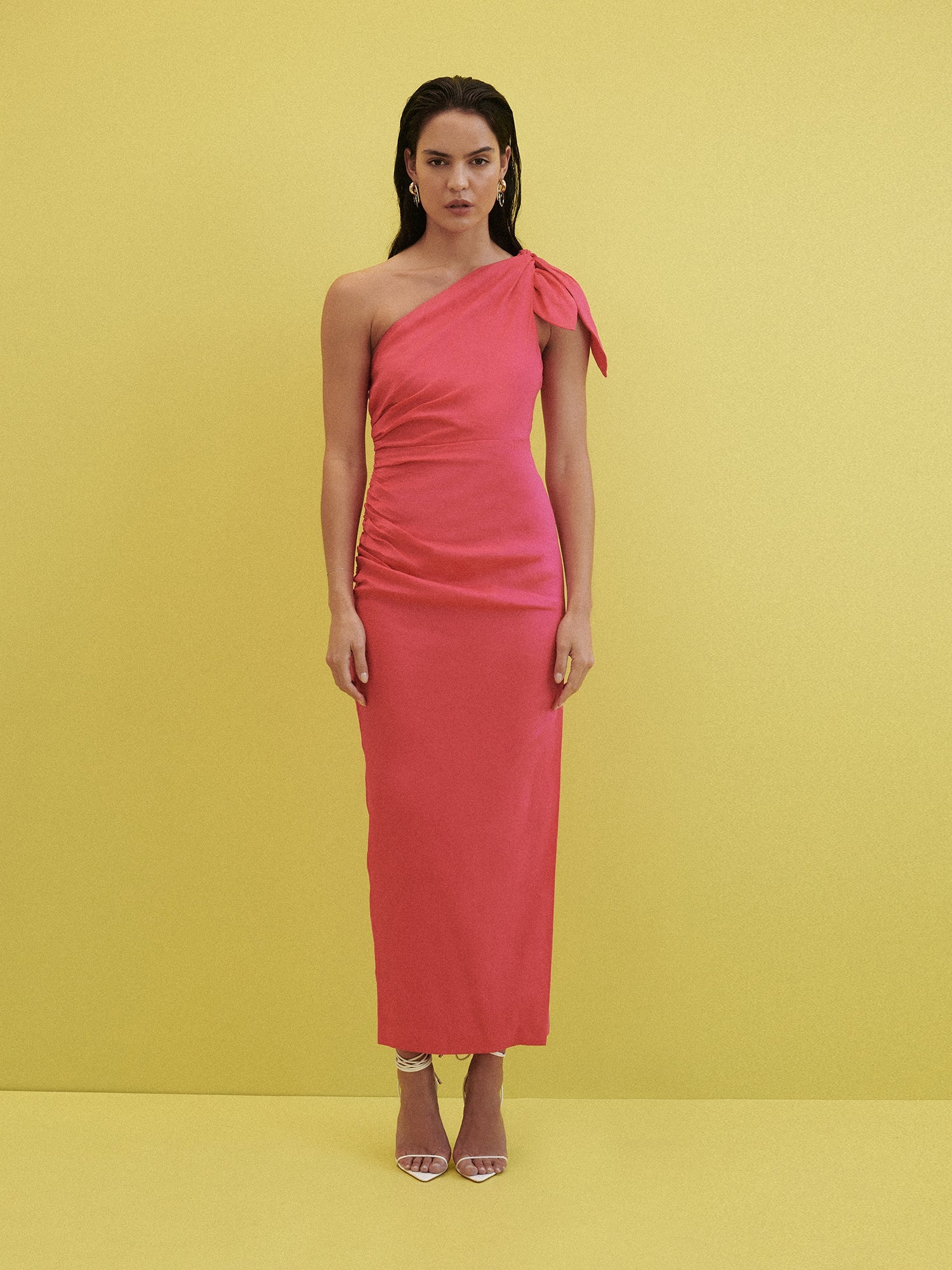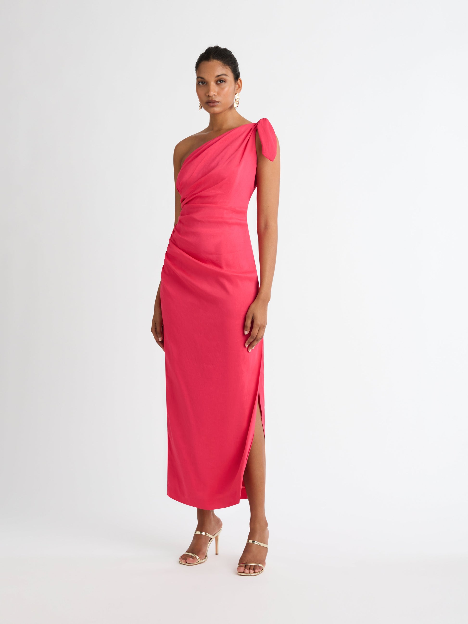 Make a lasting impression in playful Pink. Introducing the Kennedy Dress - showcasing a fitted cut, one shoulder strap with self tying knot and side seam split. Pair with our Renata Earrings to complete the look.