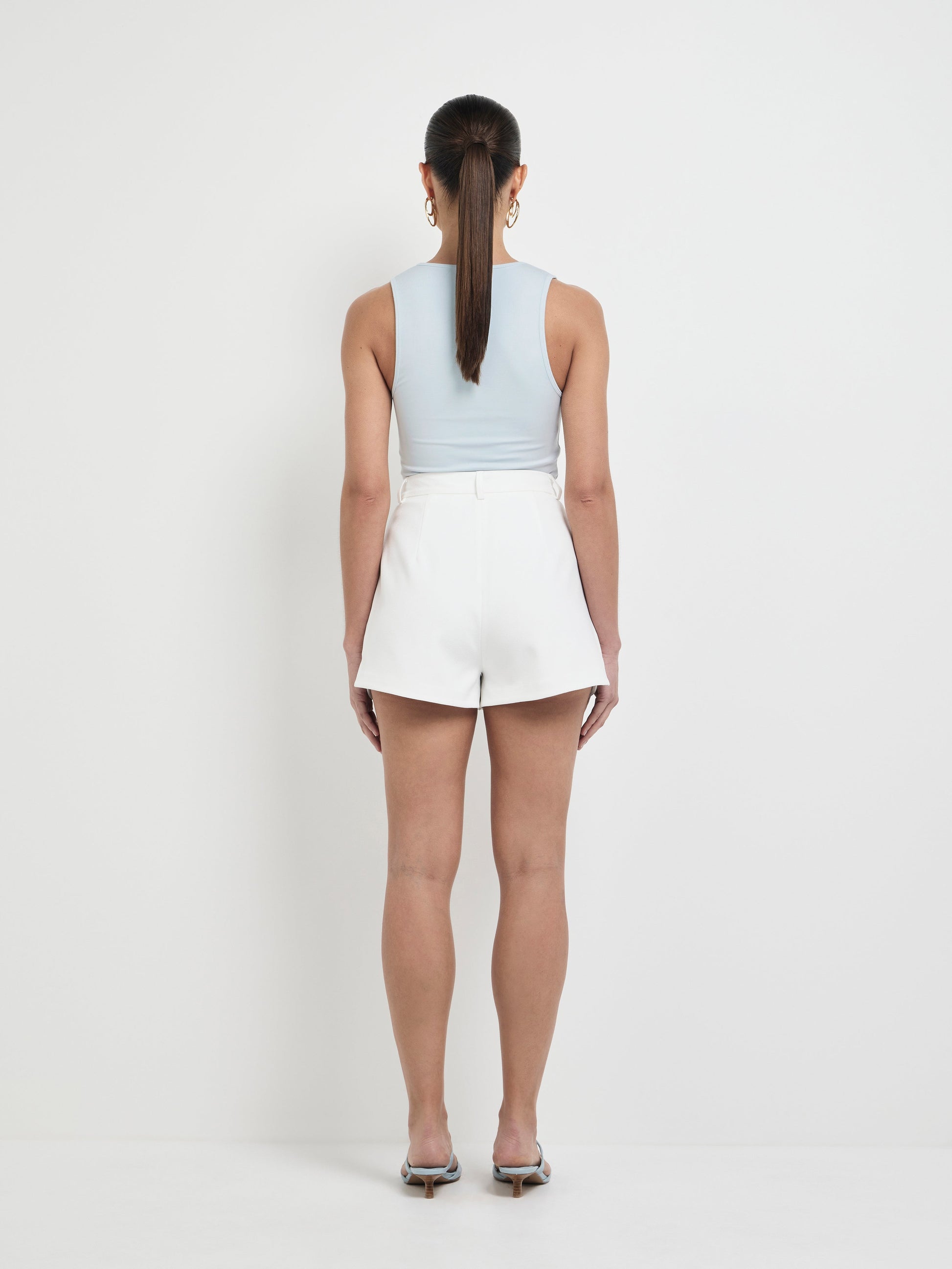 An effortless staple piece to wear on rotation - Introducing the Kiss And Tell Shorts, showcasing a white woven fabrication. slim fit with a fixed waist band, mid rise waist and side seam pockets. Pair with our Tilly Tank to complete the look.
