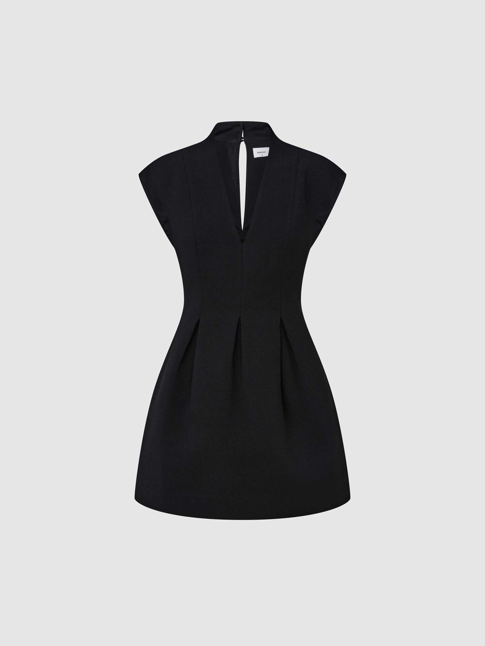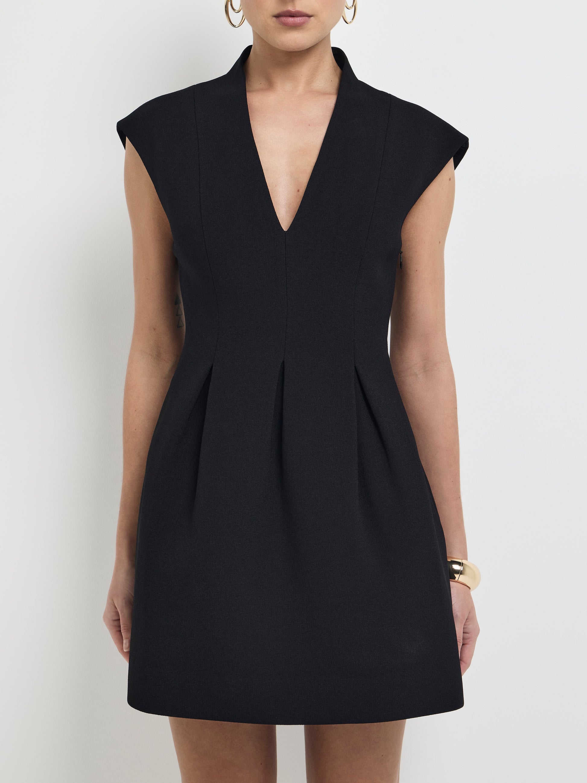 Instilled with elements of exaggerated silhouettes and structured shapes, the Kyla Mini Dress is a power piece designed to stand the test of time. Showcasing a black bonded fabrication, fitted bodice with pleated mini length skirt, plunge V neckline, capped sleeve and crinoline hem. Pair with our Clara Earrings to complete your look!