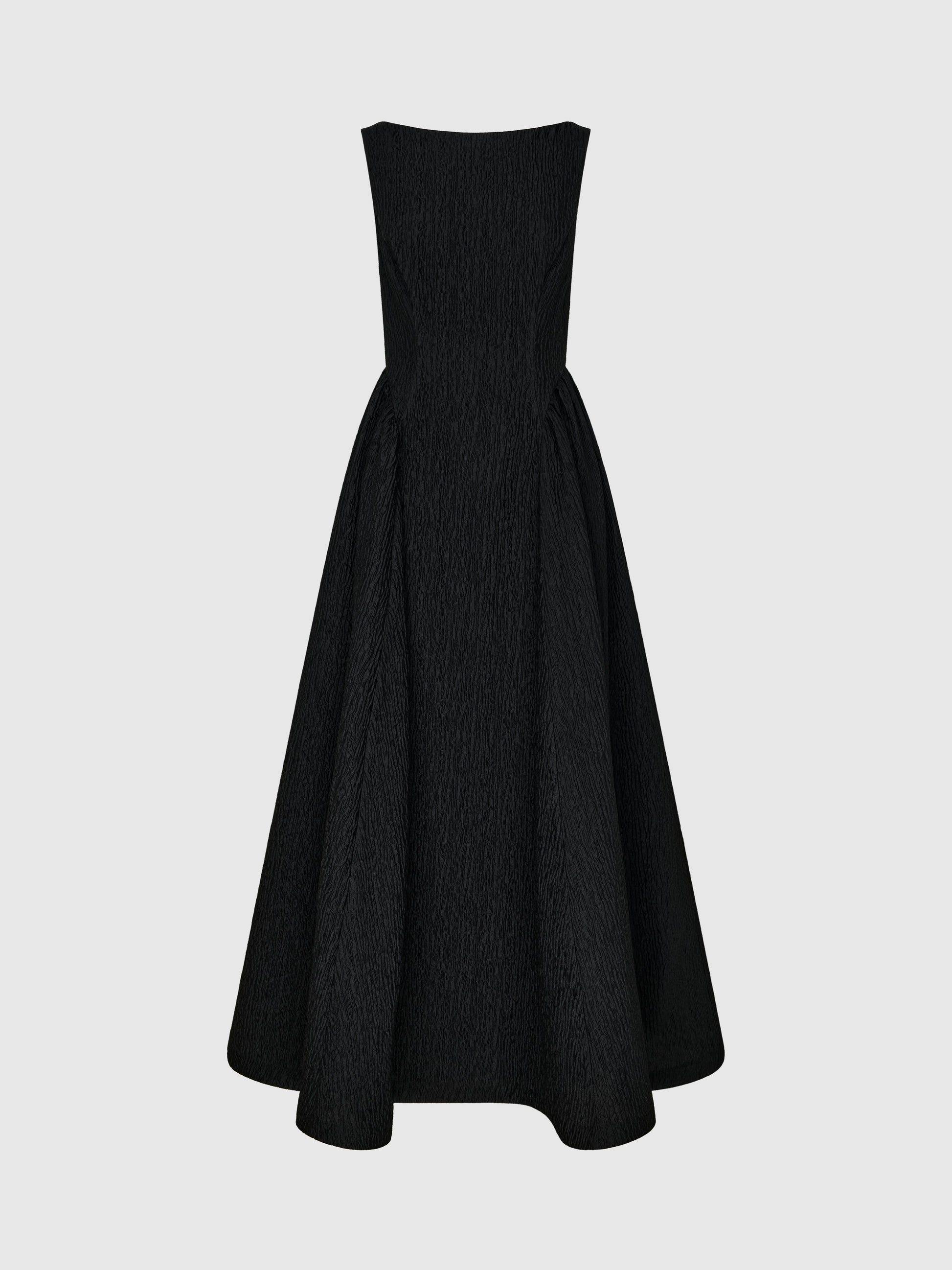 Effortlessly polished, undeniably powerful - Introducing the Lana Maxi Dress. Featuring a black textured fabrication, fitted bodice with full flared maxi skirt, high boat neckline and side seam pockets. Pair with our Anastasia Earrings to complete the look.