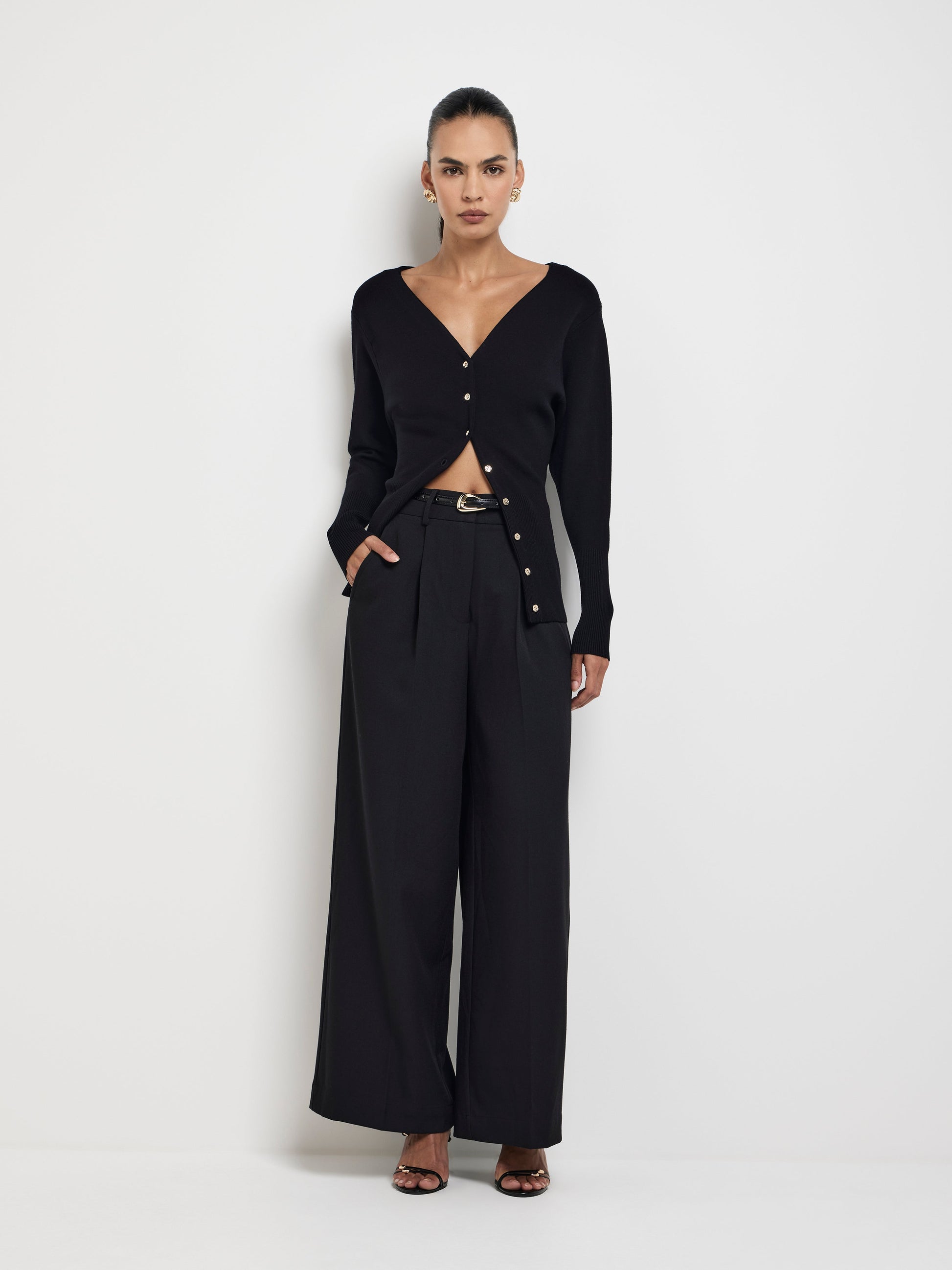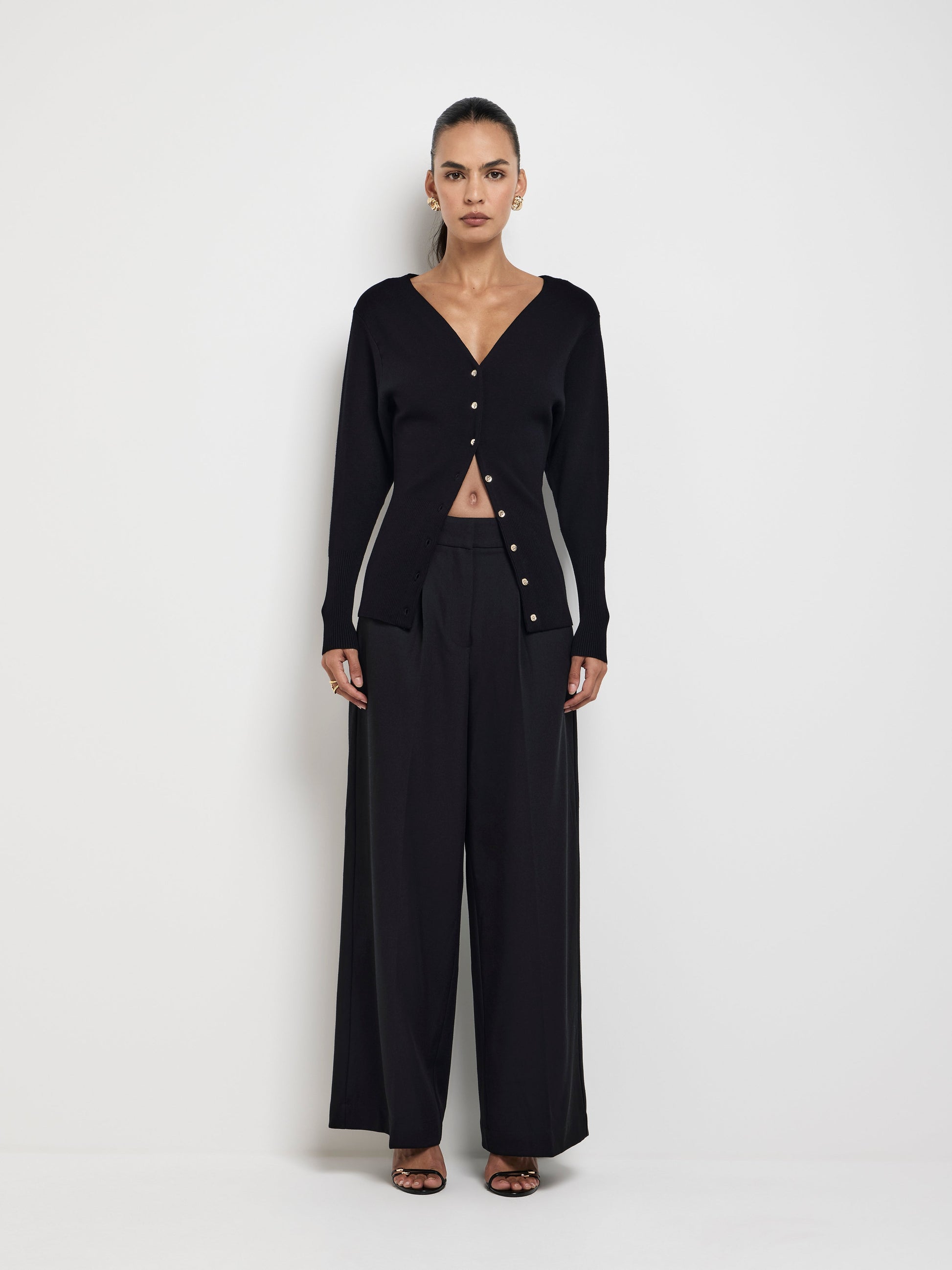 Elevate the everyday with a cardigan that refuses to blend in - Introducing the Layla Cardigan. Showcasing a timeless black knit fabrication, front button closure, long sleeves and ribbed hem and cuff. Pair with our Liaison Pant to complete the look.