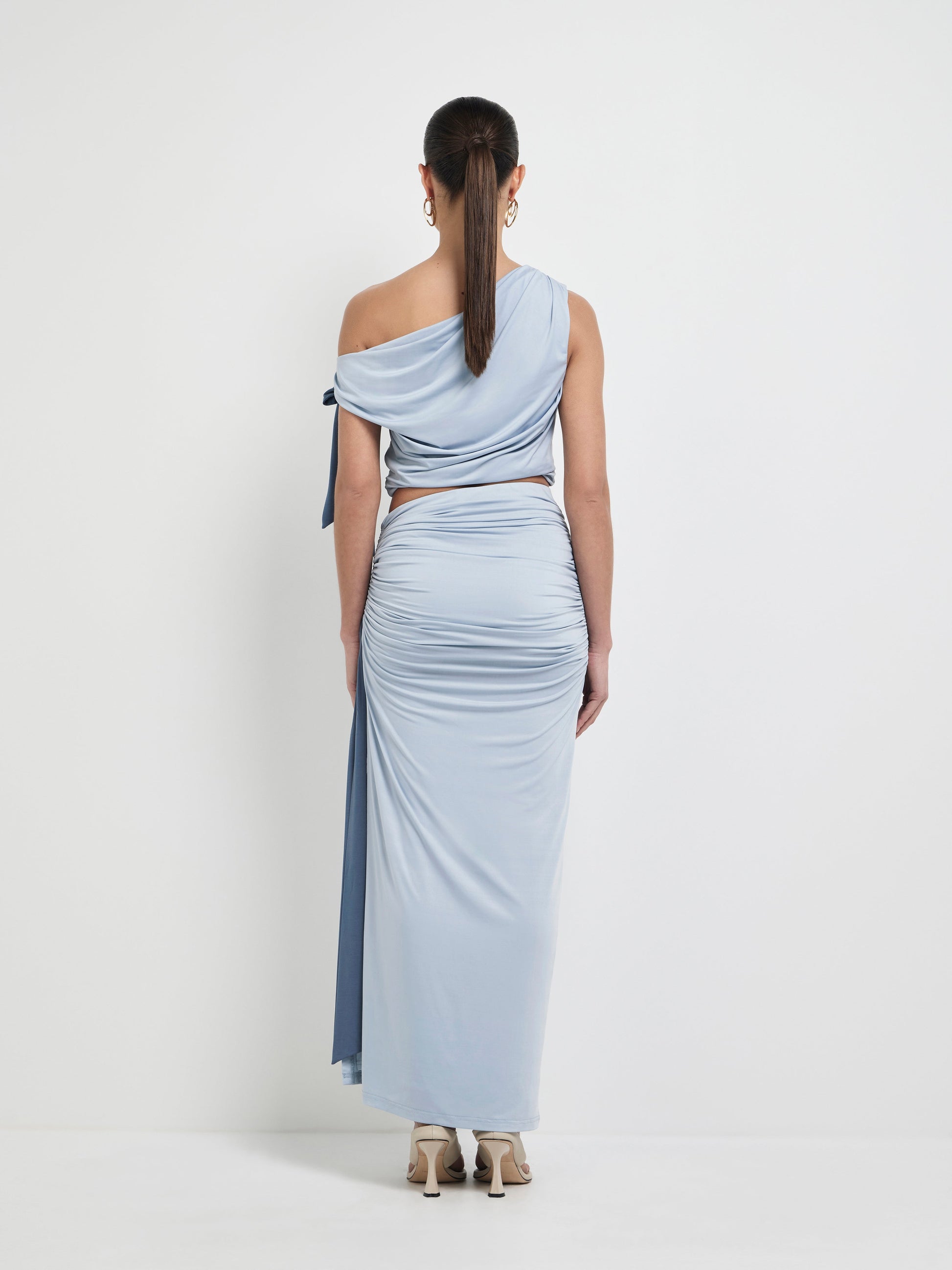 Designed for those day to night moments in the Spring months. Introducing the Leon Midi Skirt - Showcasing a blue stretch jersey fabrication, fitted styling, elasticated waistband, contrast tie detail on side, midi/maxi length skirt and side seam split. Pair with our matching Leon Top to complete the look.