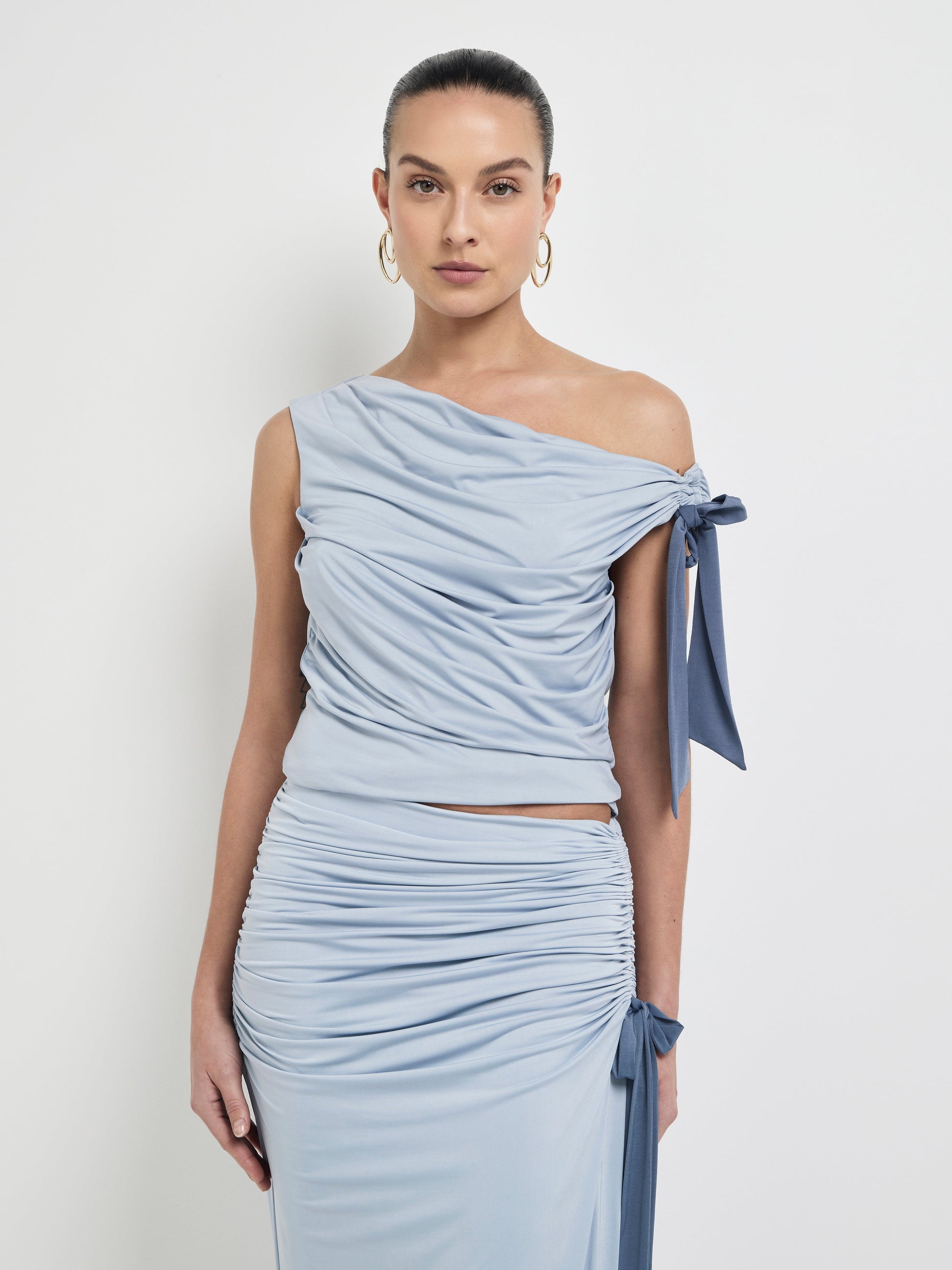 Designed for those day to night moments in the Spring months. Introducing the Leon Top - Showcasing a blue stretch jersey fabrication, draped off shoulder neckline, tucks at shoulder and side seam and tie shoulder detail. Pair with our matching Leon Midi Skirt to complete the look.