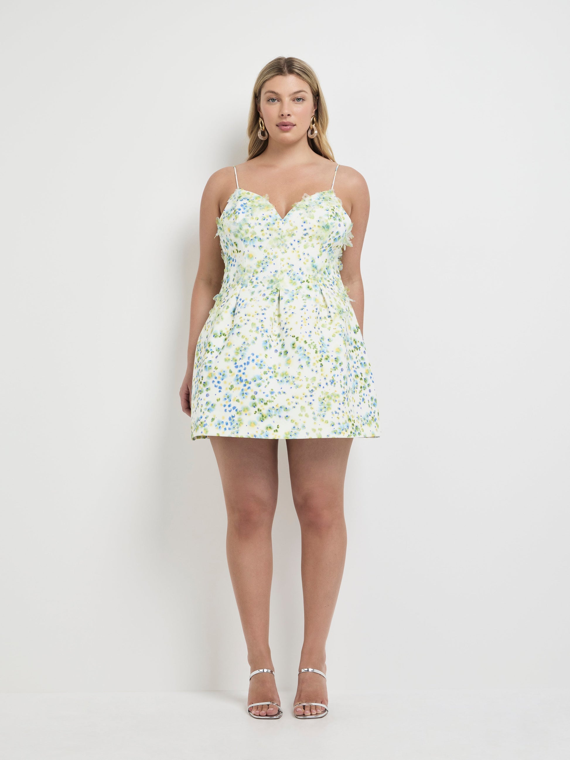 Effortless Romance - Introducing the Lily Mini Dress. Featuring a bonded floral print fabrication, thin straps, fitted bodice with pleated skirt, V neckline, floral trim at bodice and mini skirt length. Style with our Poppy Earrings to complete the look.