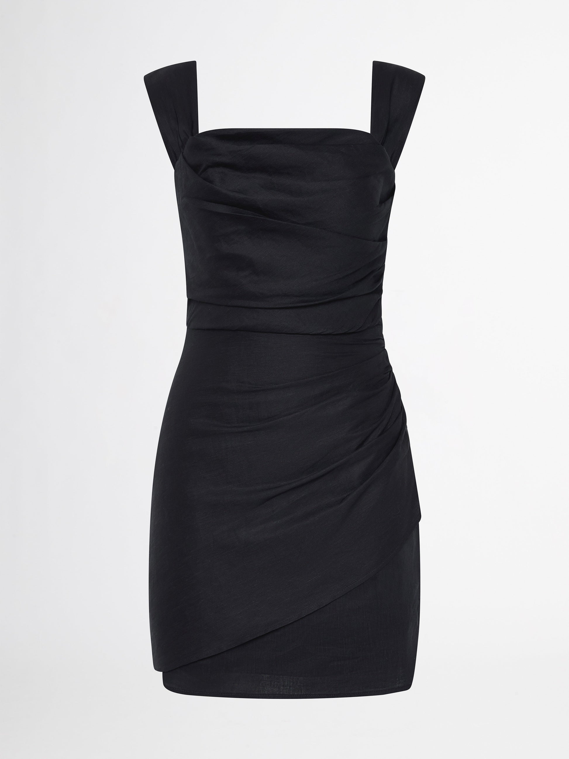 Introducing the perfect little black dress - Loren Mini Dress. Showcasing a black linen blend fabrication, slim fit cut, wide gathered straps, straight neckline, mini skirt length, overlay skirt detail and rouching detail on bodice and hips. Pair with our Simmie Earrings to complete the look.