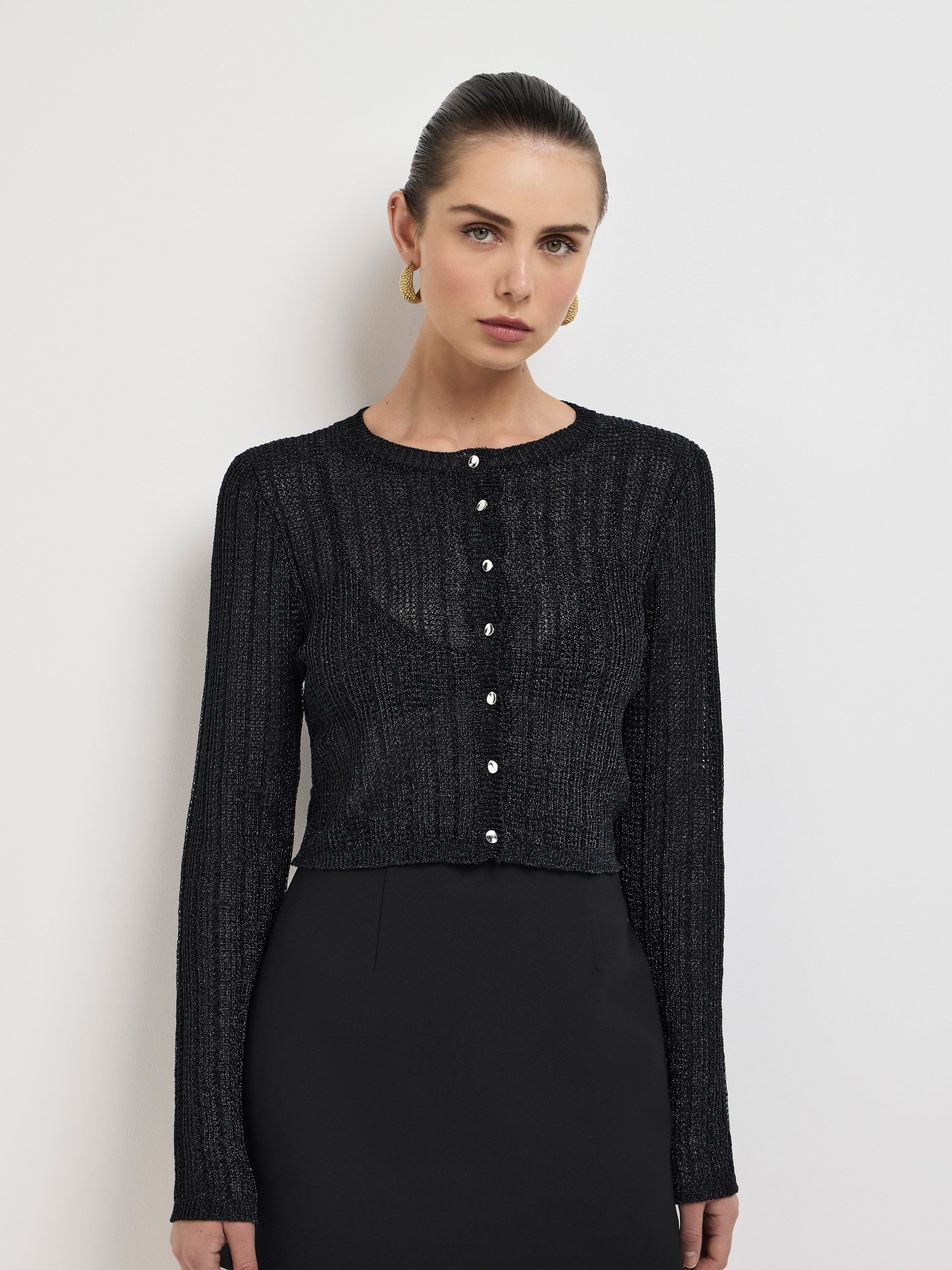 A timeless black knit with a touch of shimmer. Introducing the Lotty Knit featuring a true knit metallic blend fabrication, button up front, long sleeves, relaxed crop styling and rib band on neckline, hem and sleeves. Pair with the Nour Skirt to complete the look.