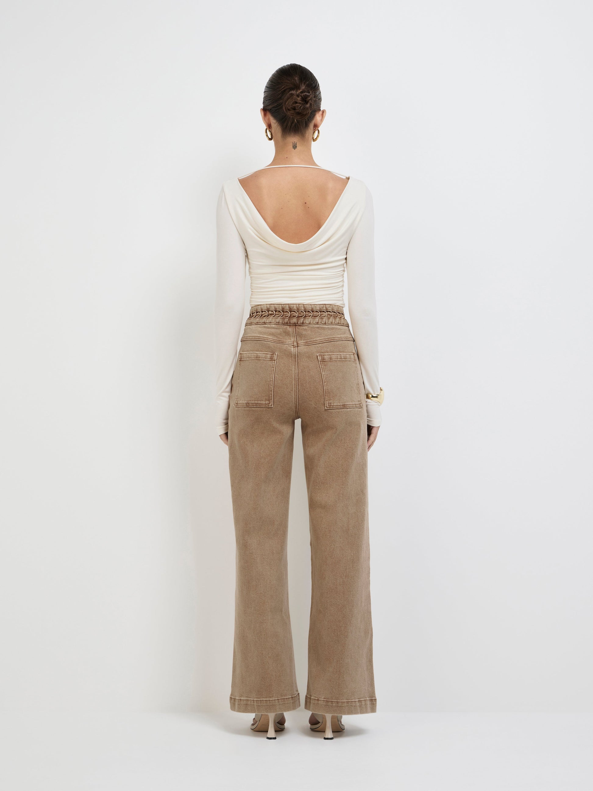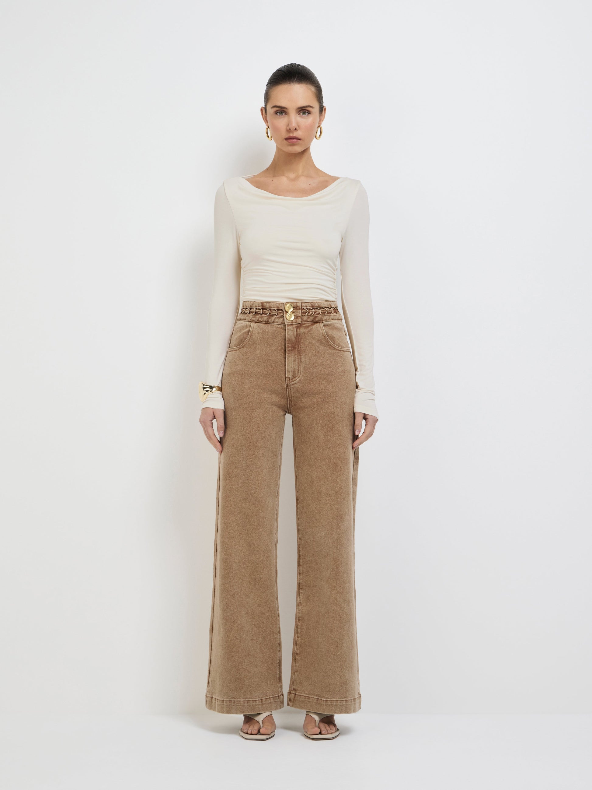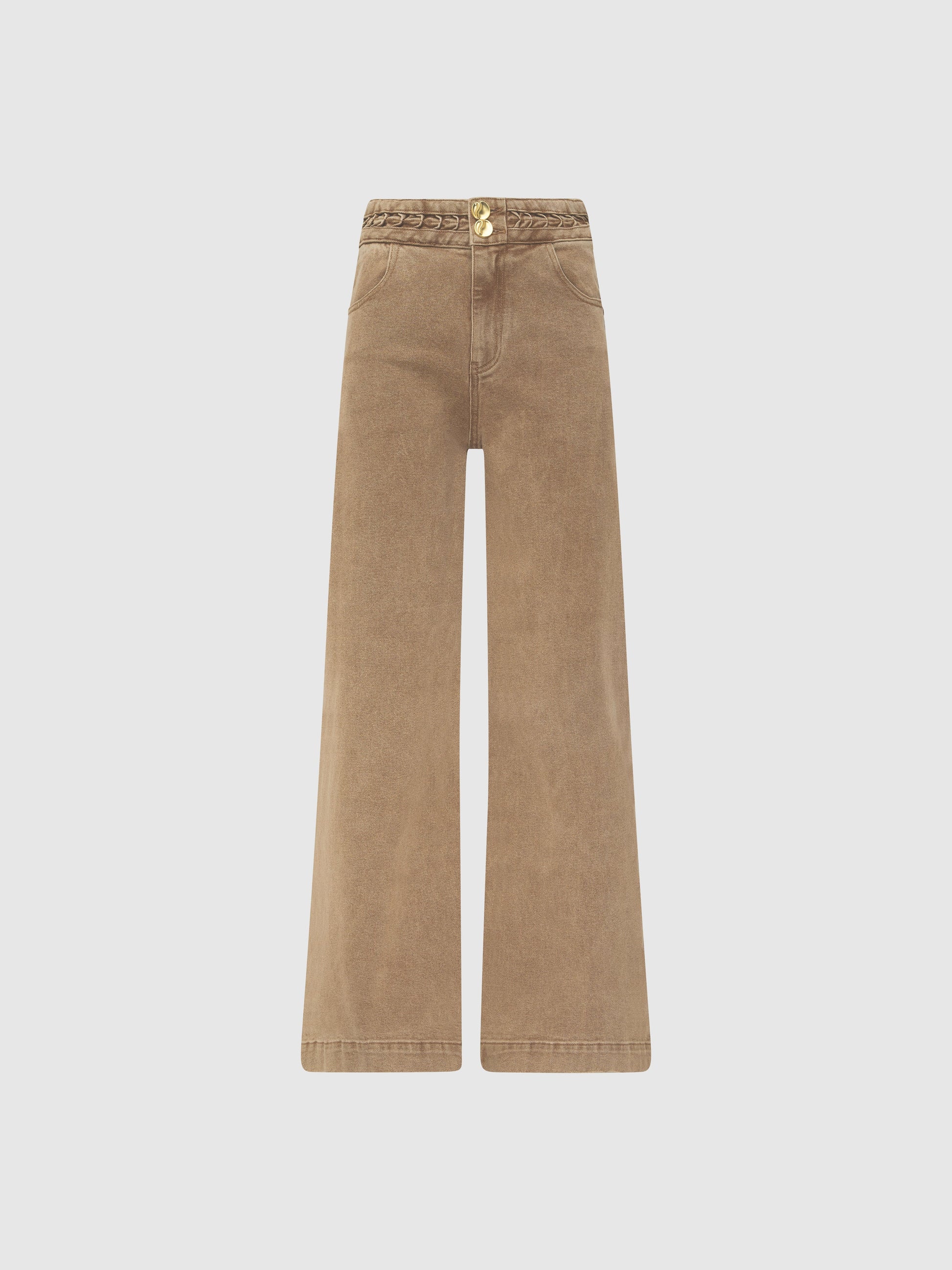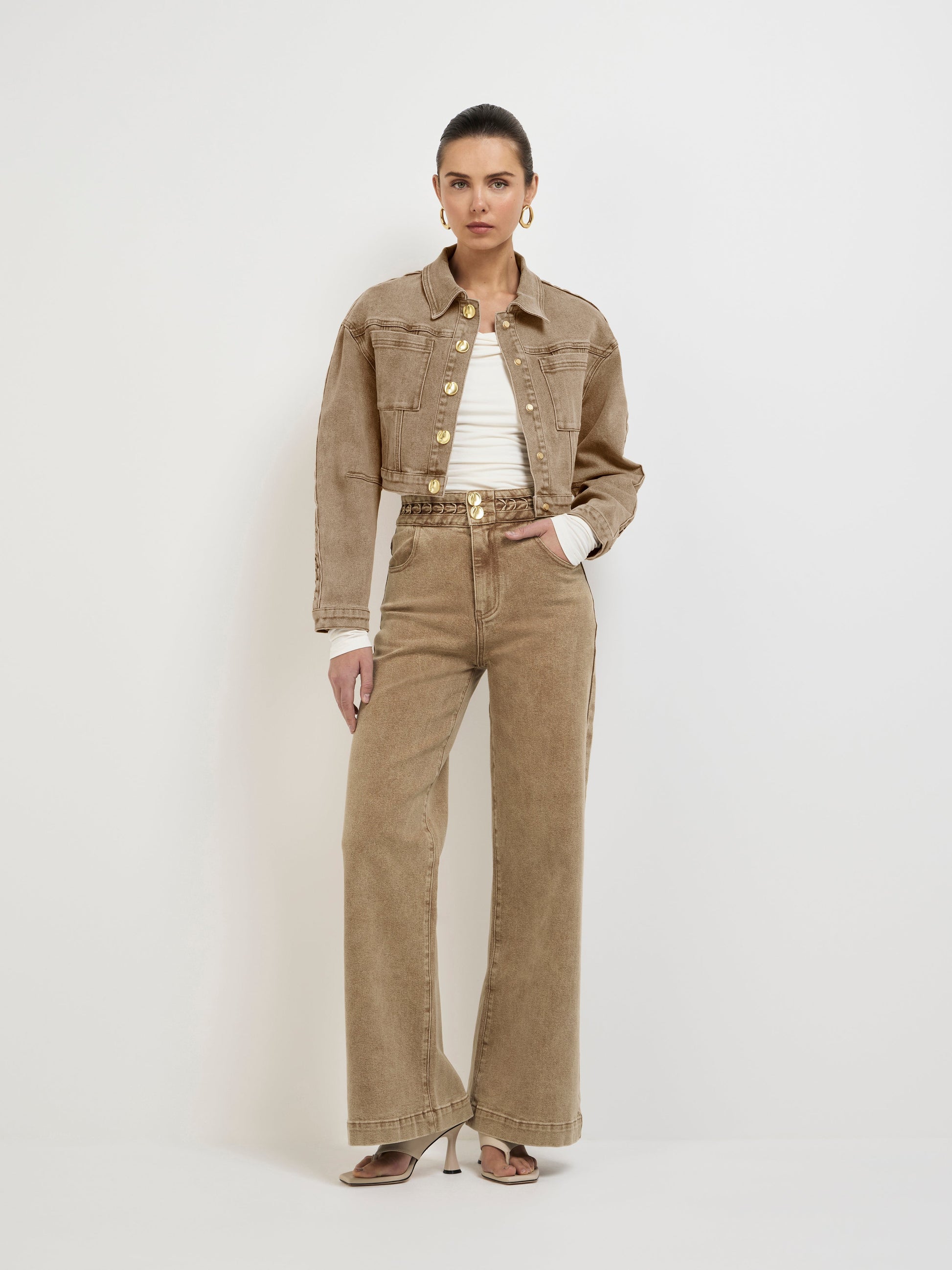 A neutral with standout status - Introducing the Lucie Jean. Showcasing a sand toned stretch denim fabrication, fitted styling, wide leg, braided trim on waistband and pockets front and back. Pair with our Martina Top and matching Lucie Denim Jacket to complete the look.