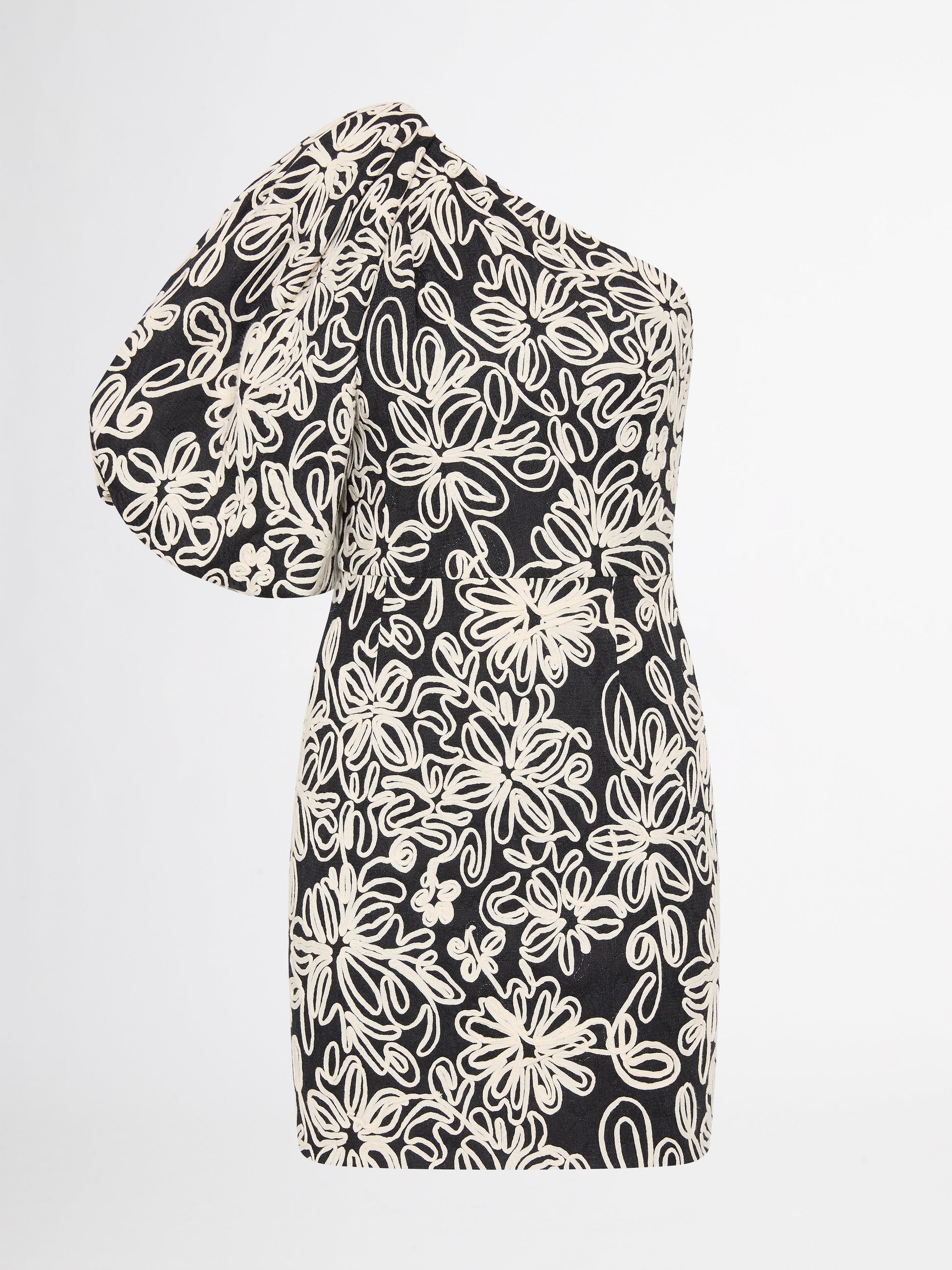 Embrace playful textures with our Luisa Mini Dress. Showcasing a floral embroidered fabrication, fitted styling, mini skirt, one shoulder short puff sleeve and tucks along neckline. Pair with our Vanessa Earrings to complete the look.