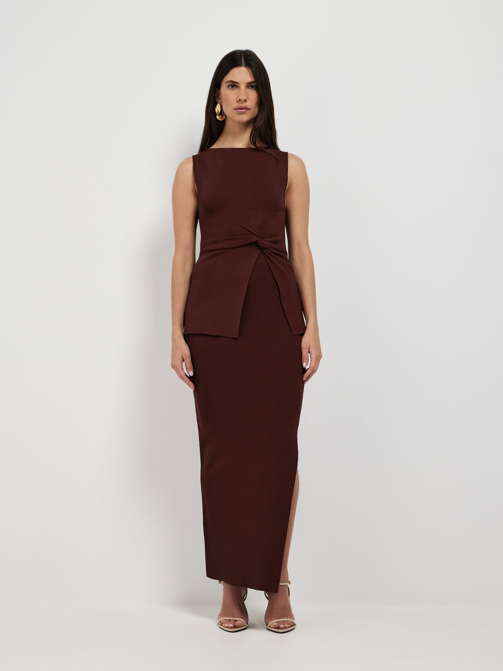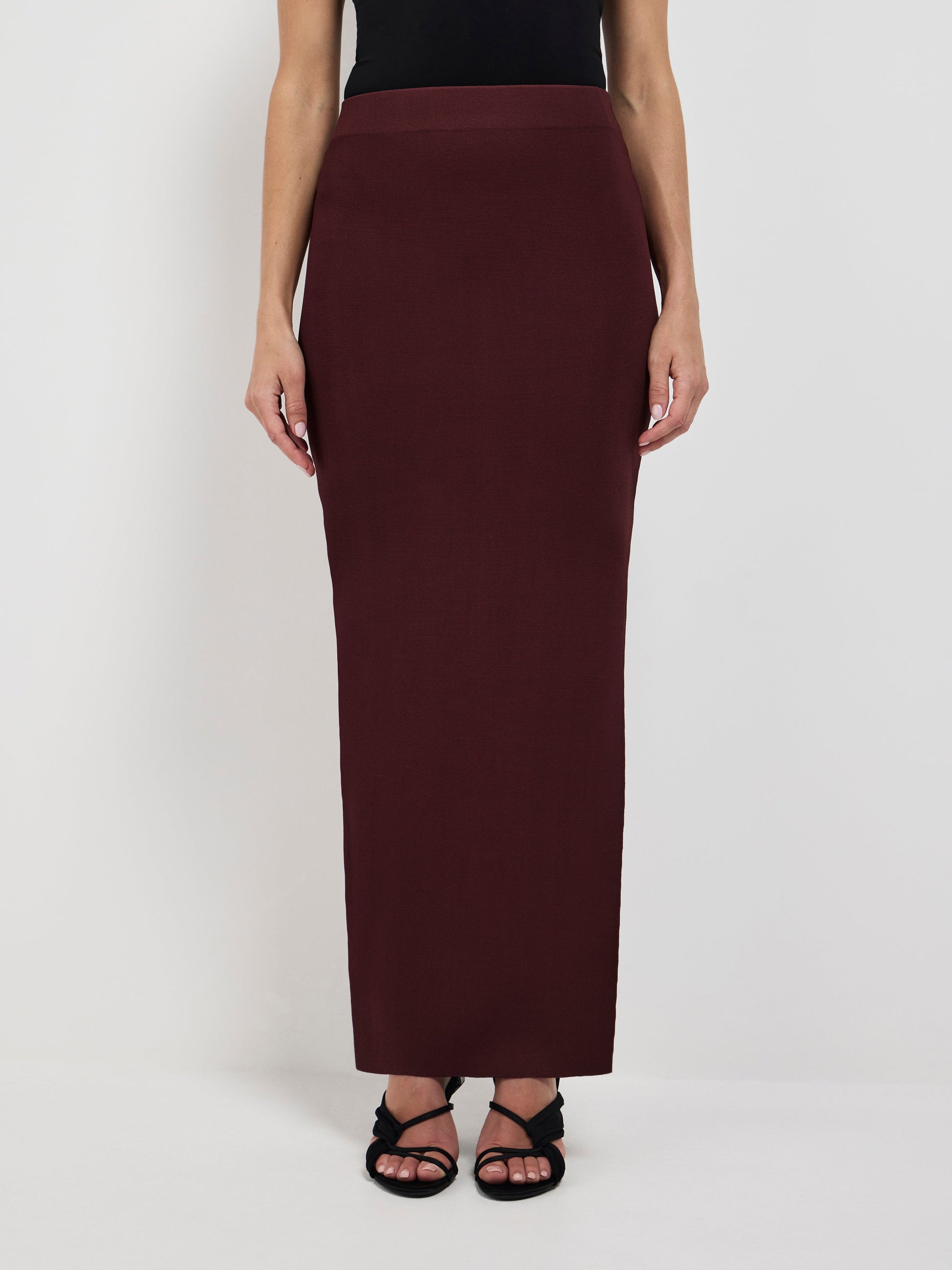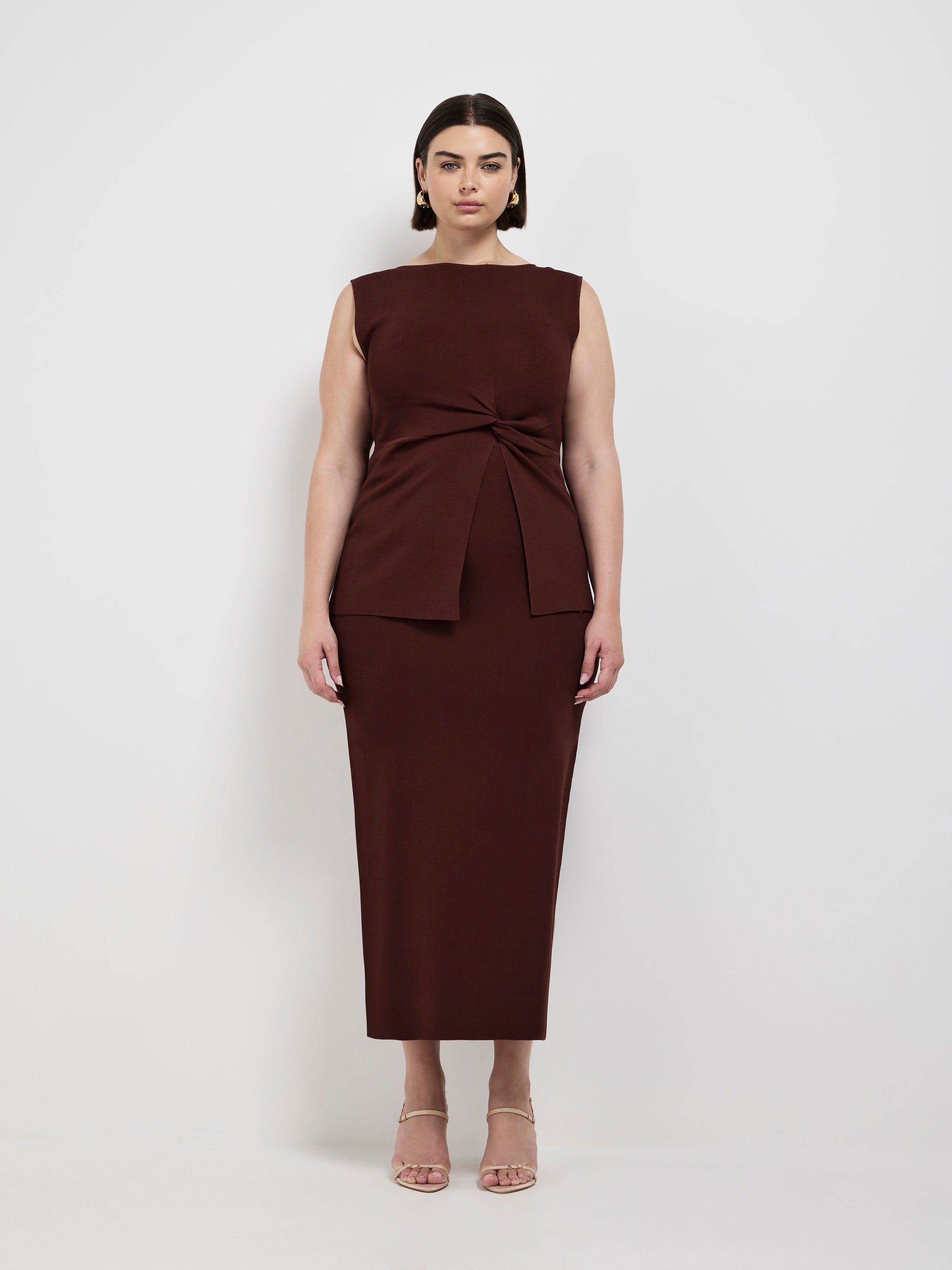 Sharp, stylish, and endlessly versatile - Introducing the Maci Knit Skirt. Showcasing a brown knit fabrication, fitted styling, elasticated waistband, side seam split and midi length. Pair with our matching Maci Knit Top to complete the look.