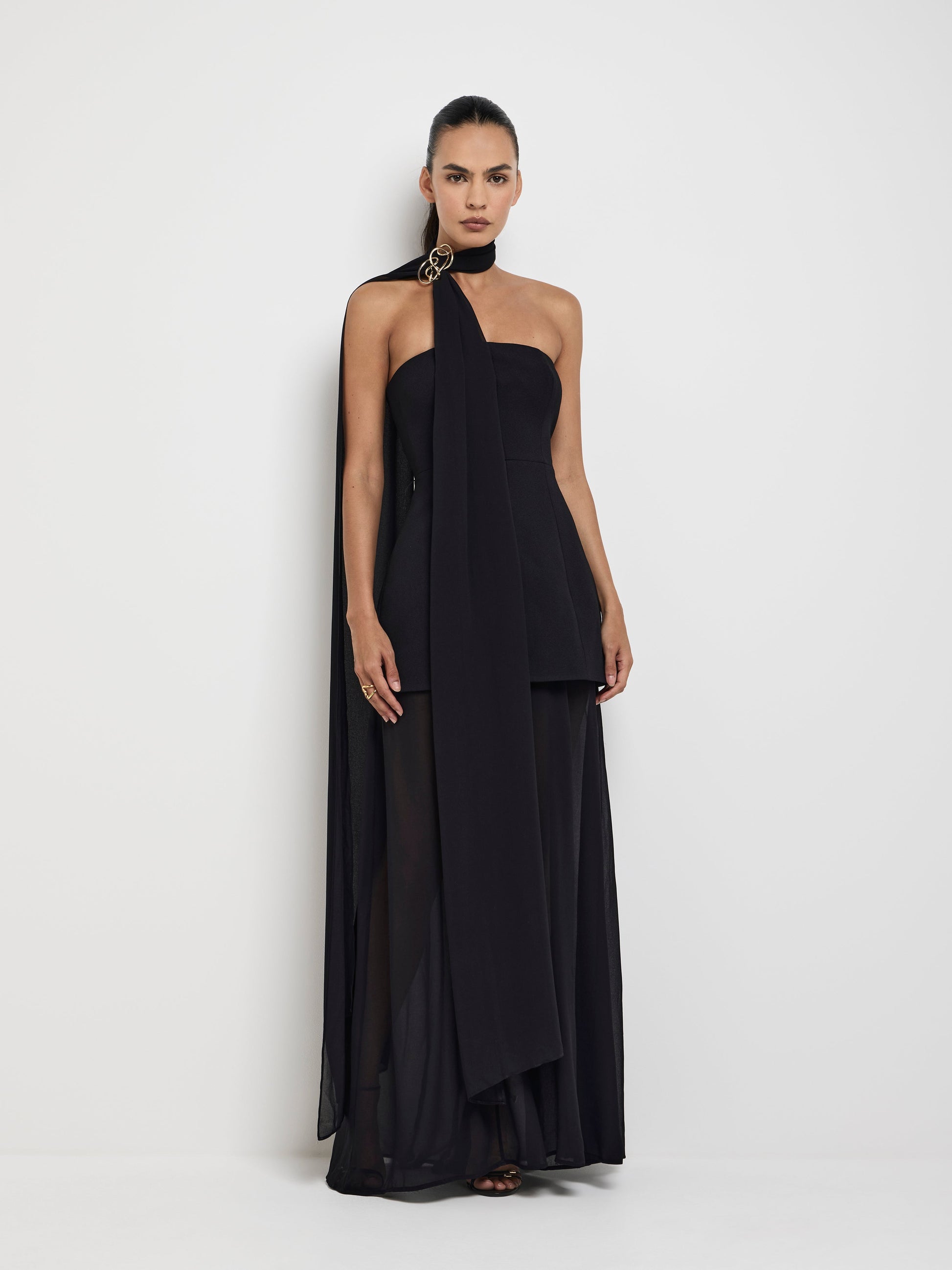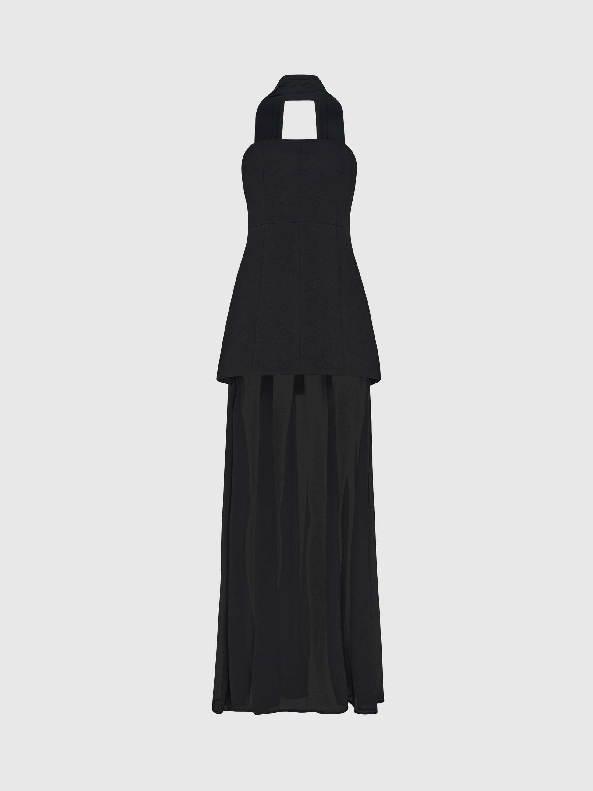 Gracefully dramatic, the Marissa Dress is designed for the modern muse. Showcasing a black bonded fabrication with sheer skirt, strapless bandeau bodice, A-line mini skirt with inner gown maxi skirt, fit and flare styling and detachable neck scarf/waist sash. Pair with our Mathilde Brooch to complete the look.