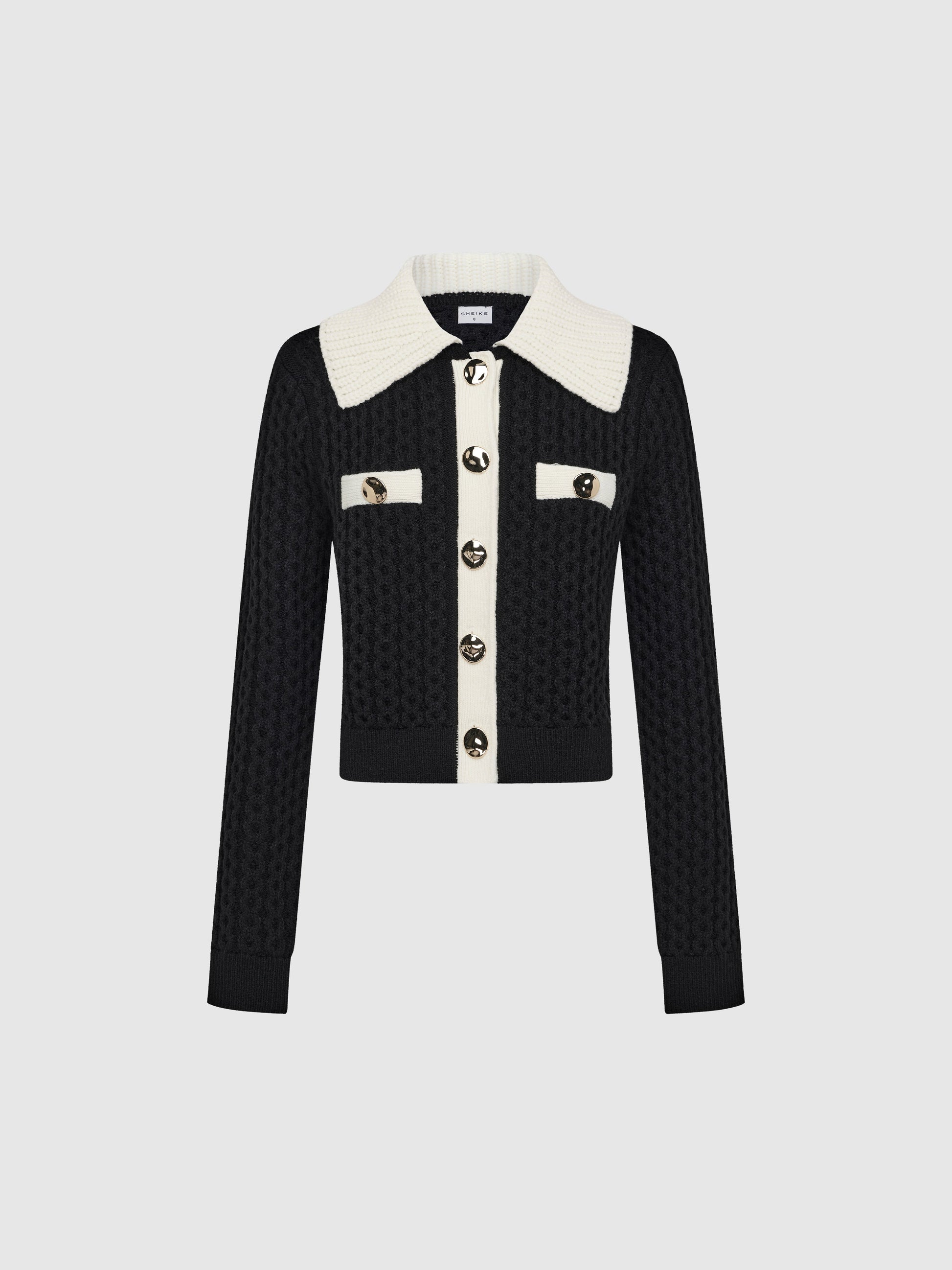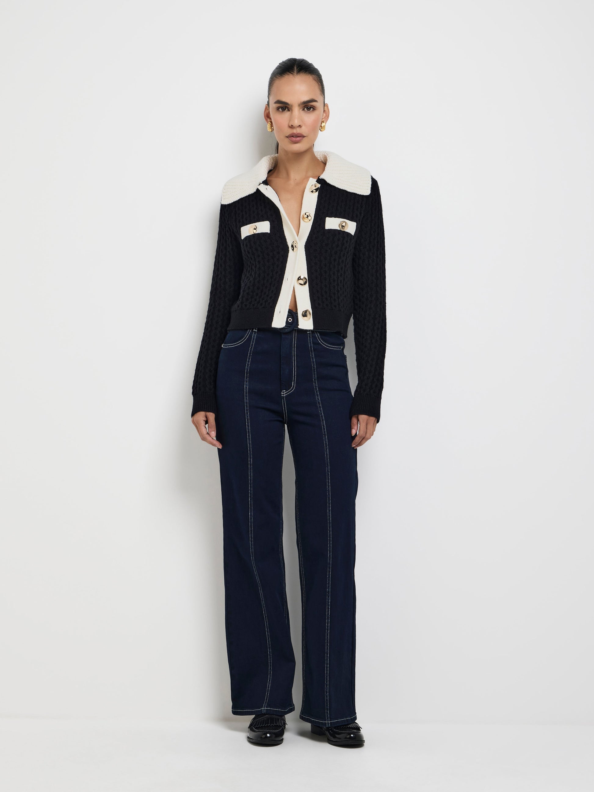 Refined but not reserved. Introducing the Marla Cardigan - showcasing a relaxed fit, cropped cut, faux pockets, oversized collar and contrast yarn on collar, pockets and front placket. Pair back with our matching Marla Knit Skirt to complete the look.