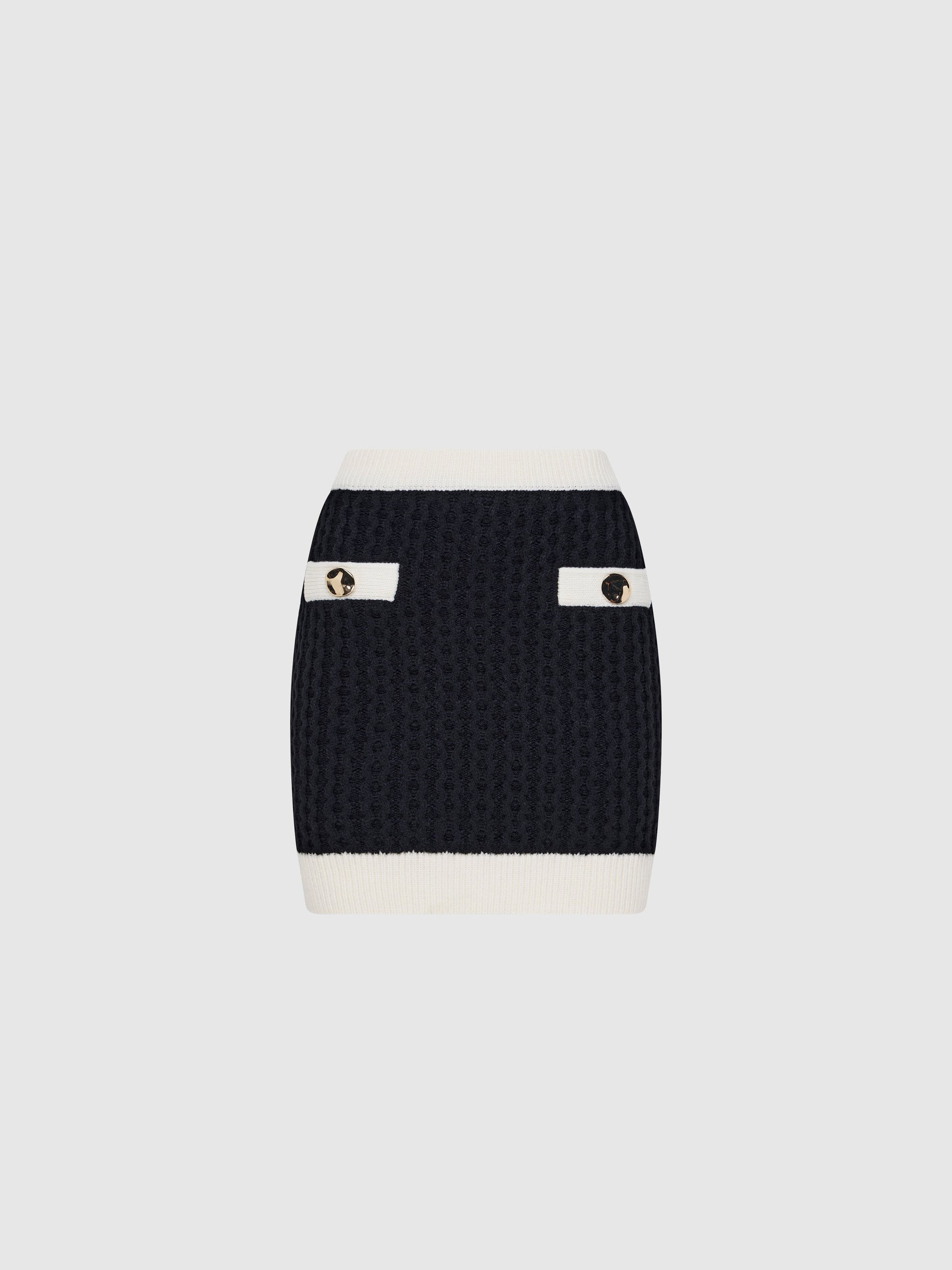 Refined but not reserved. Introducing the Marla Knit Skirt - showcasing a cable knit fabrication, slim mini length fit, faux pockets with gold buttons and contrast yarn on waistband, pockets and hem. Pair back with our matching Marla Cardigan to complete the look.