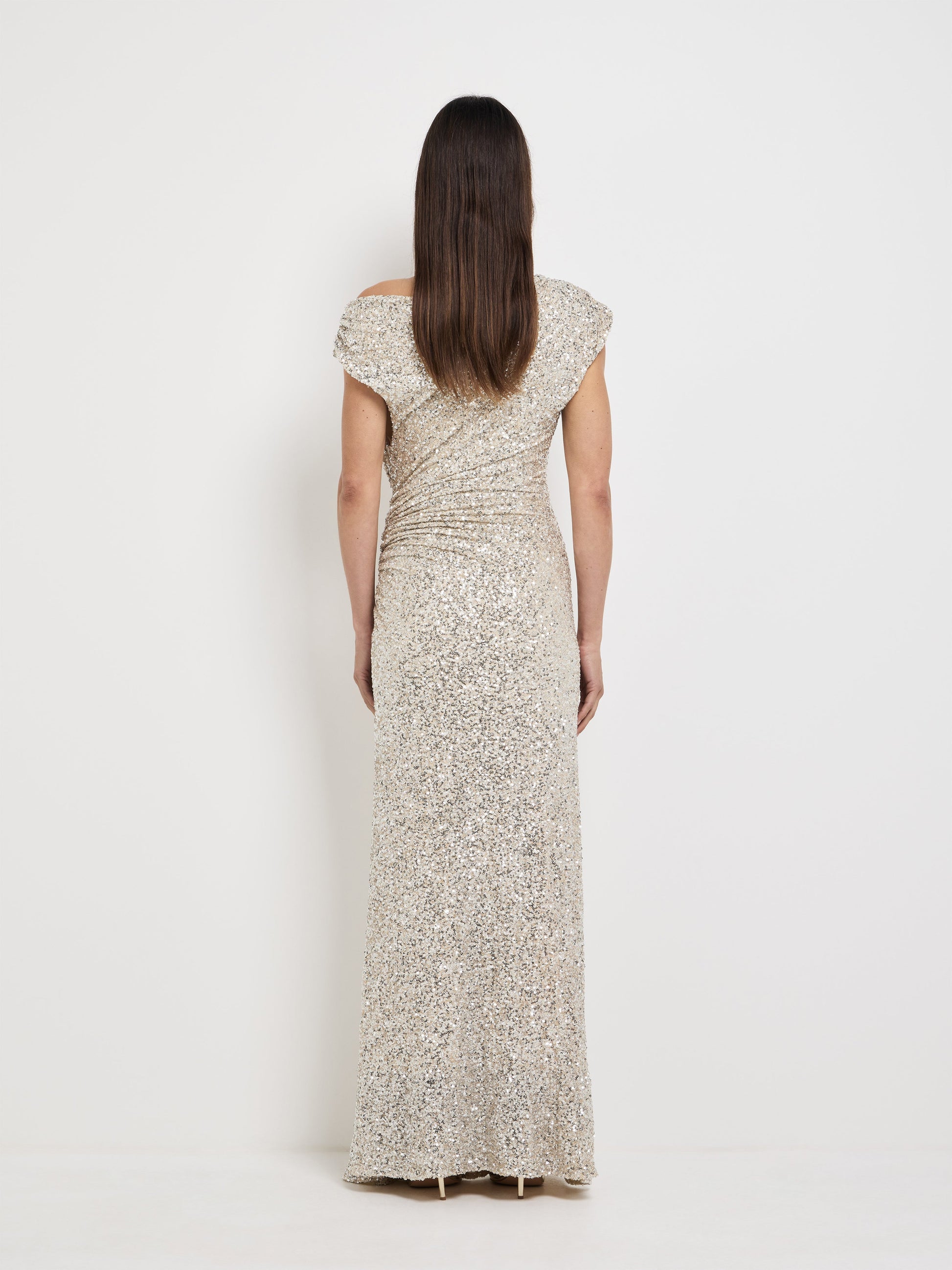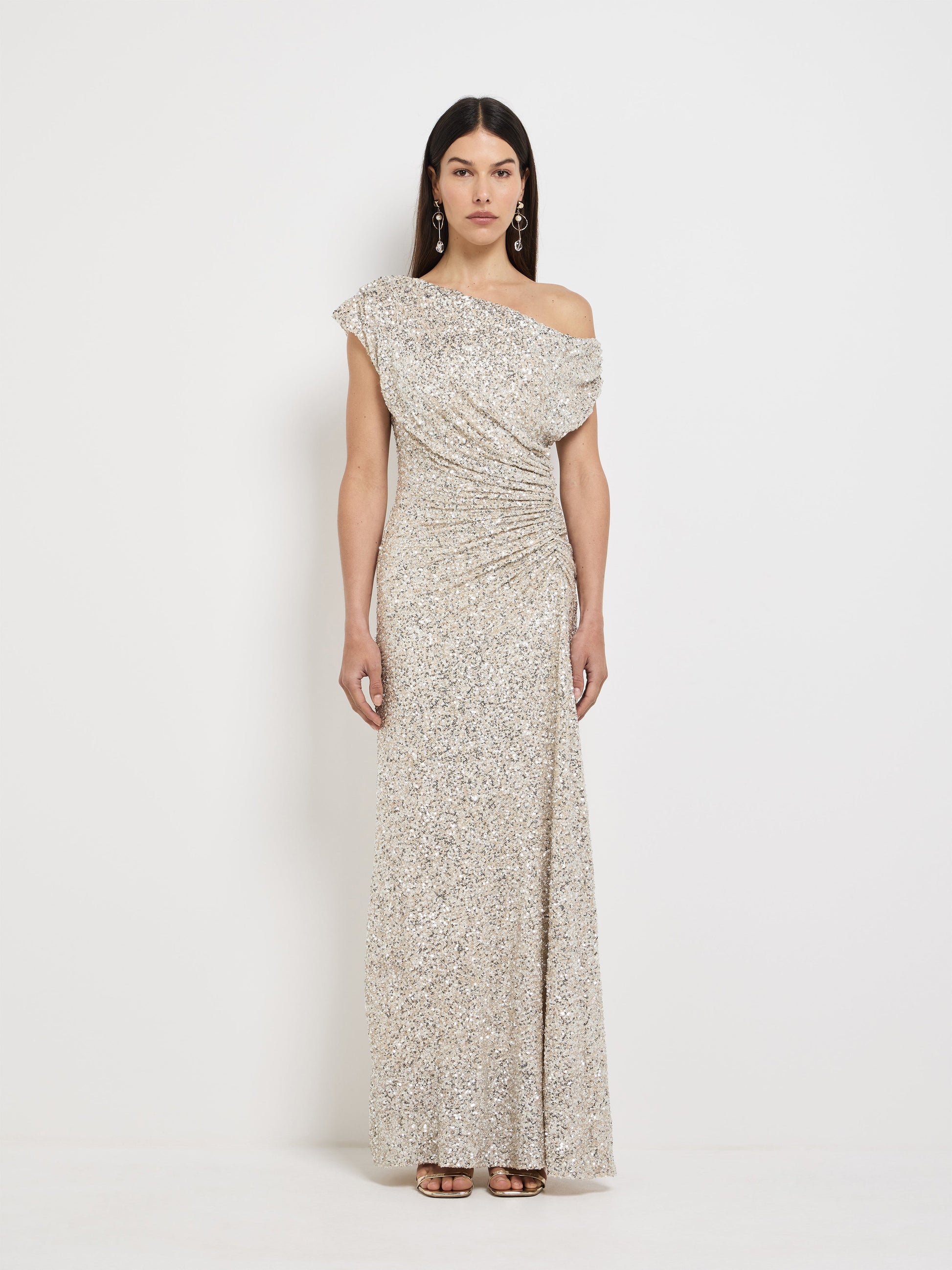 Channel red carpet energy in this sleek, sculpted silhouette. Introducing the Martina Maxi Dress. Featuring a silver stretch sequin fabrication, asymmetrical off shoulder neckline, fitted styling, gathering at bodice and hip and maxi skirt length. Style with our Helena Earrings to complete the look.