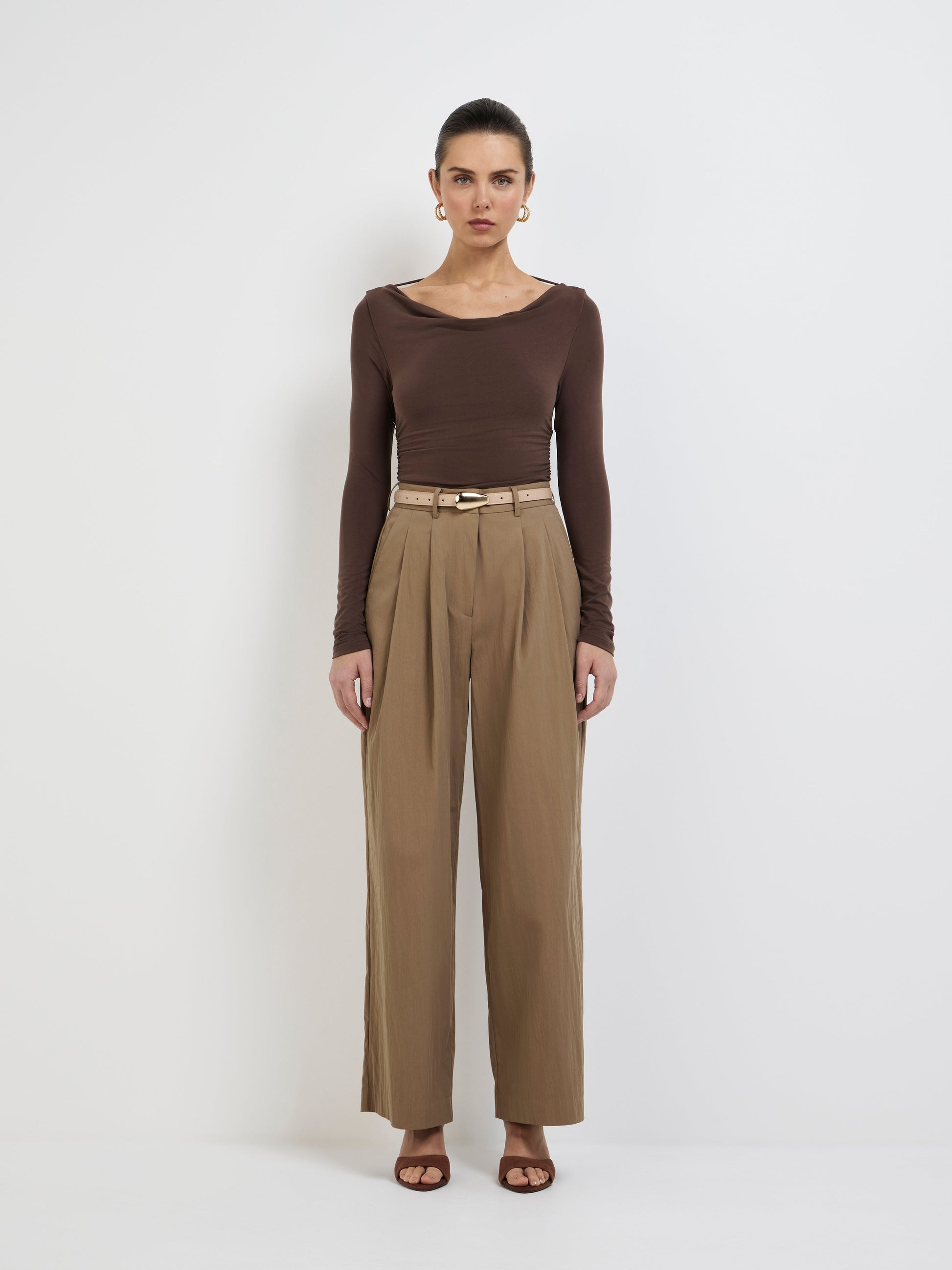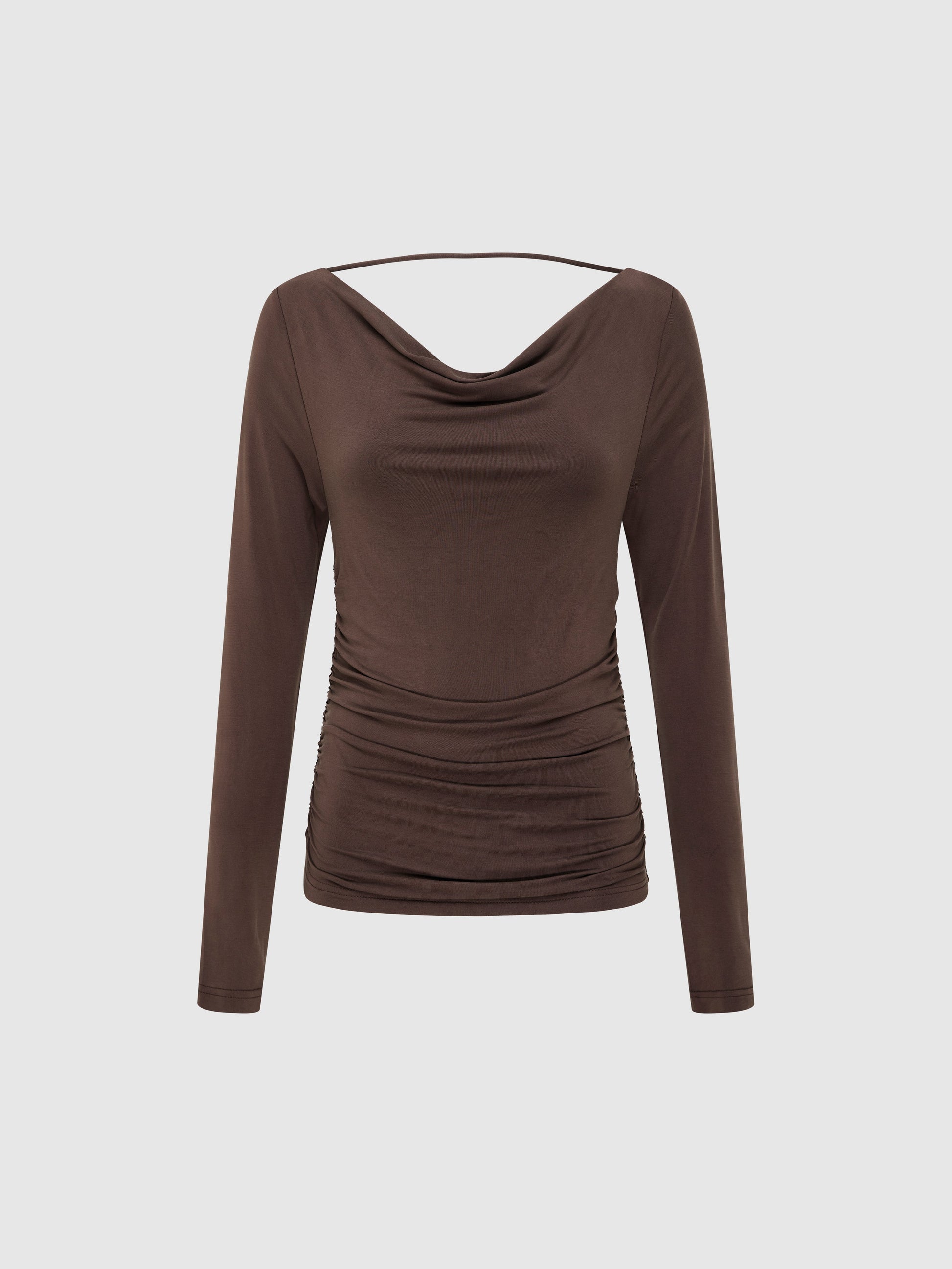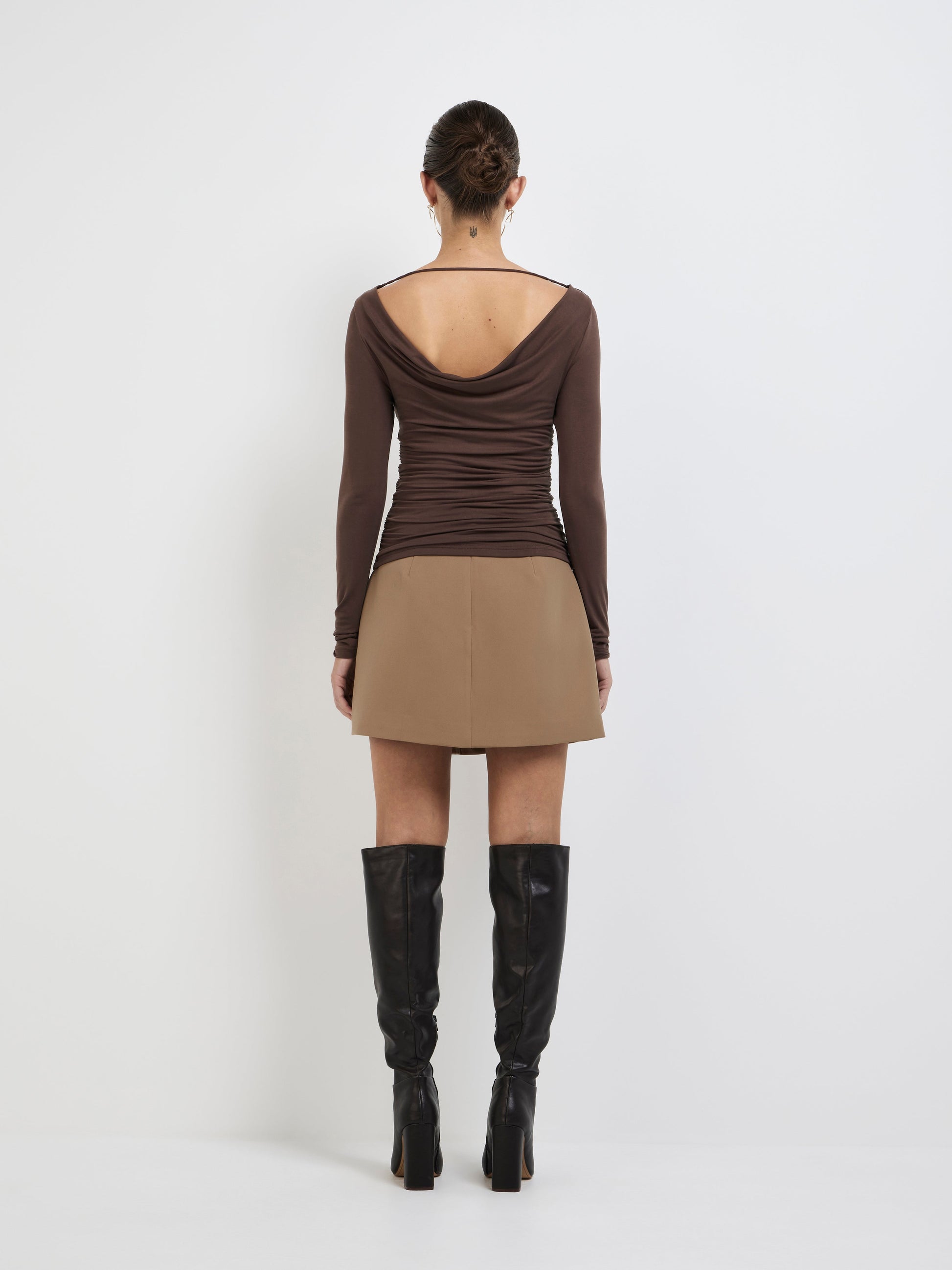 Elevate your wardrobe essentials with our Martina Top. Showcasing a chocolate stretch jersey fabrication, fitted cut, front and back cowl neckline with back strap, ruching across body and fitted long sleeves. Pair with our Holly Mini Skirt to complete the look.