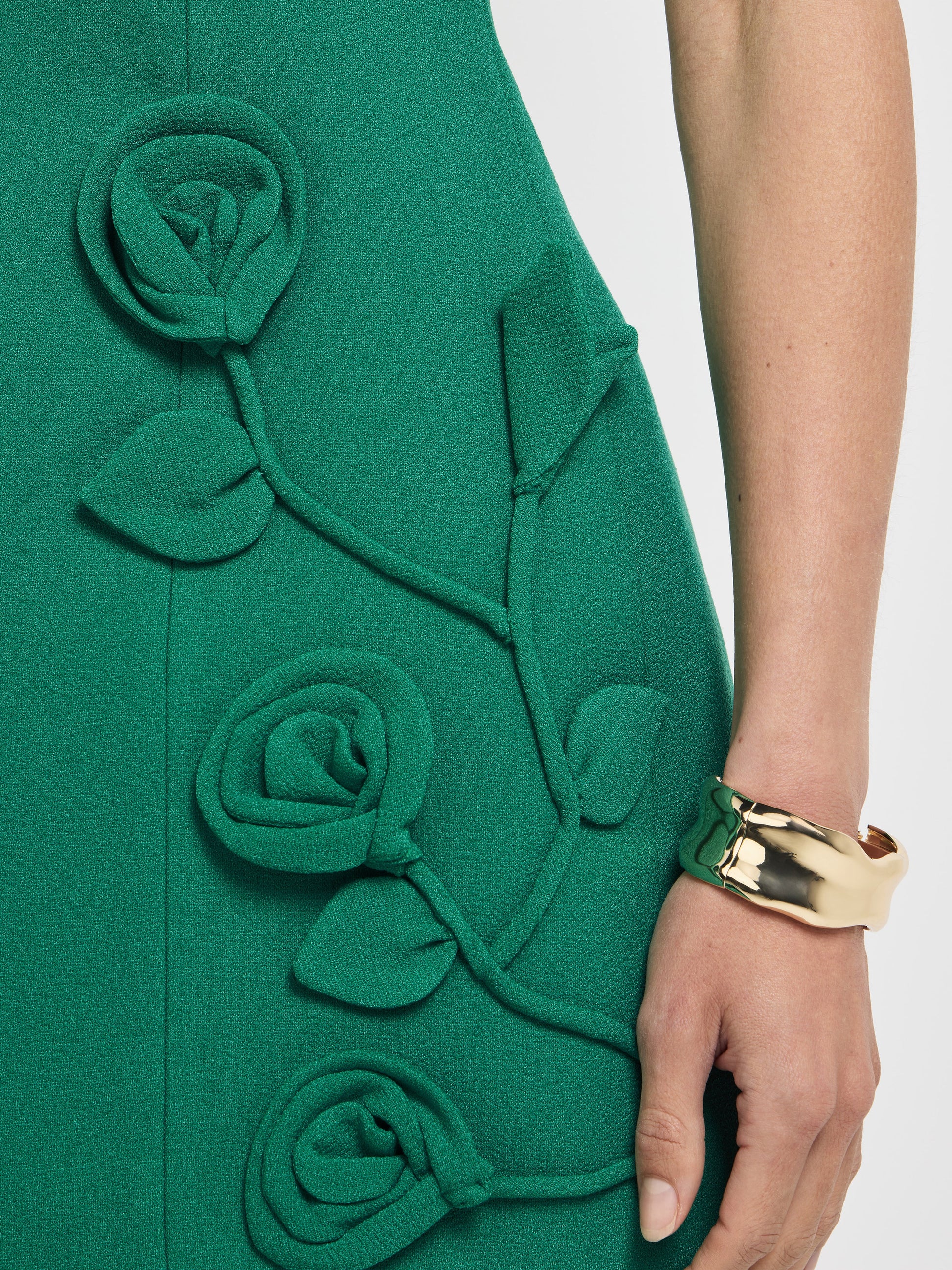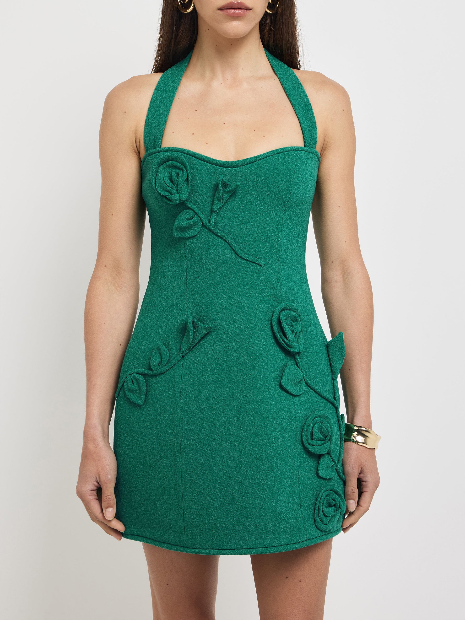 Garden Party Glamour! Elevated florals, luxurious structure, and jade tones make up the Maya Mini Dress. Featuring a green heavily bonded fabrication, fit and flare styling, 3D floral applique motif, sweetheart neckline, adjustable/removable halter straps and mini skirt length. Pair with our Estelle Earrings to complete the look.