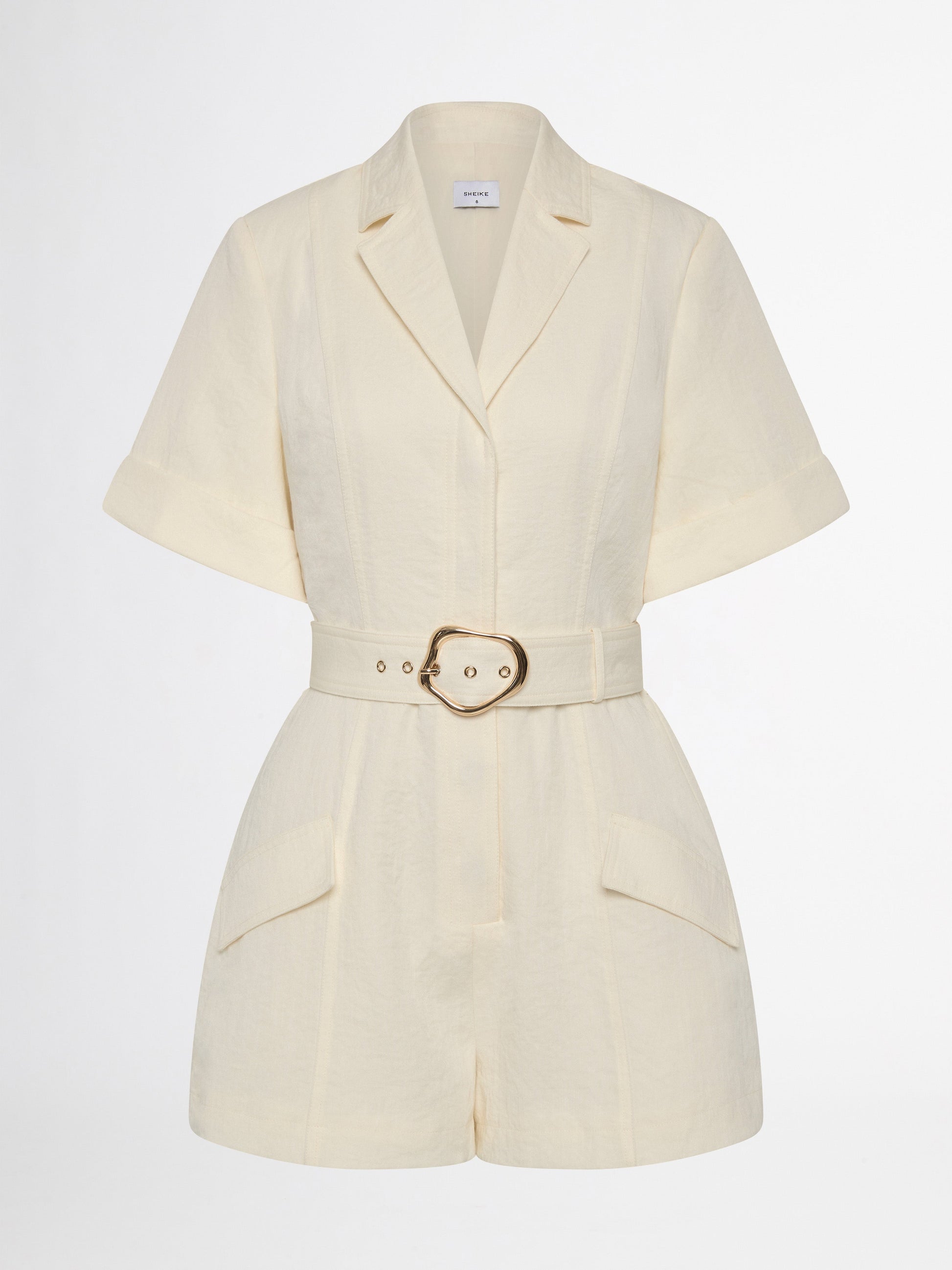 Classic neutral tones to take you into the summer season. Introducing our Maya Playsuit - featuring a neutral woven fabrication, concealed front buttons, relaxed styling, collar and lapel, non functional pocket flaps, cuffed short sleeves and belt with irregular gold buckle. Pair back with our Shira Earrings for a cute brunch look!