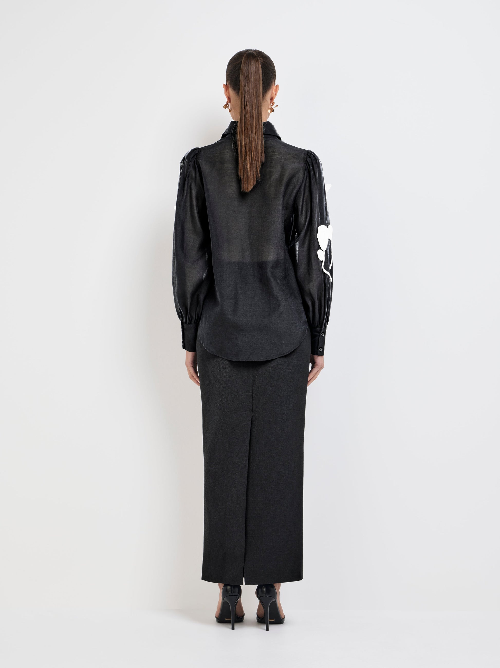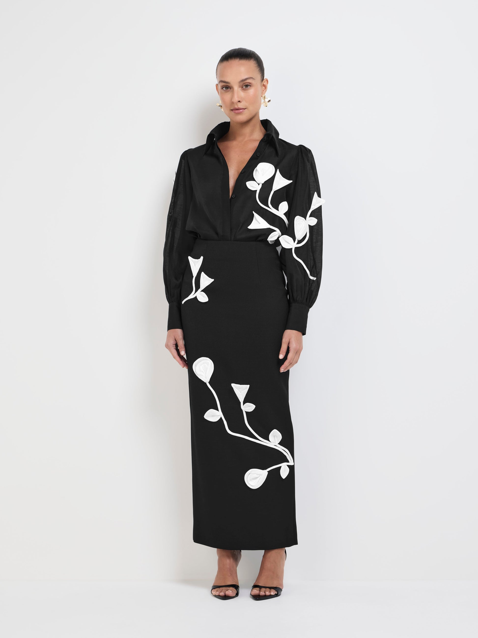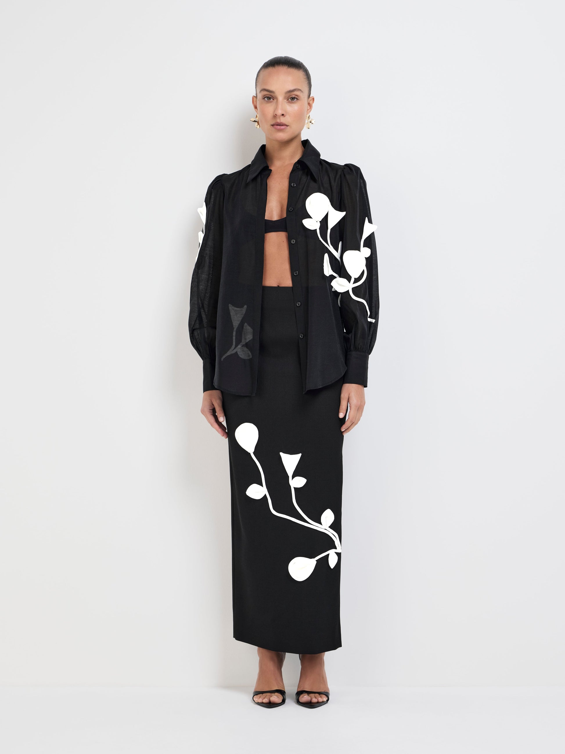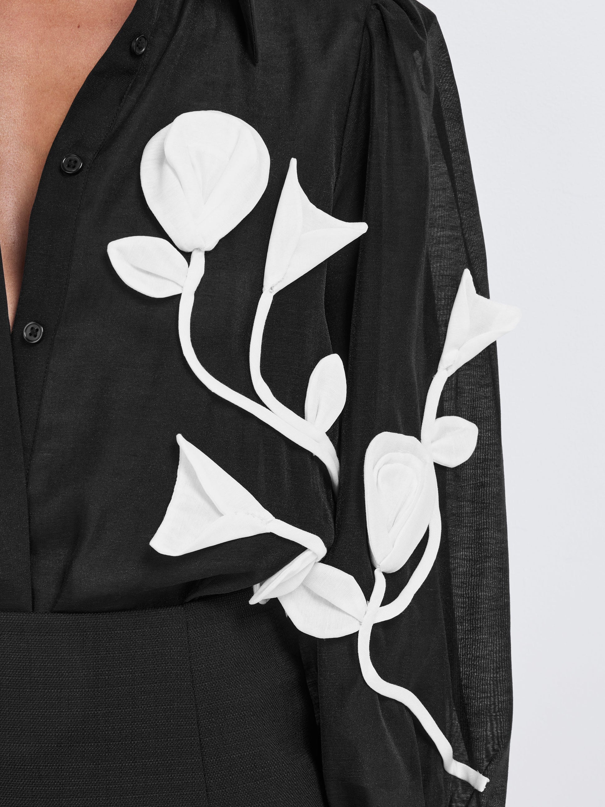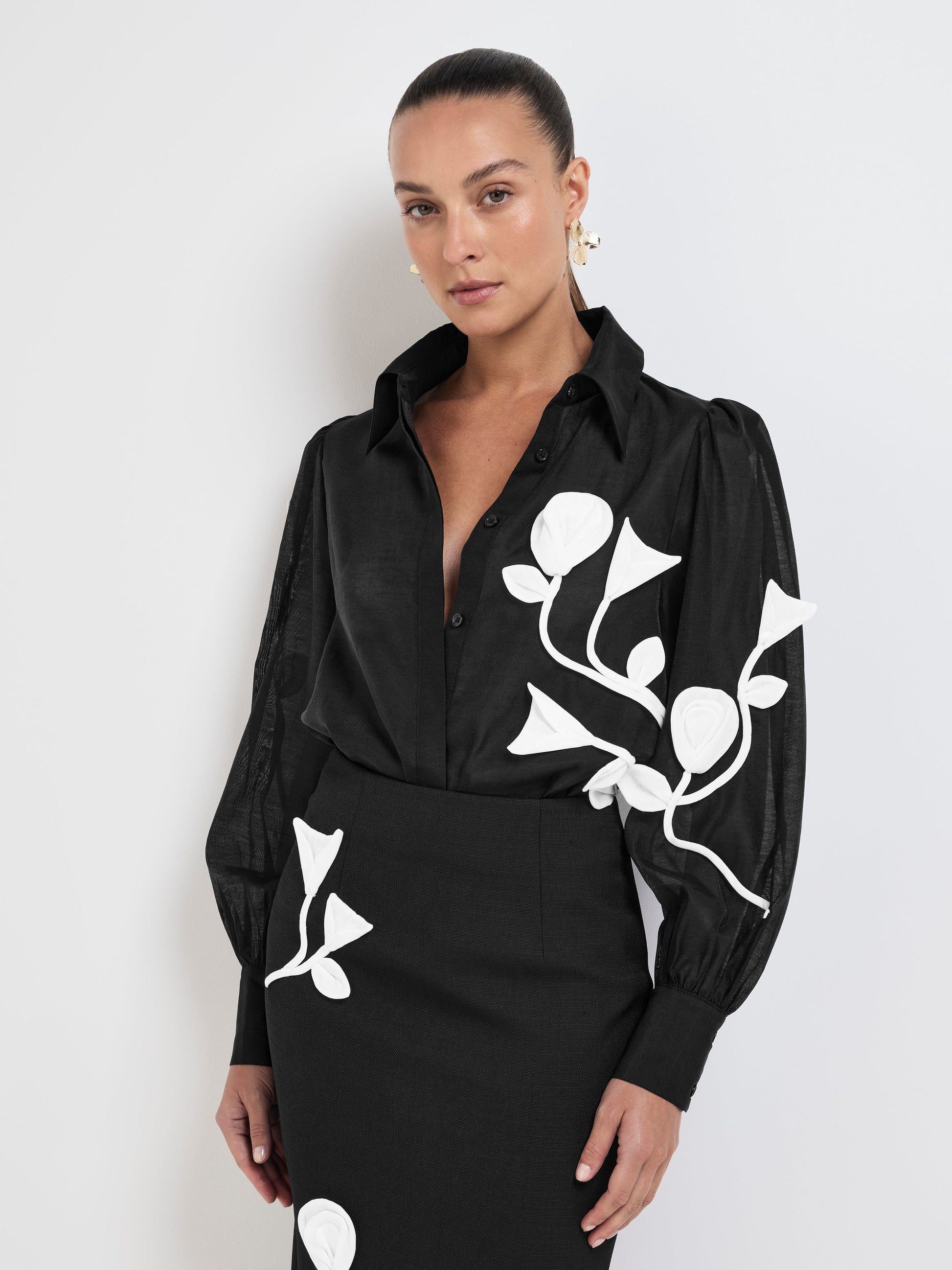 Indulge in the romance of the Maya Shirt - showcasing black sheer fabrication, 3-D applique flower detail in contrast white fabric, collar neckline, button up front and long sleeves with cuff finish. Pair with our matching Maya Skirt to complete the look.