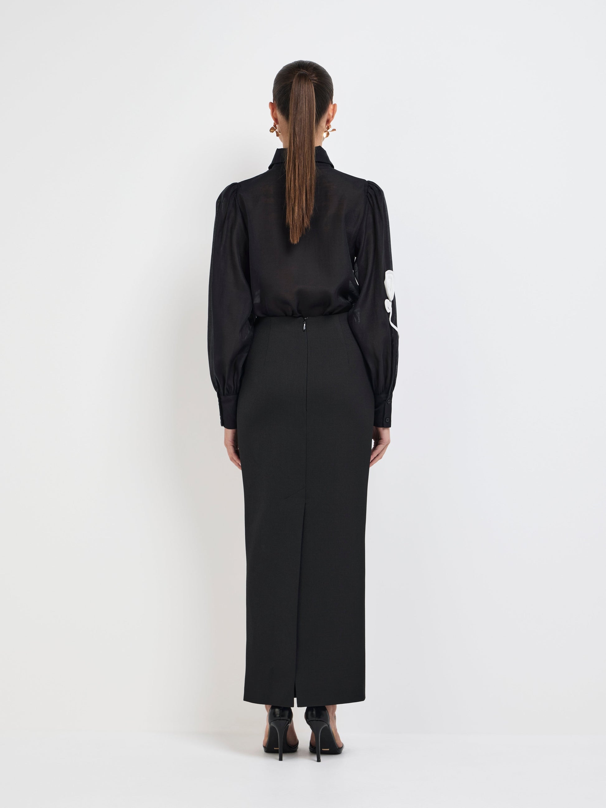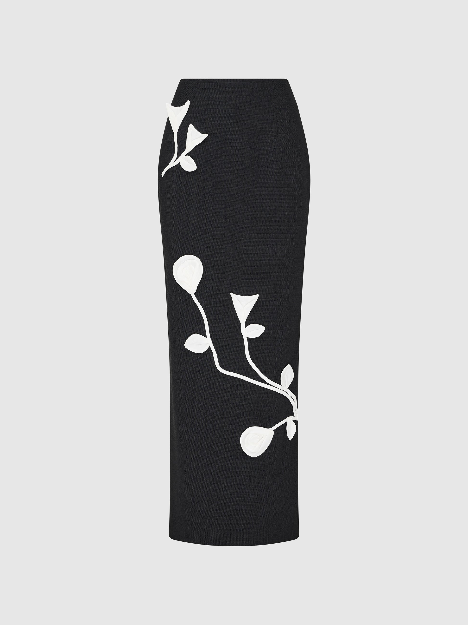 Indulge in the romance of the Maya Skirt - showcasing black woven fabrication, 3-D applique flower detail in contrast white fabric, pencil midi skirt style, fixed waistband and split at centre back. Pair with our matching Maya Shirt to complete the look.