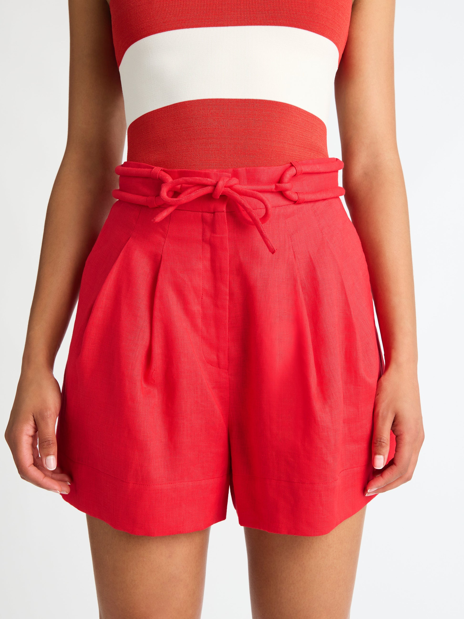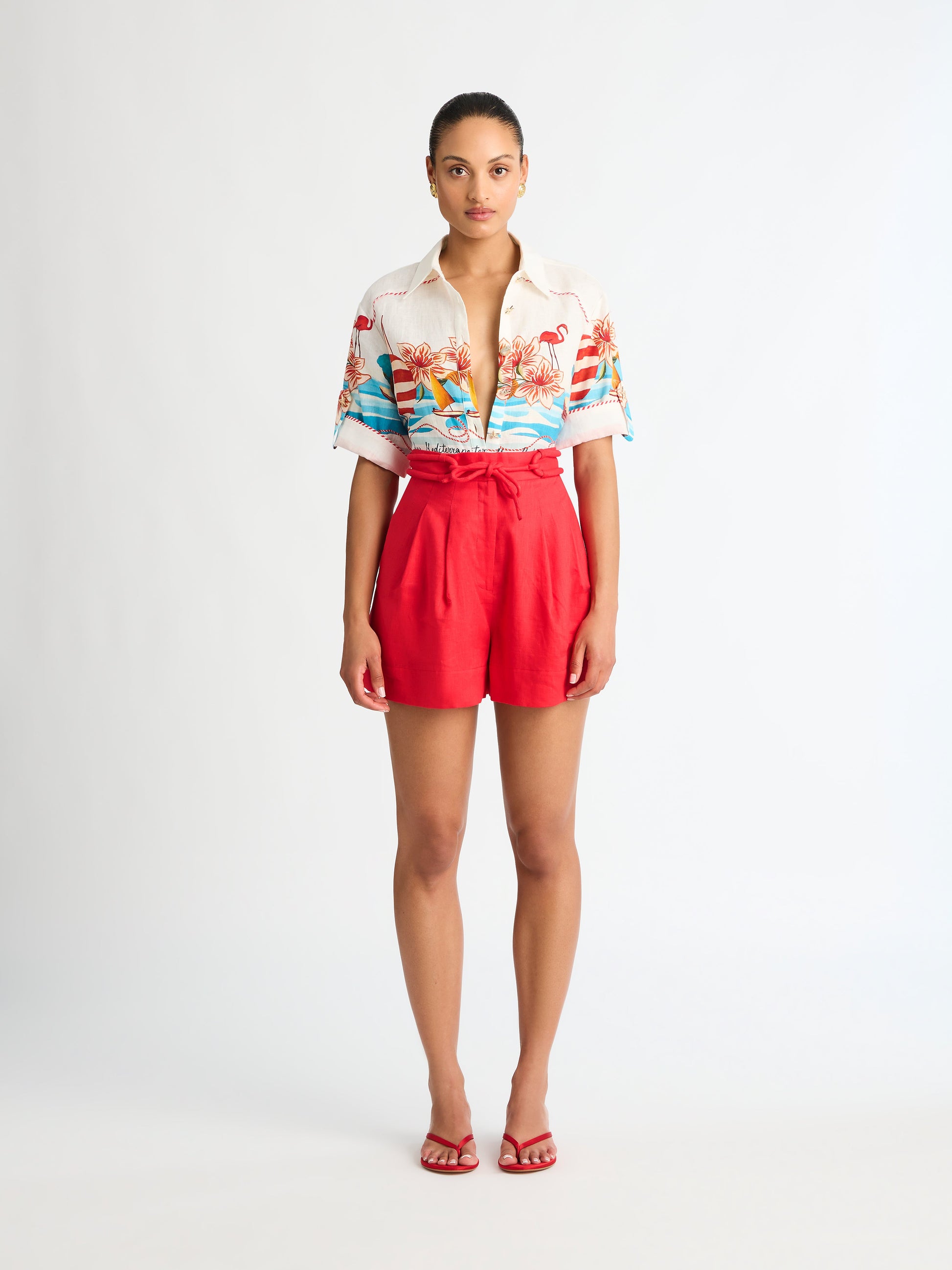 A staple piece to bring you into the new season. Introducing the Mia Linen Short - showcasing a red 100% linen fabrication, relaxed fit, fixed waist, self fabric tie and side seam pockets. Pair with our Amalfi Stripe Top or Bermuda Post Shirt to complete the look.