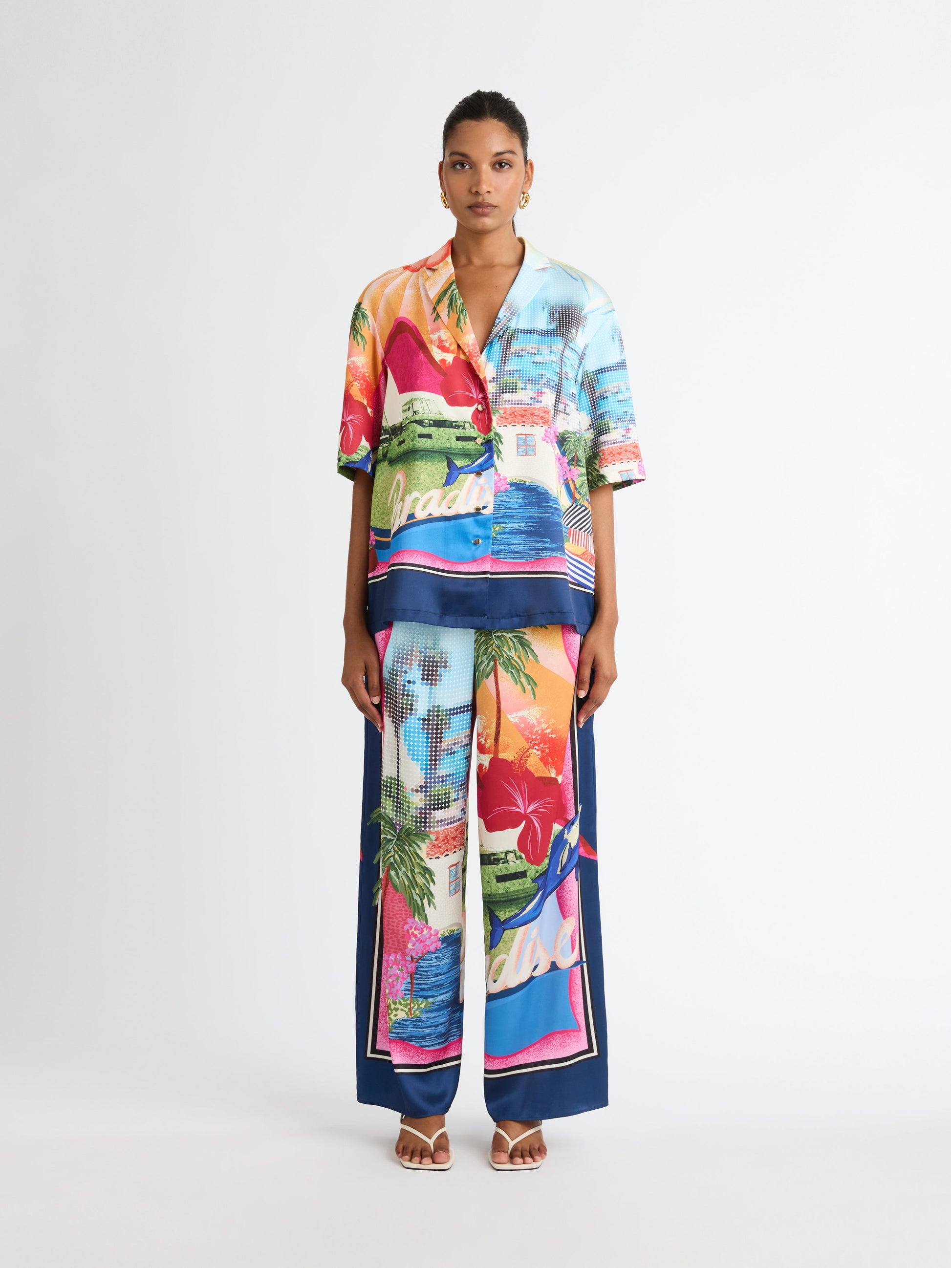 Miami paradise is the sunshine-ready story you’ve been waiting for. Adorned in a print inspired by beaches and sunshine. Our Miami Shirt features printed satin fabrication, relaxed styling, collar with front button closure, short sleeves and self fabric sash tie. Complete the look with our matching Miami Pant or Miami Skirt!