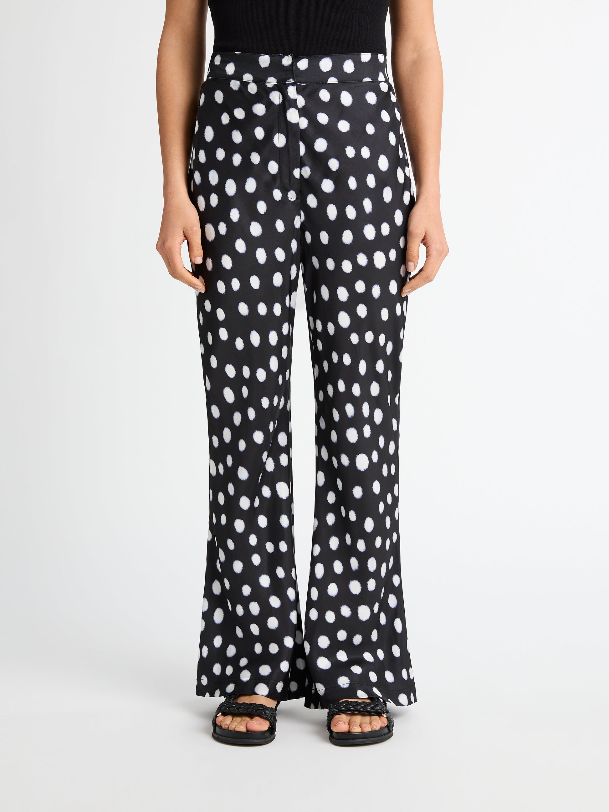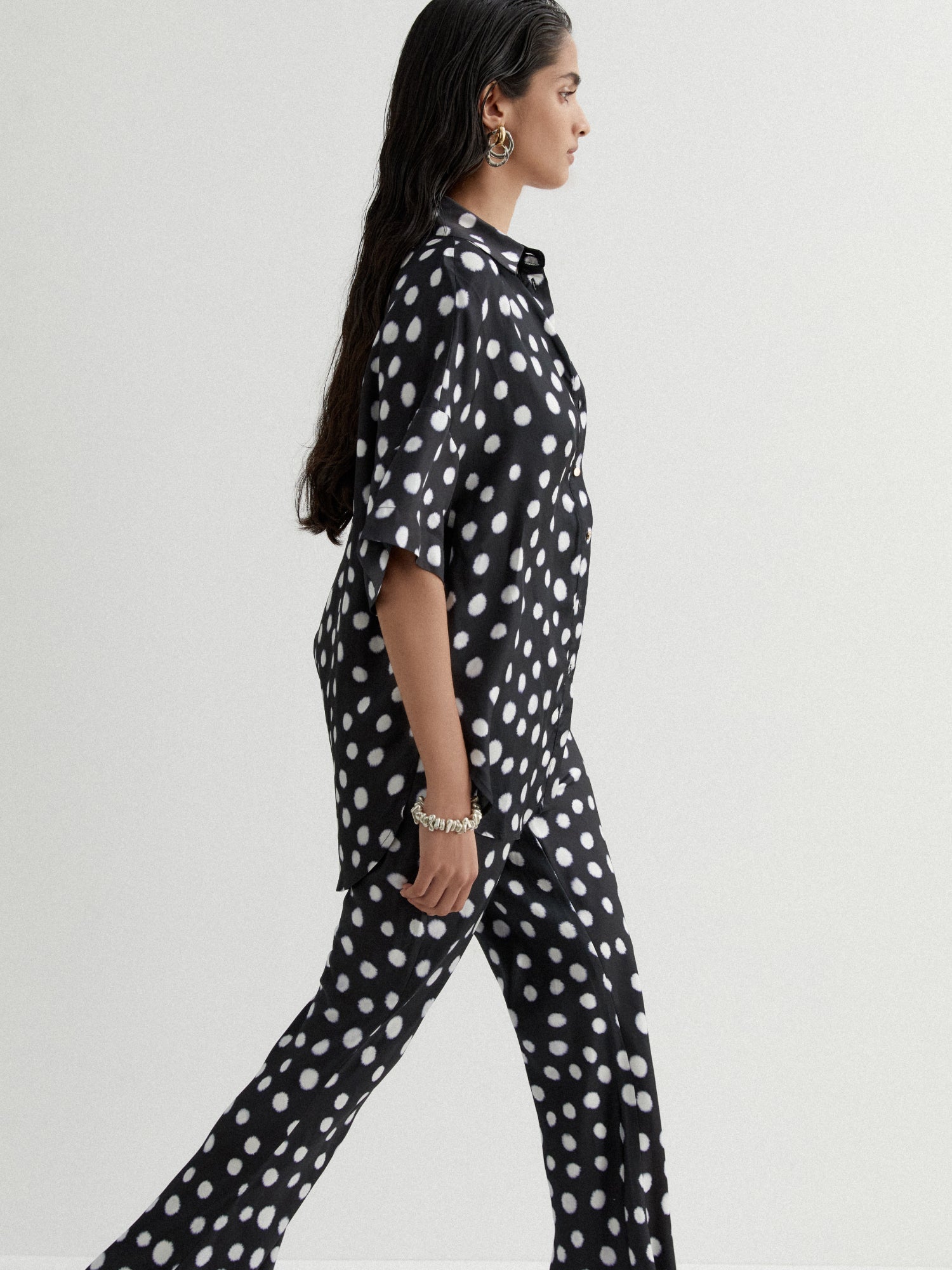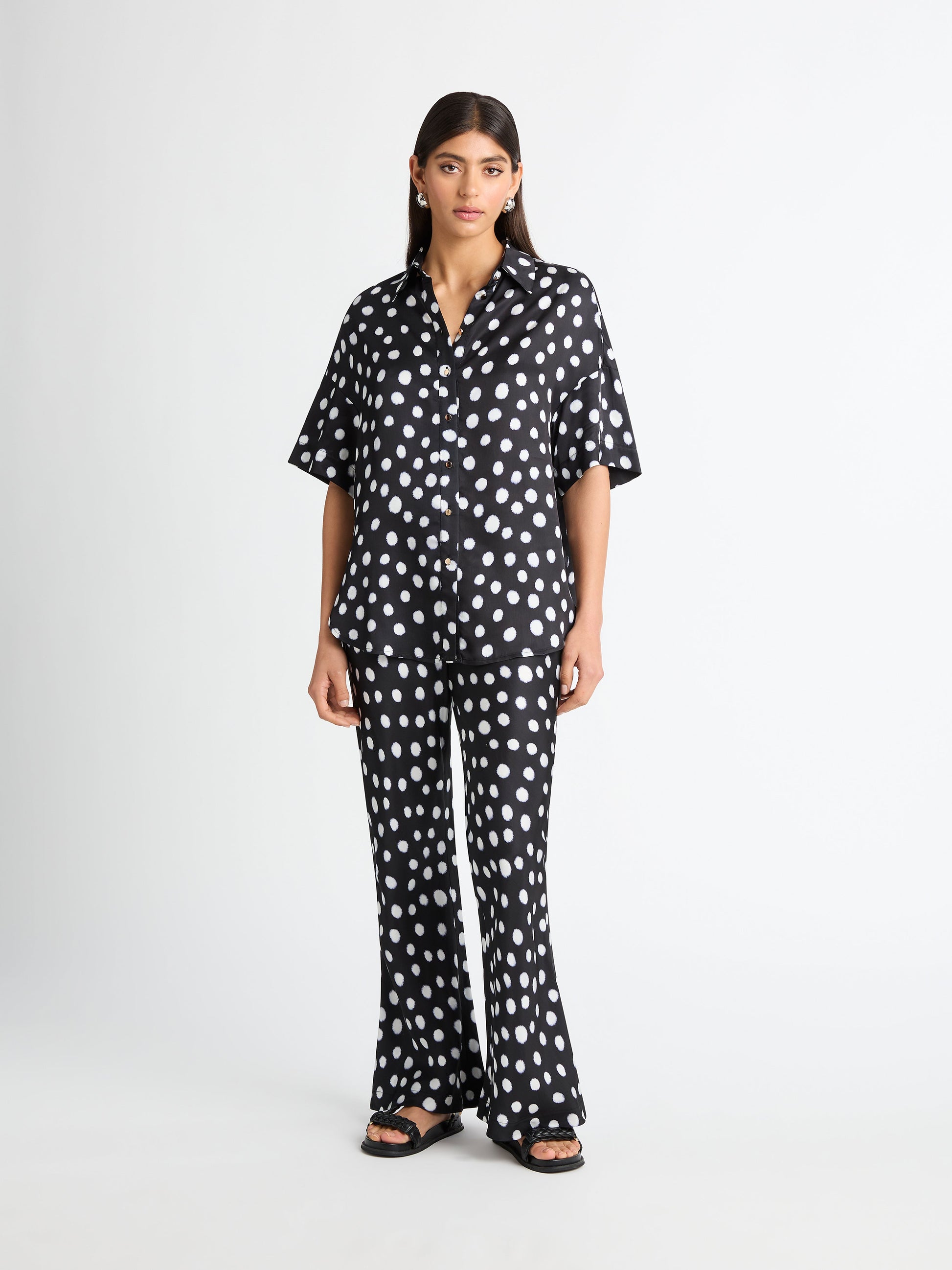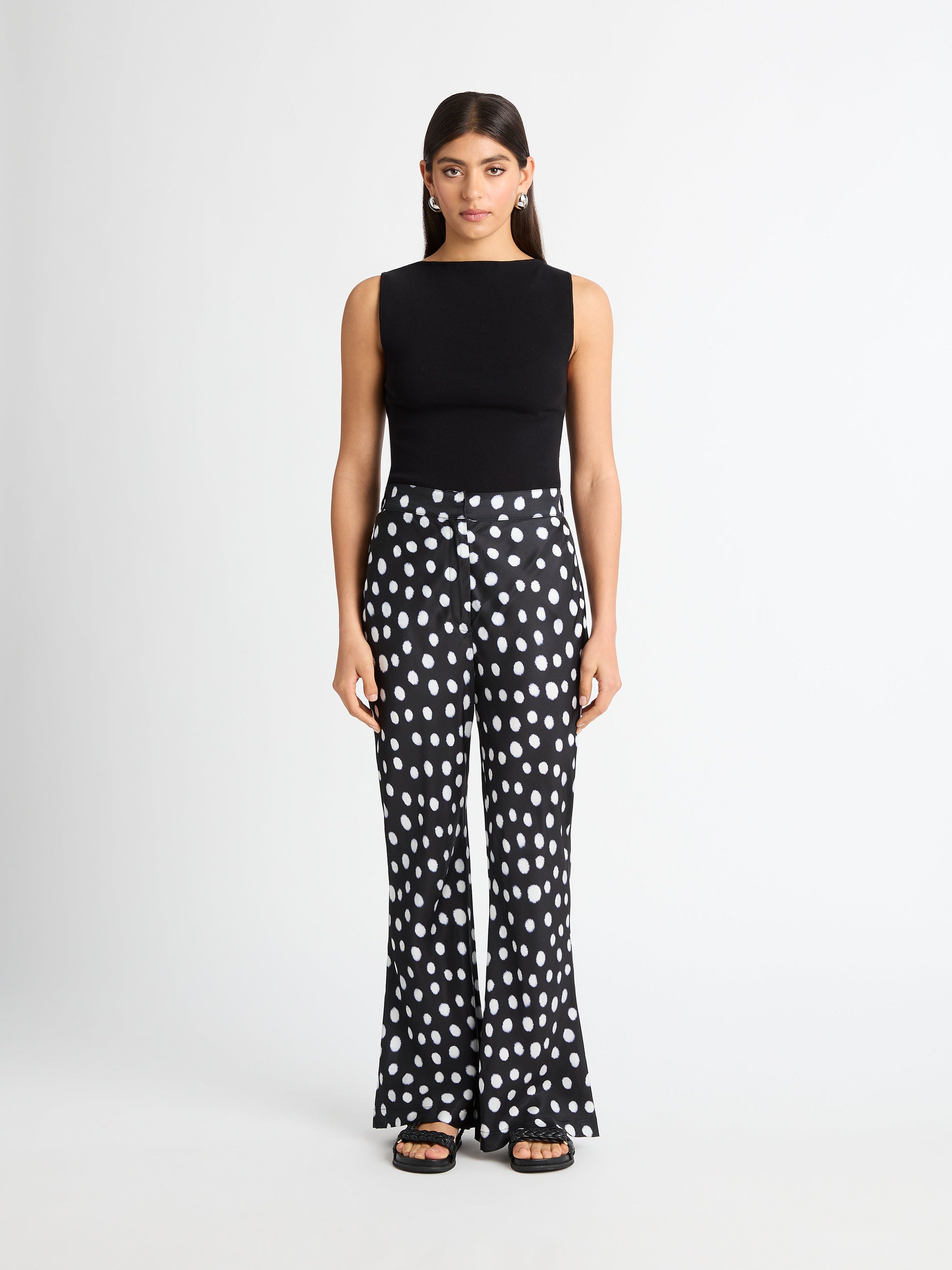 Monochrome tones meet sweet spots. Introducing the Micah Pant - showcasing a luxe satin fabrication, slim fit bias leg with flared hem and elasticated back waist with front fixed waist with zip and concealed closure. Pair with our matching Micah Shirt to complete the look.