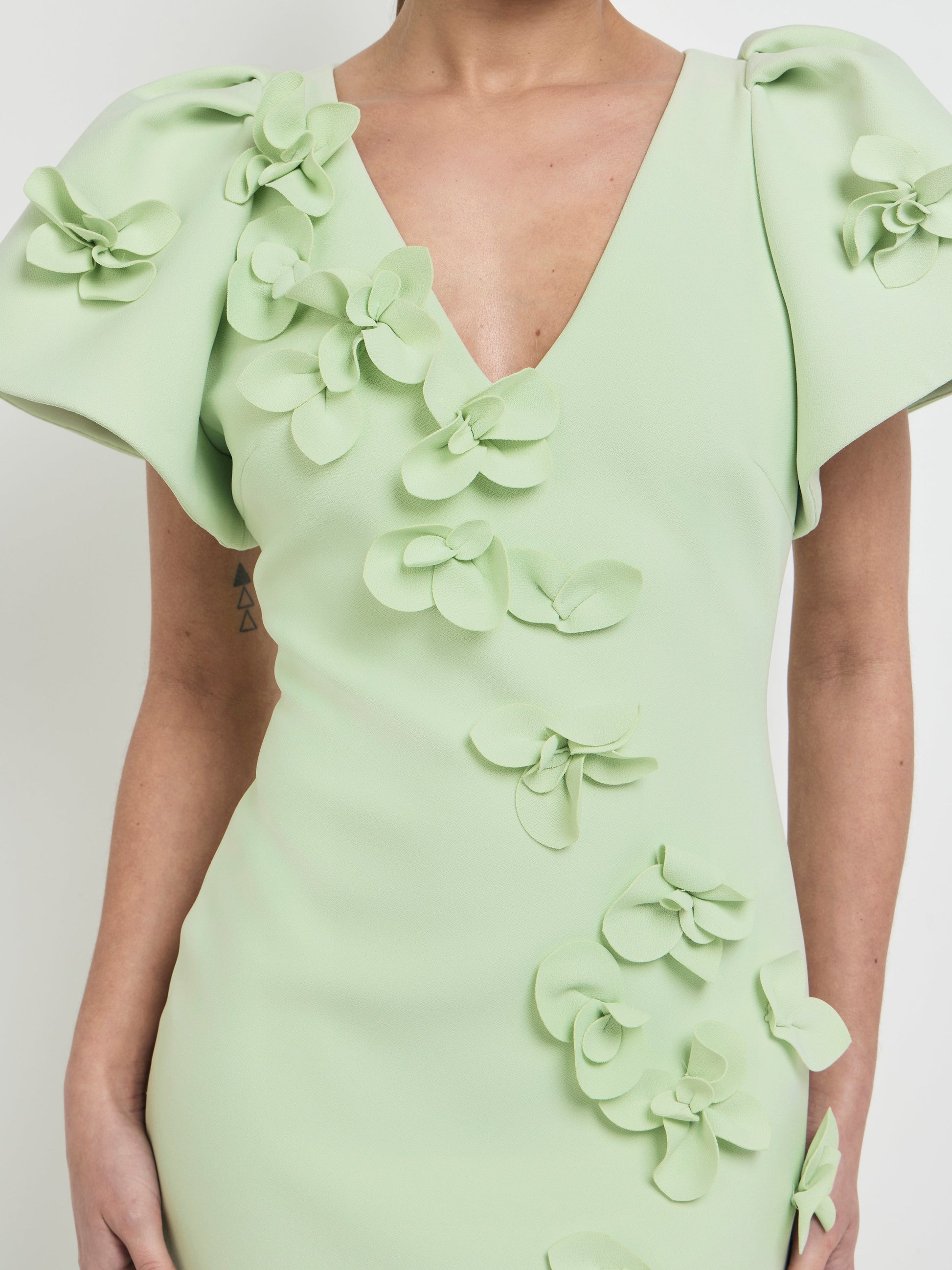 Get social this season in the Michelle Midi Dress! This green midi dress features a bonded woven green fabrication with pink 3D applique flowers, V neckline, short puff sleeves and midi length. Pair with our Demi Earring Stack to complete your look!