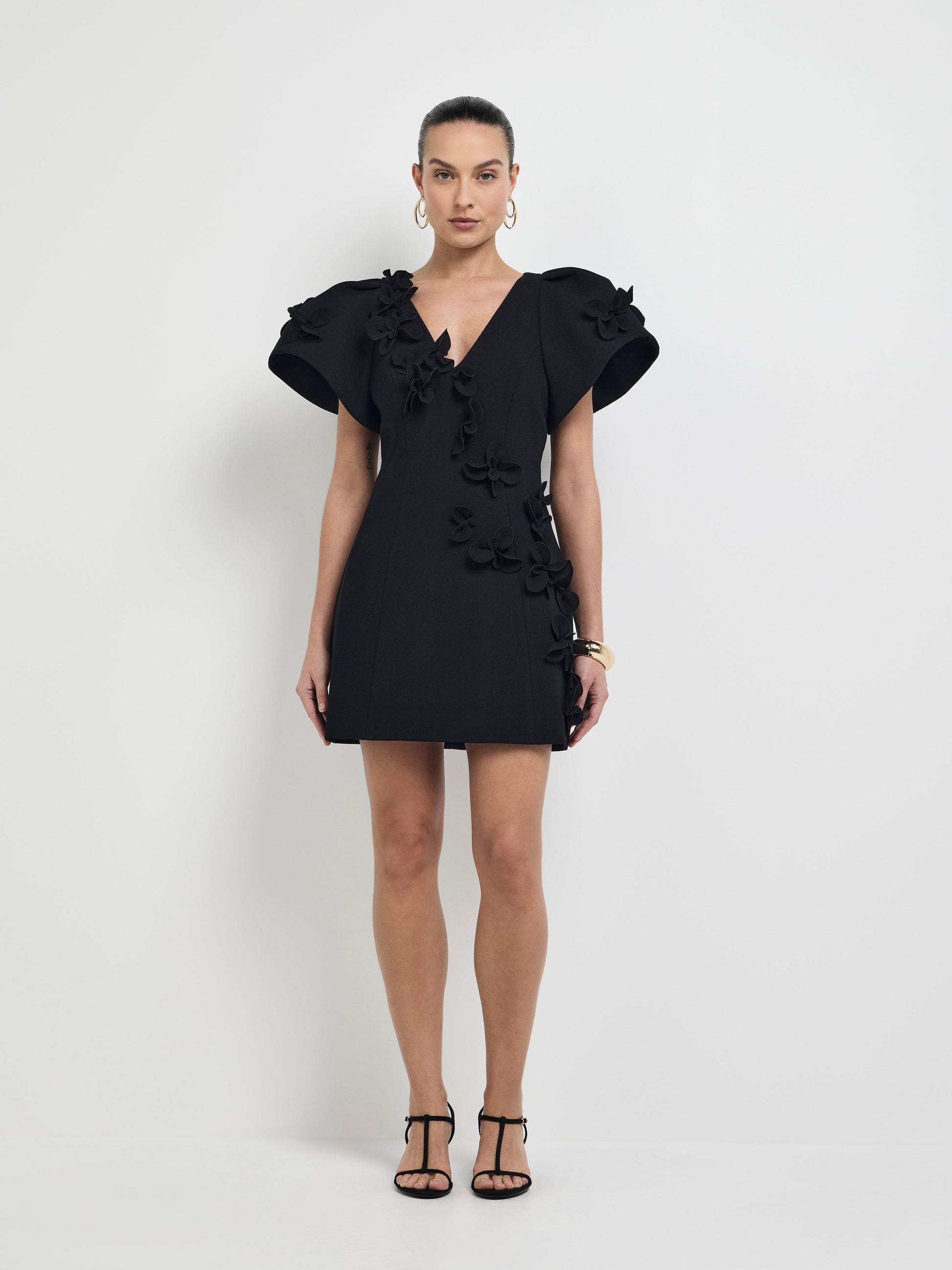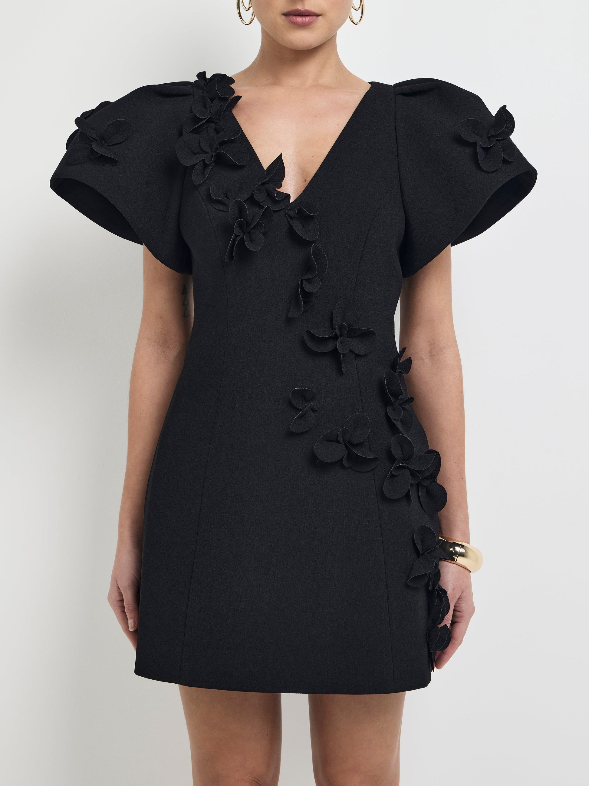 Get social this season in the Michelle Mini Dress! This lush black mini dress features a bonded woven black fabrication with pink 3D applique flowers, V neckline, short puff sleeves and mini length. Pair with our Clara Earrings to complete your look!