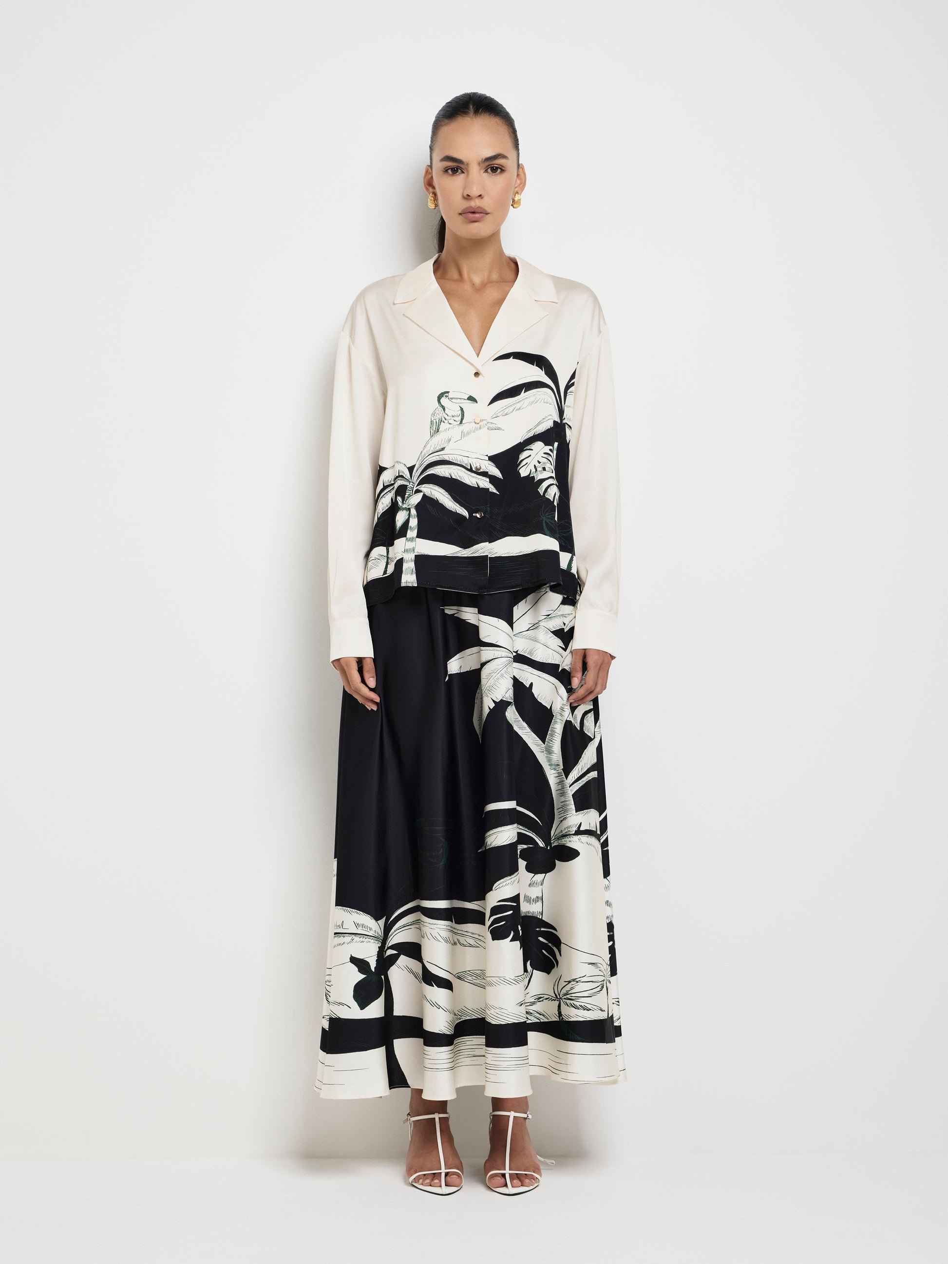 Paradise reimagined in monochrome! Introducing the Midnight Palms Shirt - showcasing a placement print satin fabrication, long sleeves, collar, button placket closure front and oversized styling. Pair with our matching Midnight Palms Skirt to complete the look.