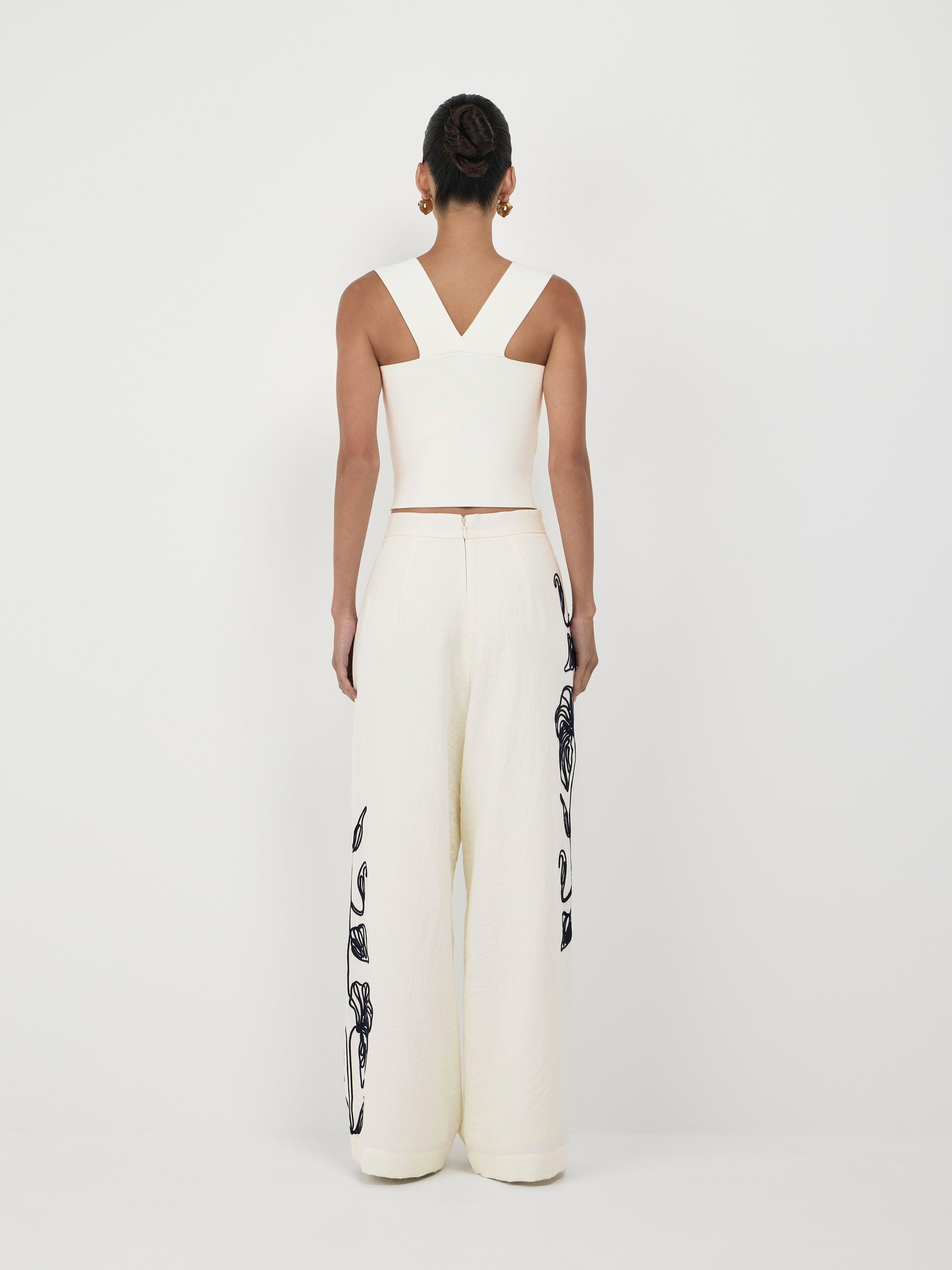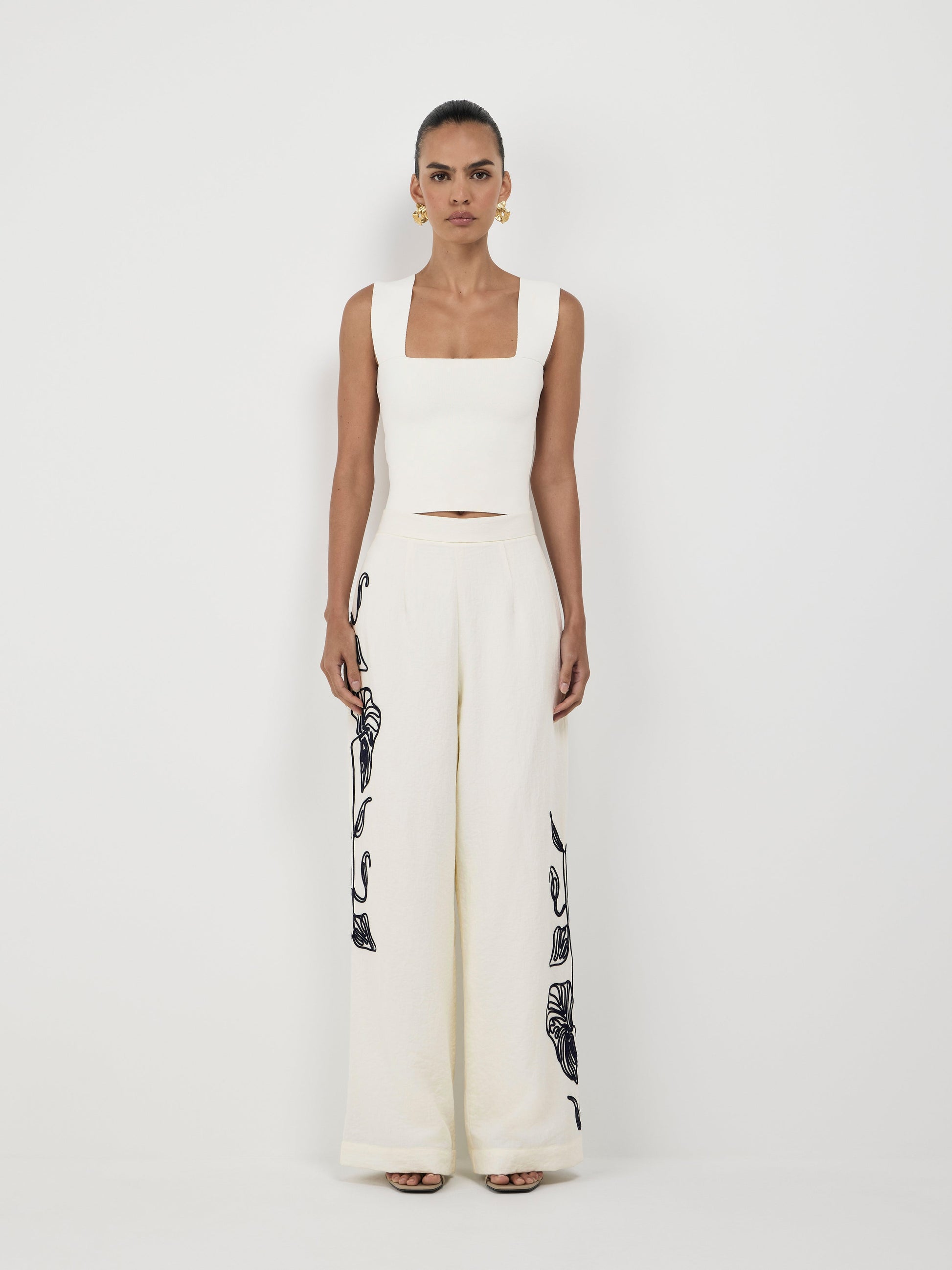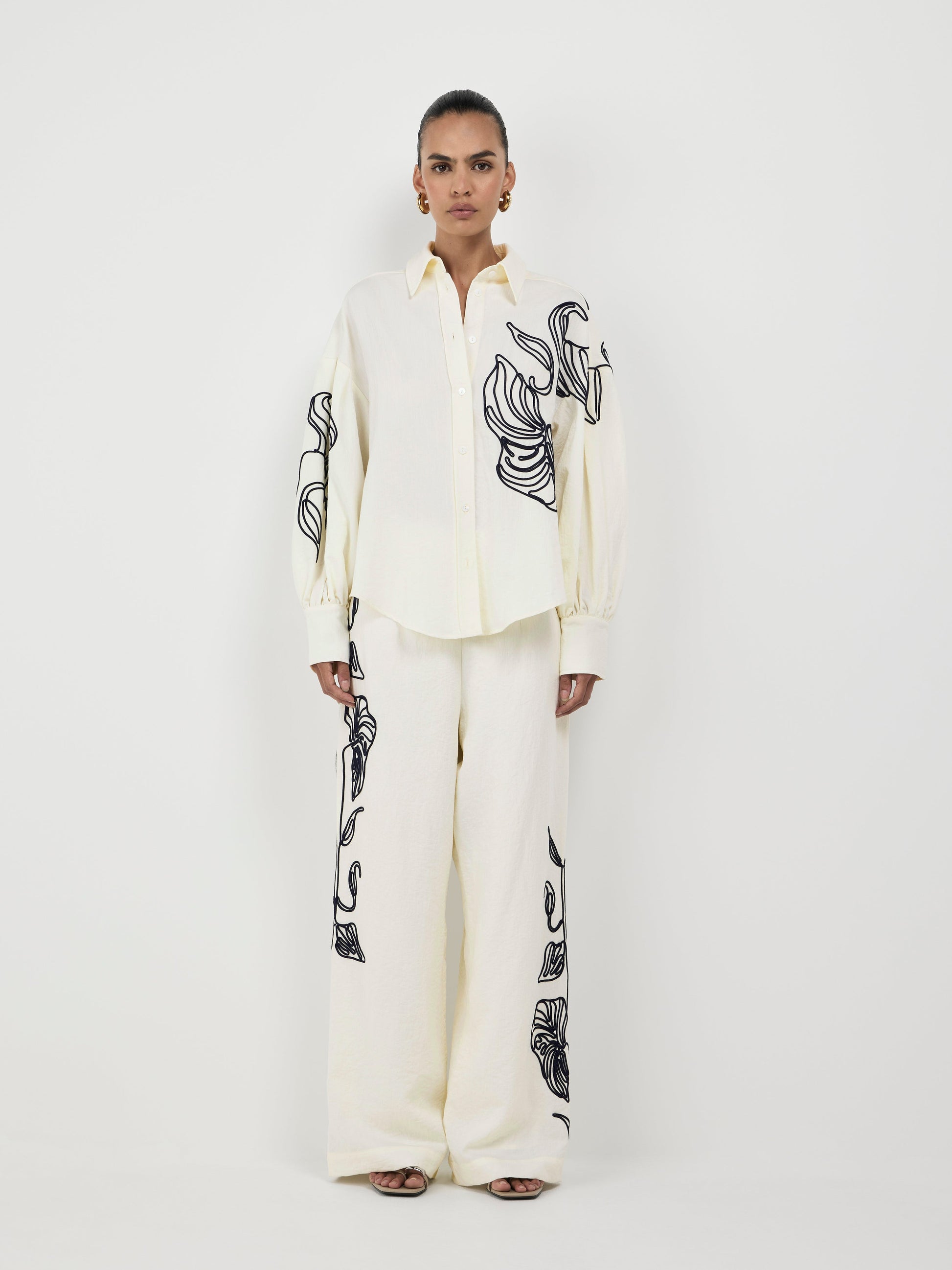 Laid-Back Luxe. Introducing the Milos Pant - showcasing a woven embroidered fabrication, fixed waistband, fully lined and wide let pant. Pair with our matching Milos Shirt to complete the look.
