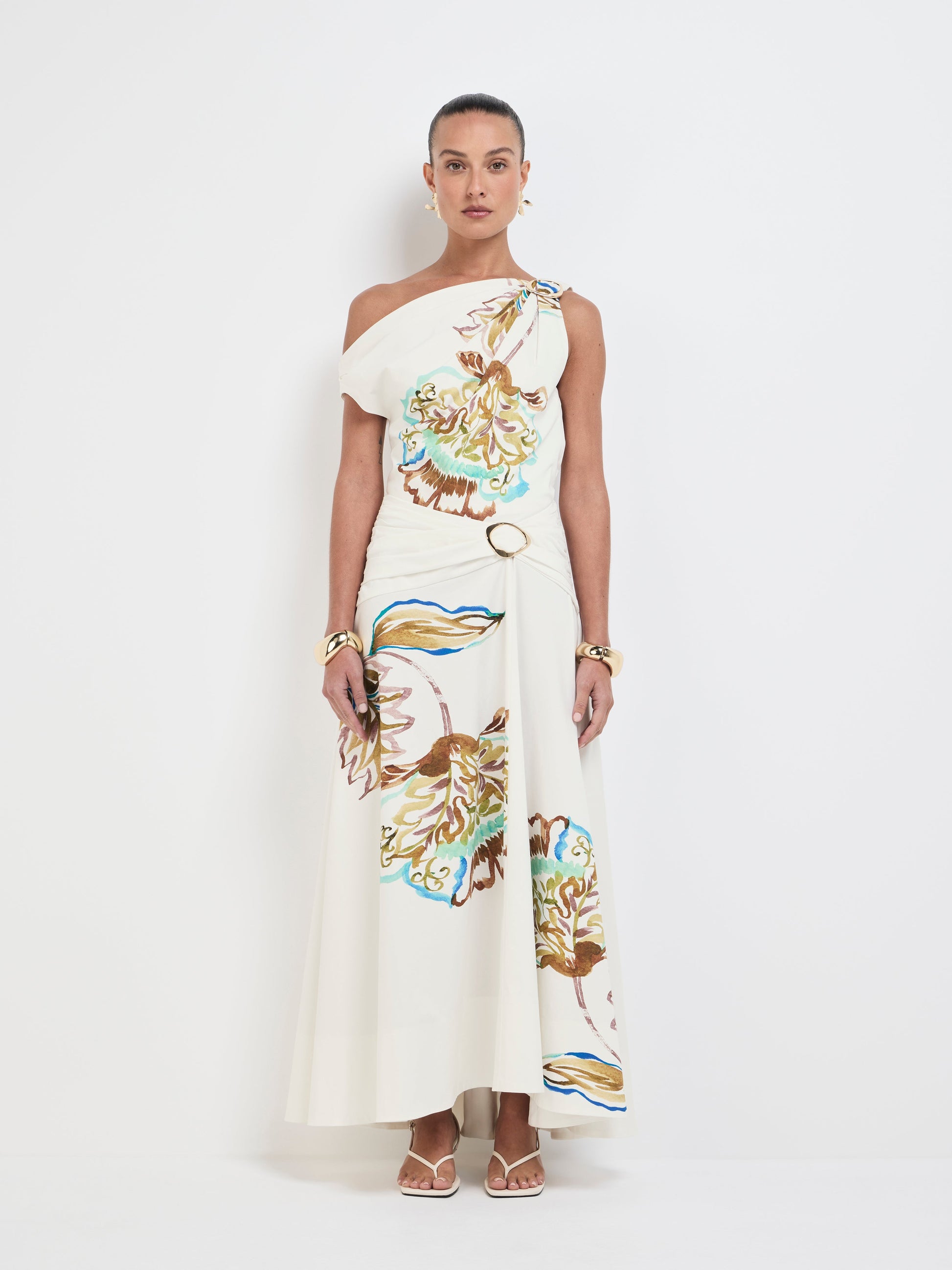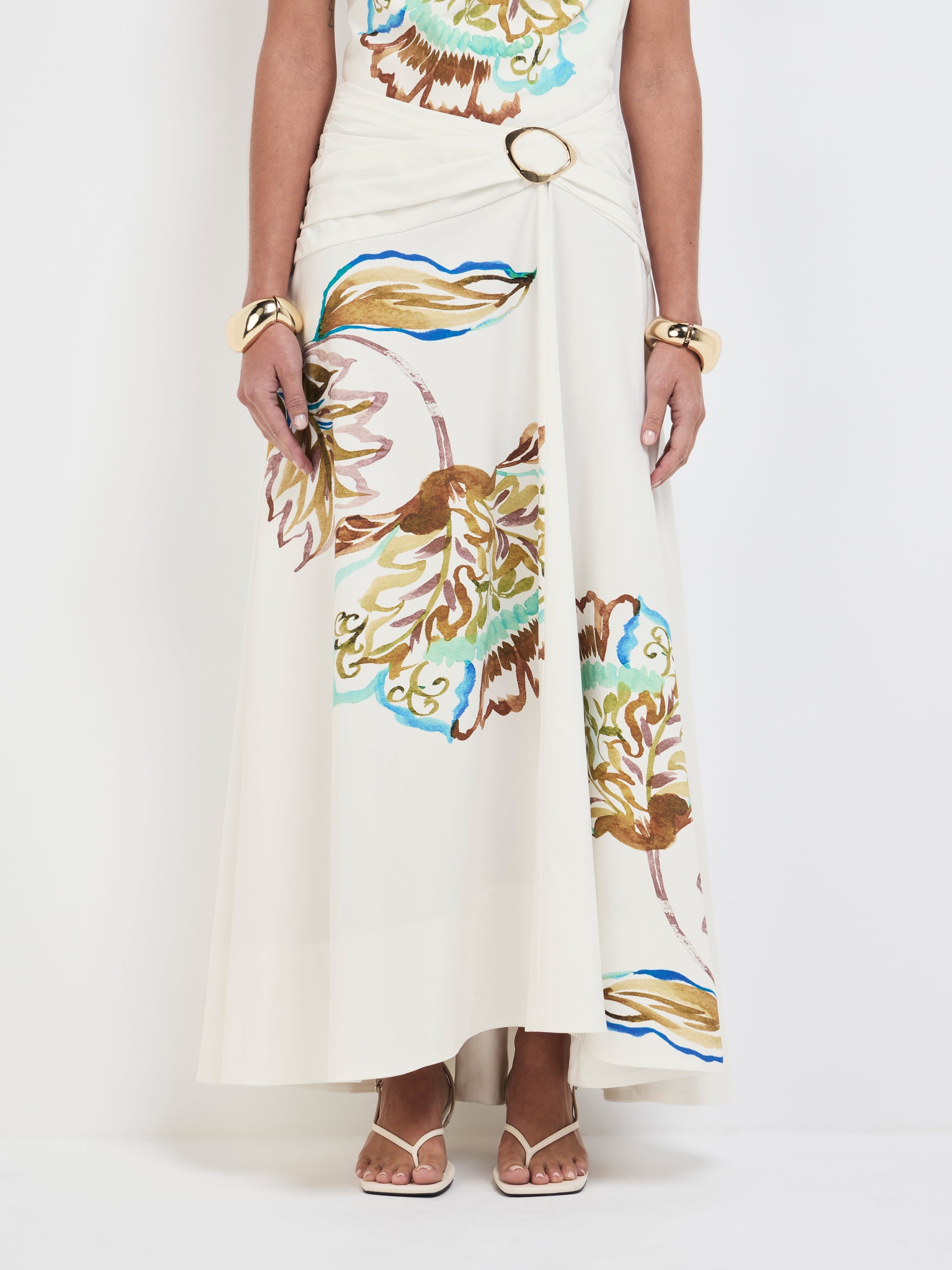 Floral reimagined - introducing the Mira Midi Skirt. Showcasing a printed Cotton Spandex fabrication, high fitted waist with full skirt, ruched hip and gold buckle detail and midi skirt length. Pair with our matching Mira Top to complete the look.