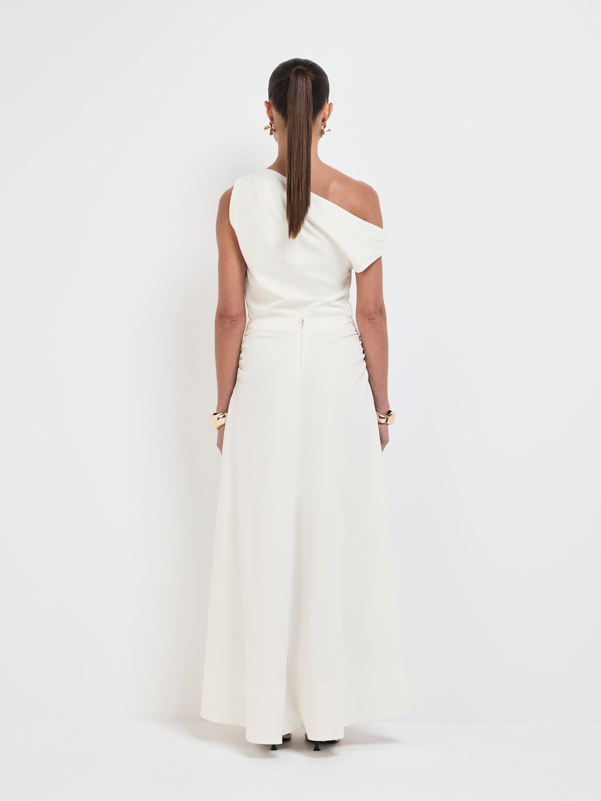 - Ruched hip and gold buckle detailing