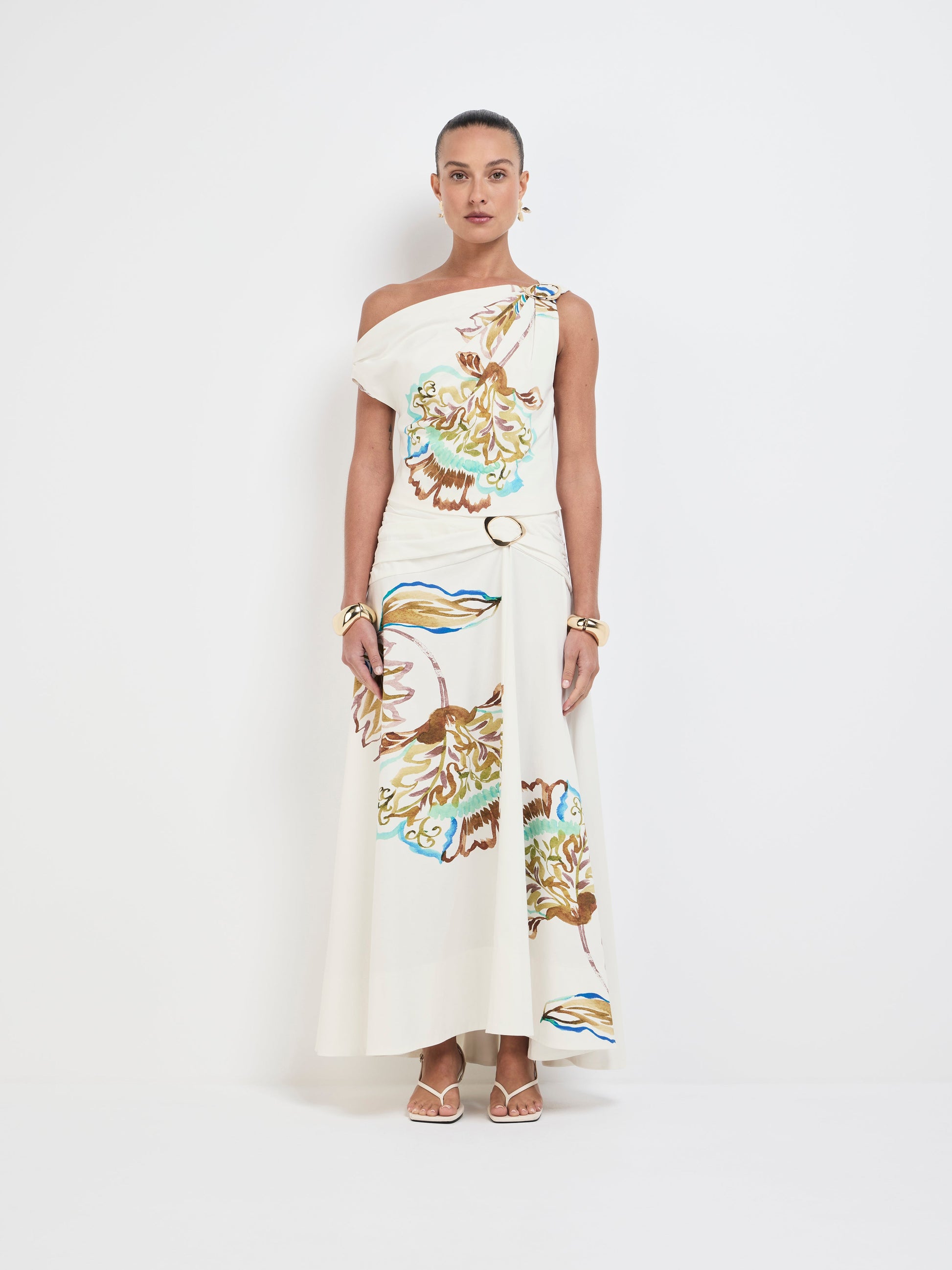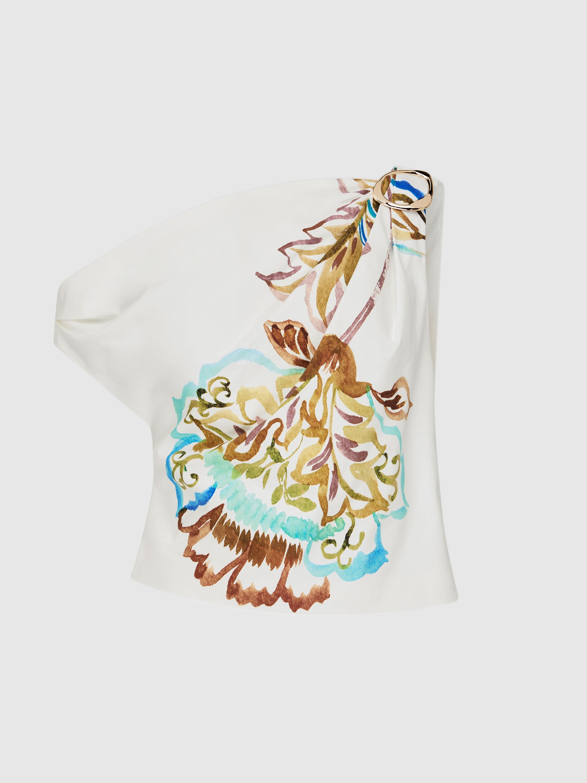 Floral reimagined - introducing the Mira Top! Showcasing a printed Cotton Spandex blend fabrication, fitted crop style, asymmetrical neckline with gold hardware detail, one off shoulder and invisible side seam zip at hem. Pair with our matching Mira Midi Skirt to complete the look.