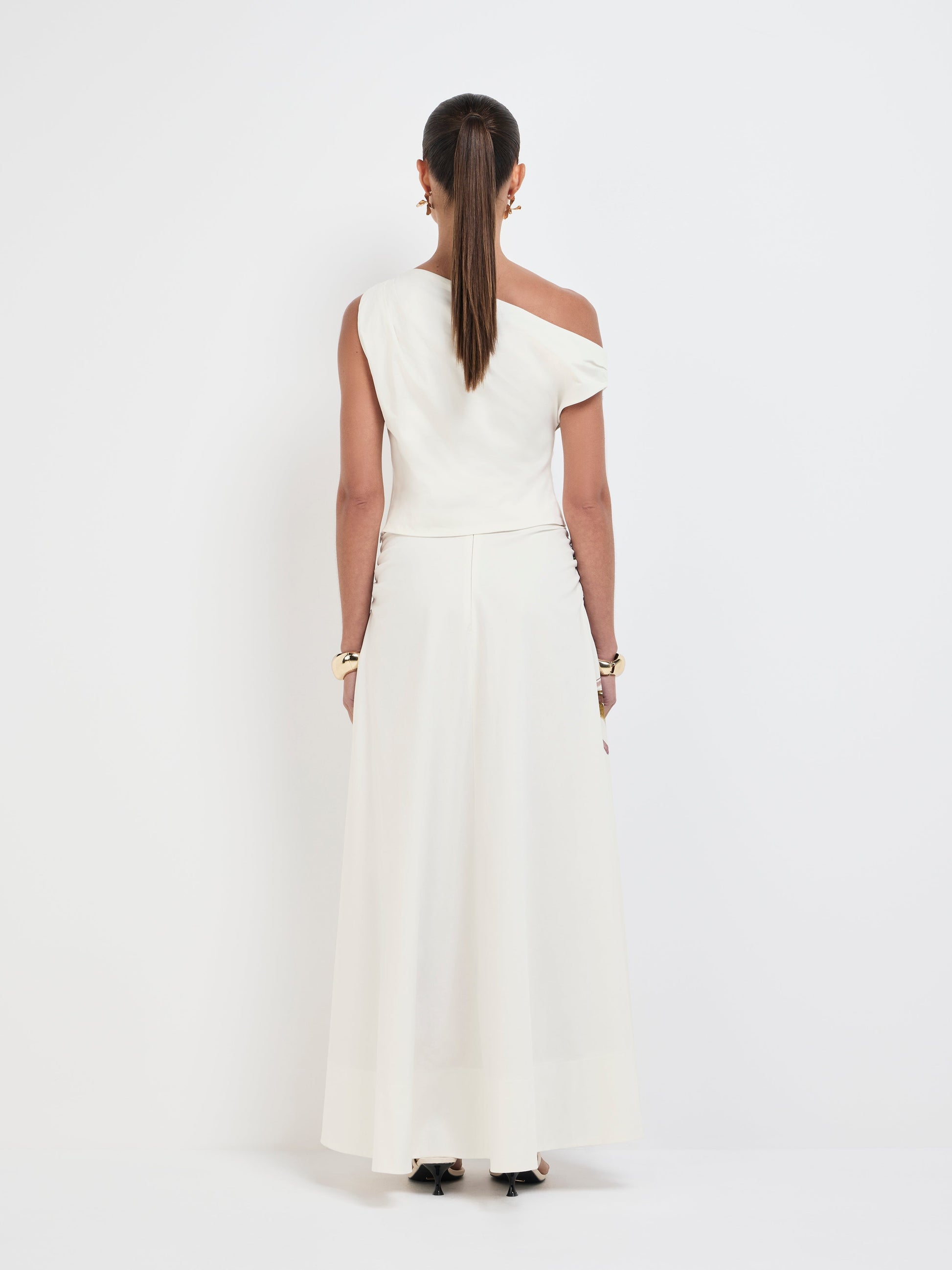 - Asymmetrical neckline with soft gold hardware detail