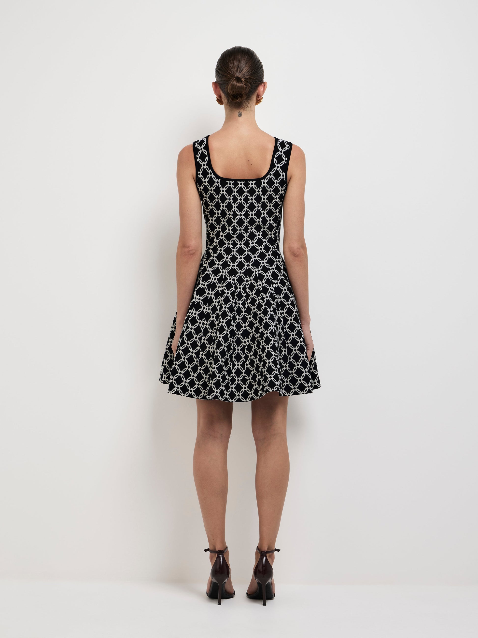 The Monaca Mini Dress combines elegance and comfort with its True Knit fabrication. Featuring a fitted bodice, full skirt, and stylish knitted geo print, this mini dress offers a flattering silhouette. The square neckline adds a modern touch, while the 100% nylon fabric ensures a soft, luxe feel.