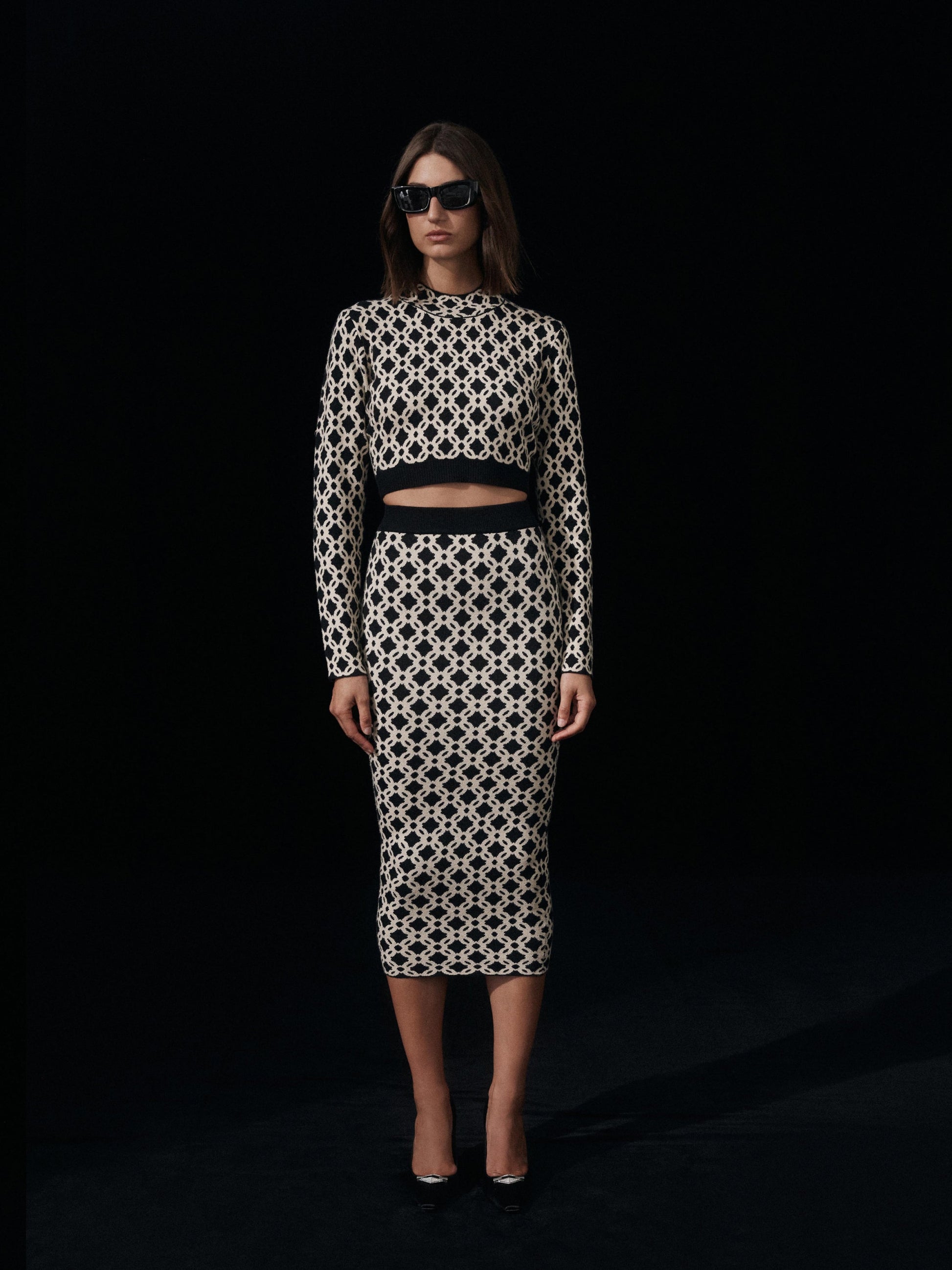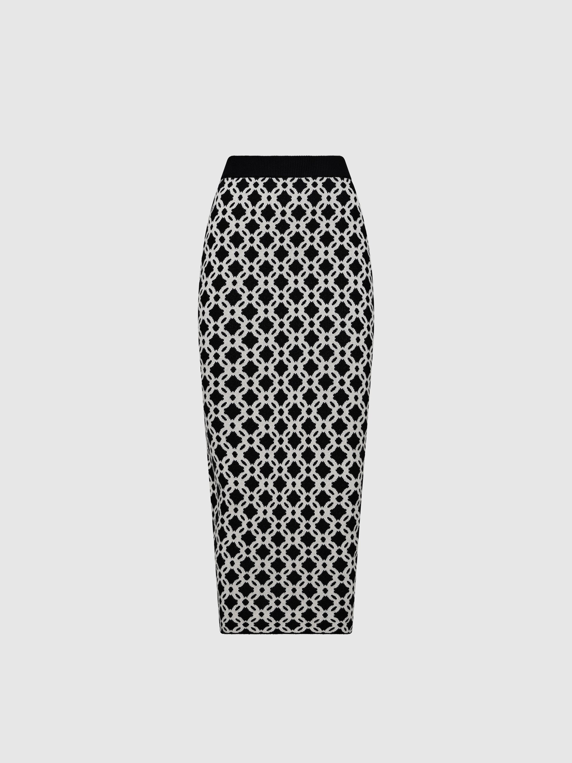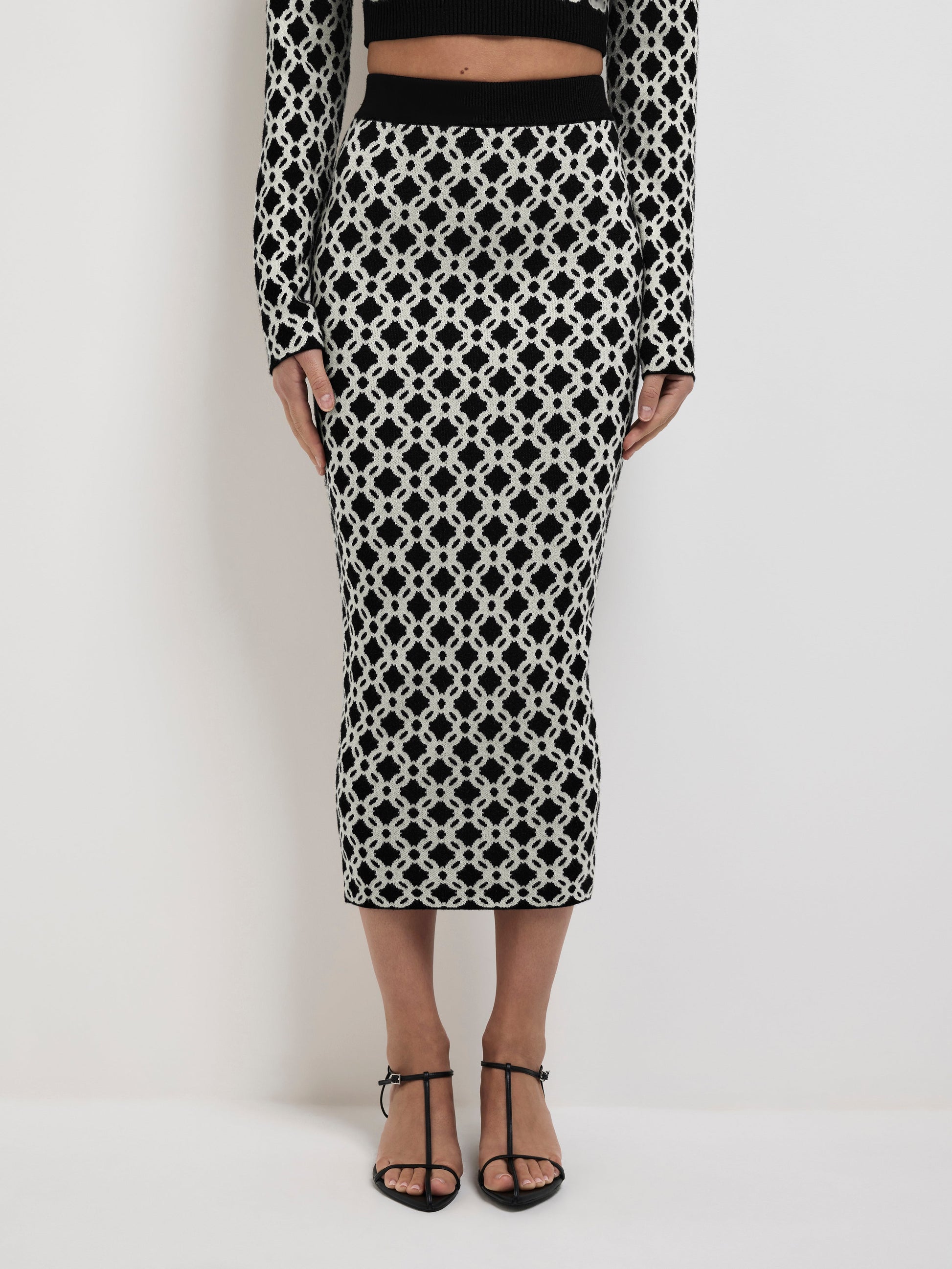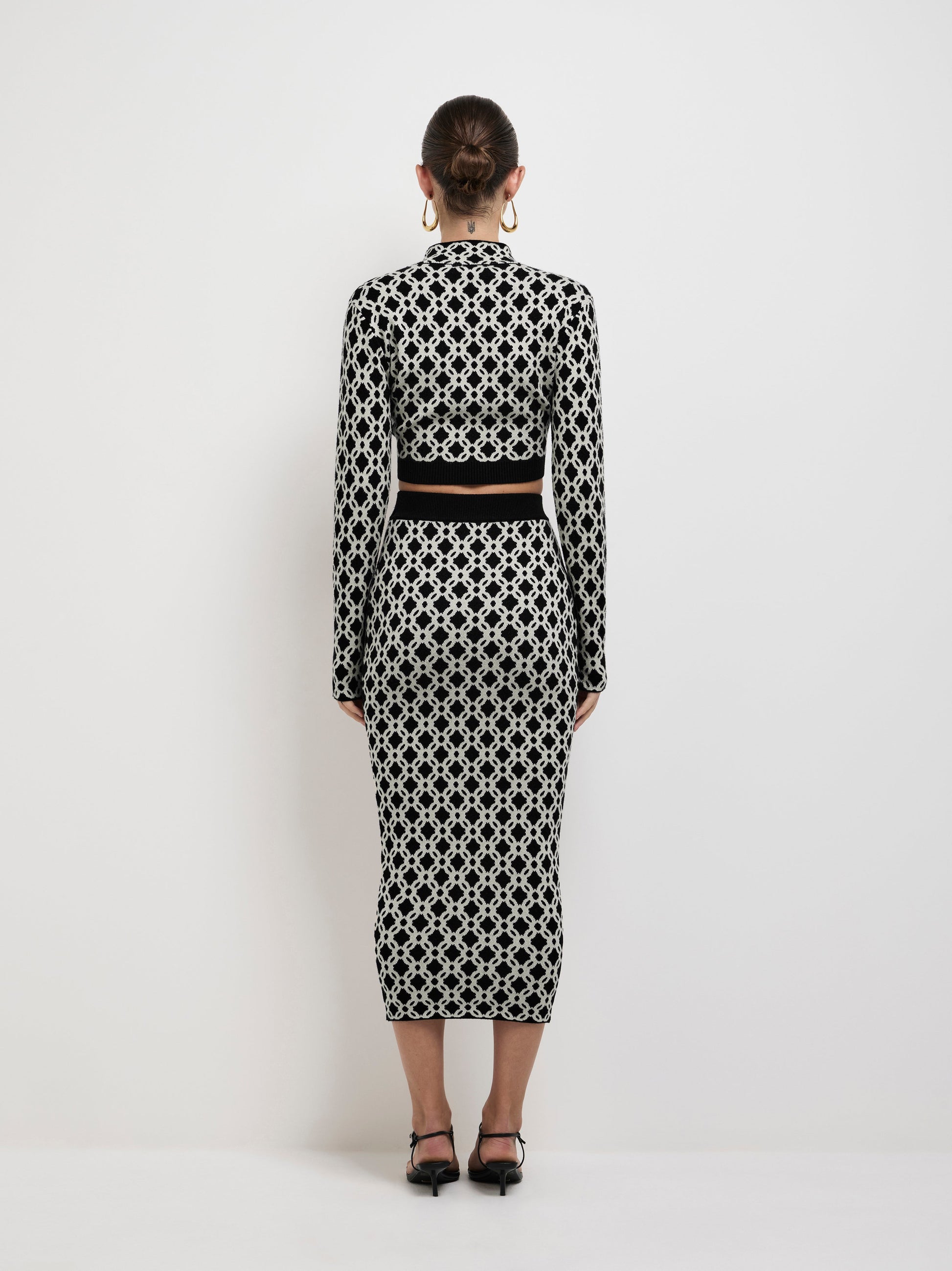 The Monaco Knit Dress is the perfect blend of sophistication and comfort. This high-waisted knit skirt combines a flattering fitted silhouette with all-day comfort. Made from true knit fabrication, it features a textured knitted print and a ribbed, elasticated waistband for a secure yet flexible fit. Pair with the Monaco Knit Top & Phoenix Earrings to complete the look.
