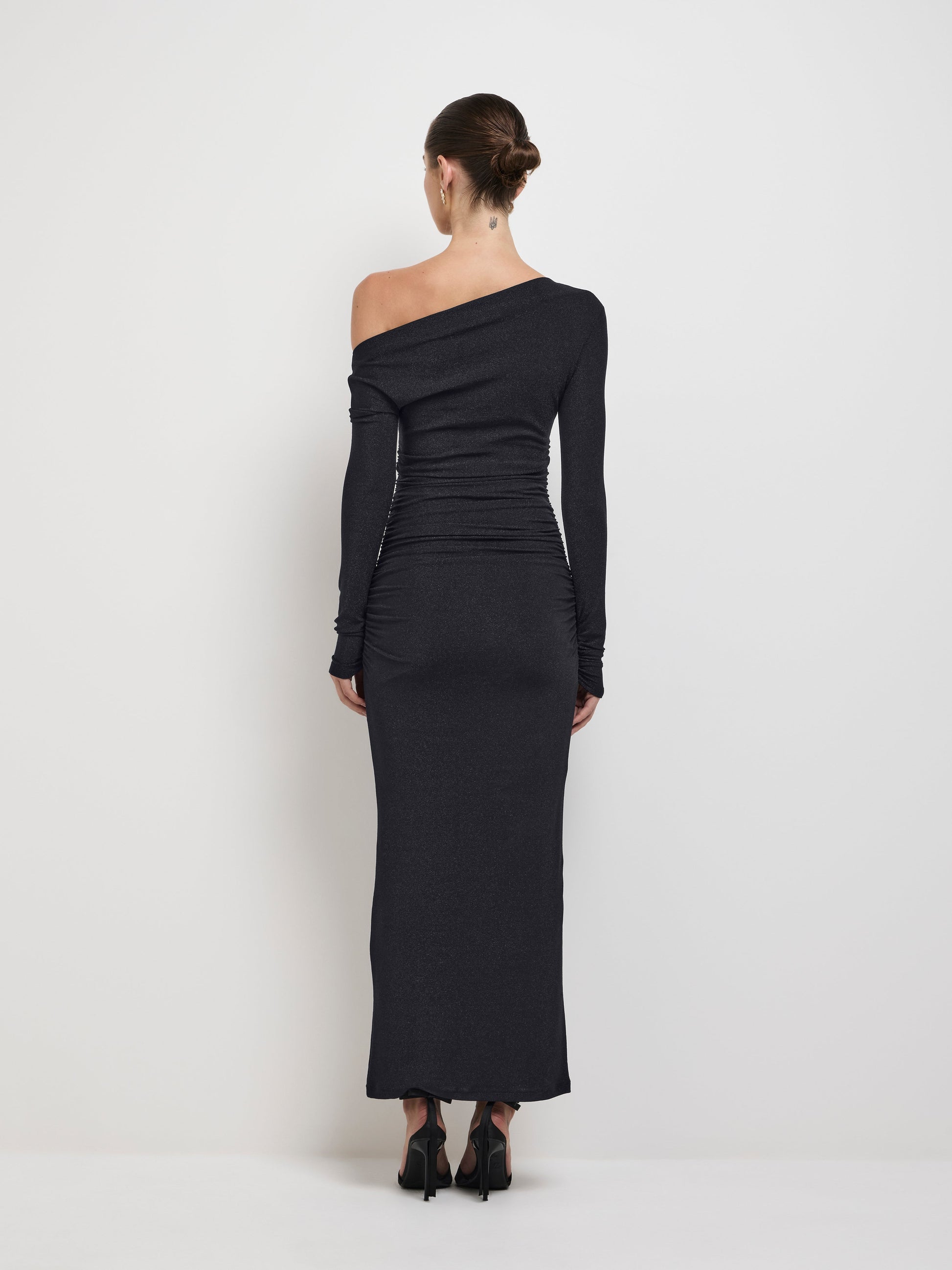Shine under the spotlight in the Mya Dress. Showcasing a black metallic lurex blend fabrication, fitted cut, asymmetric off shoulder neckline, ruching at waist and long sleeves. Pair with our Mana Earrings to complete the look.