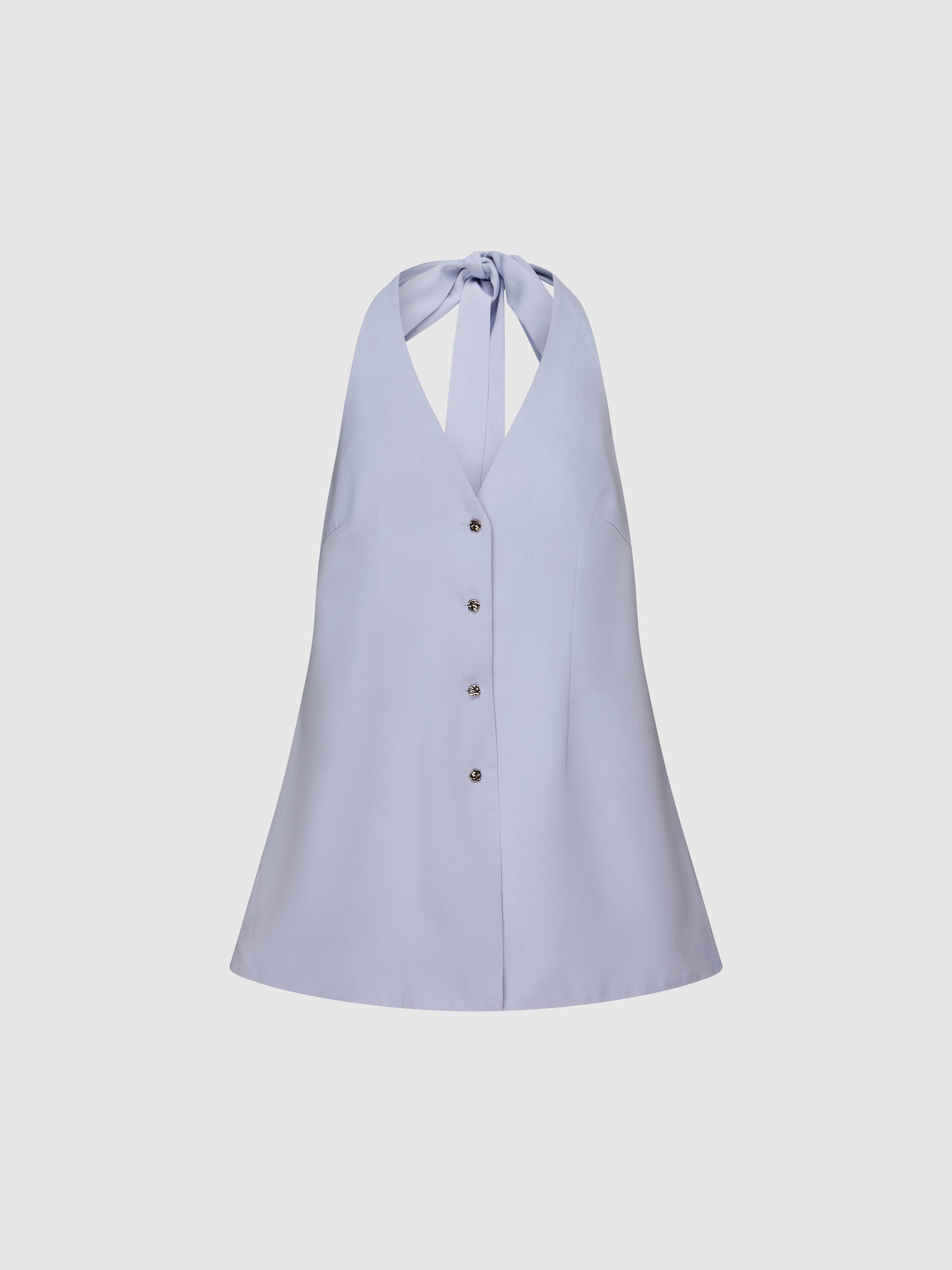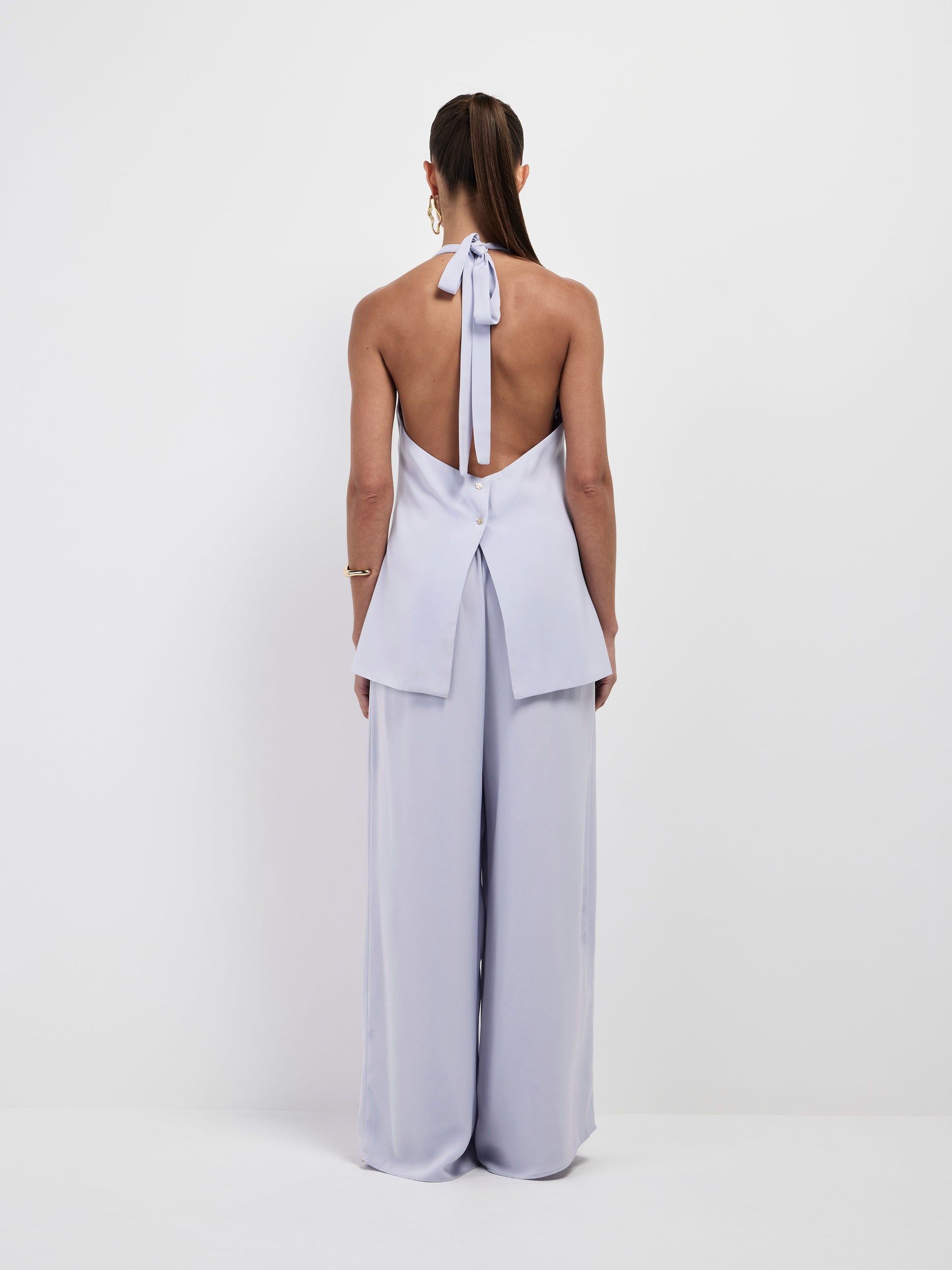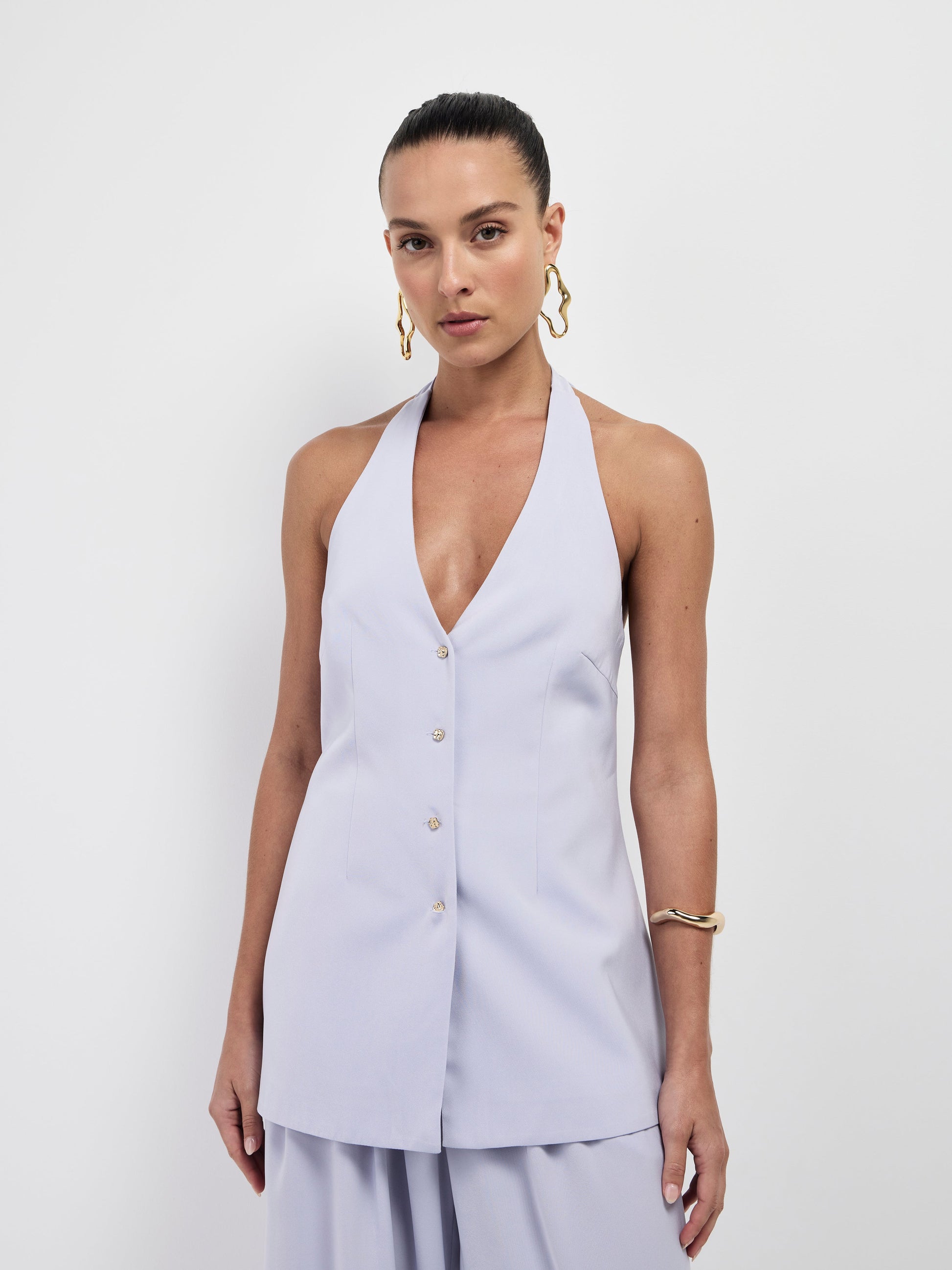 A fresh take on an effortless staple piece - Introducing the Natasha Vest. Showcasing a lilac woven fabrication, relaxed fit, functional buttons on front and back and halter neck with tie straps. Pair with our matching Natasha Pant to complete the look.