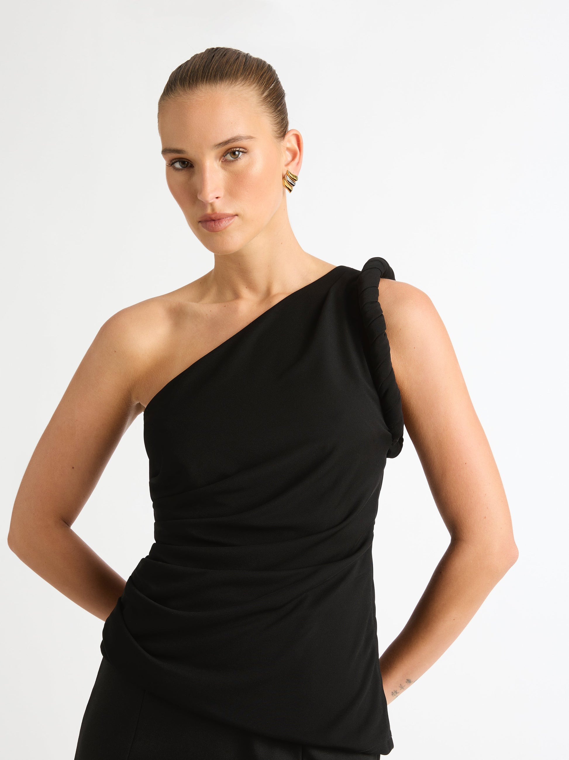 Get Spring ready with this seasons staple must have! Our Nesta Top is your essential basic with a twist - featuring a black stretch fabrication, asymmetrical neckline, twist padded armhole detailing, side seam tucks and side invisible zipper. Why not style with our Liaison Skirt to complete your look.