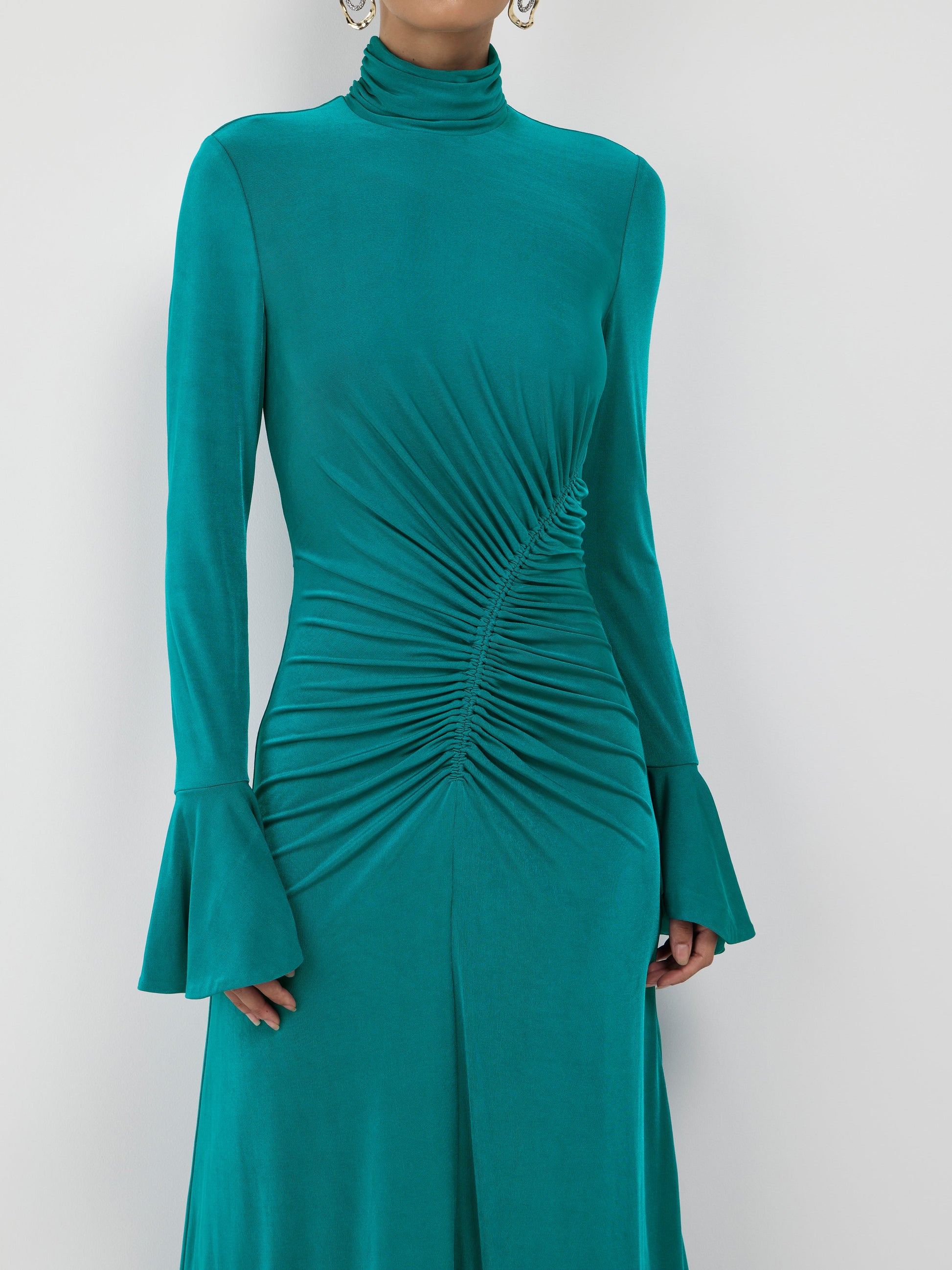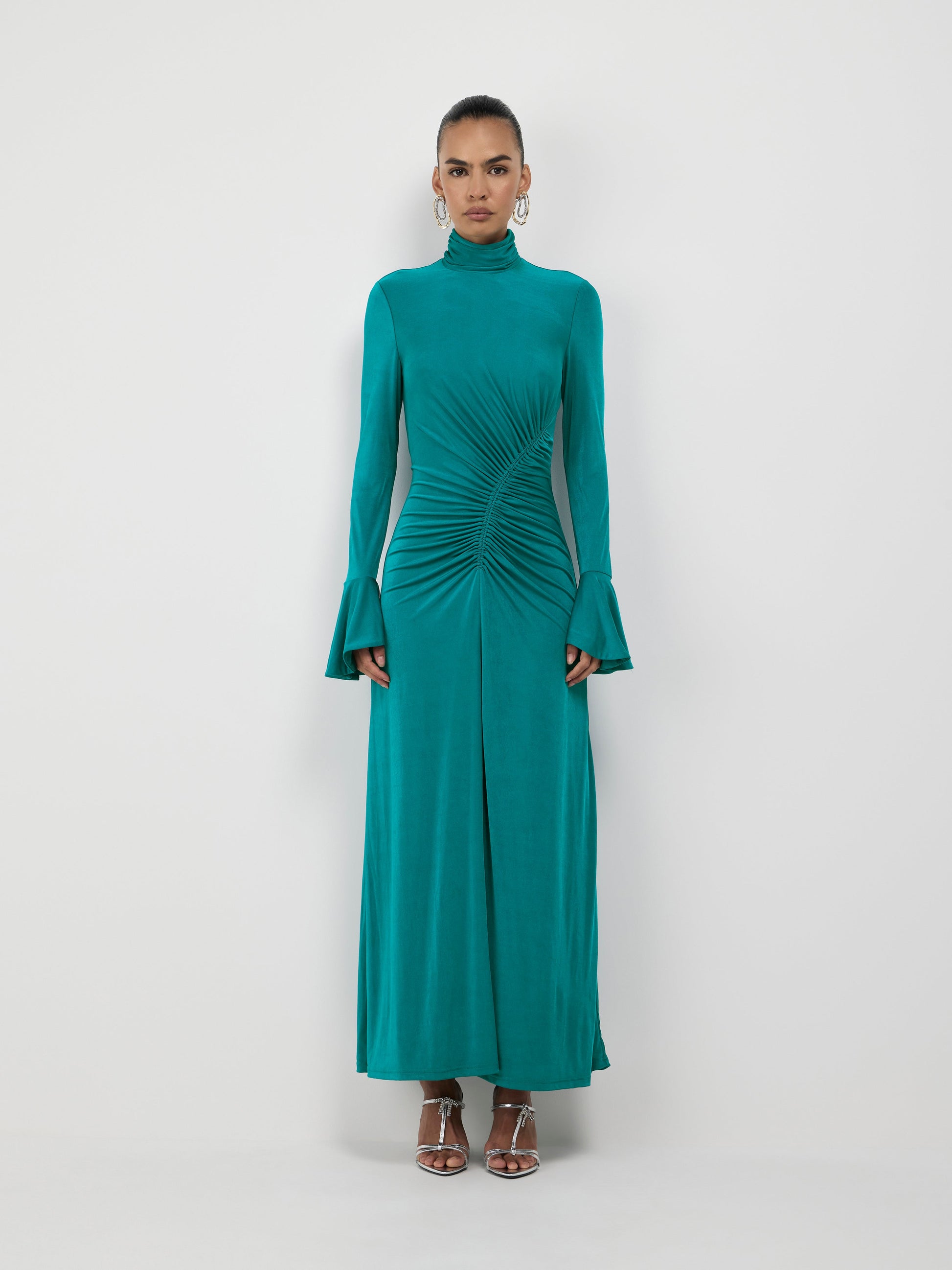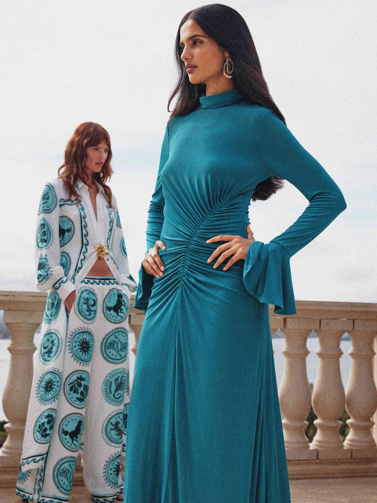 Designed for the Spotlight – With a ruched bodice and fluted sleeves, the Nicola Maxi dress blends drama with undeniable elegance. Showcasing a teal stretch knit fabrication, slim fit cut, asymmetric gathering detailing, high neckline, fluted long sleeves and maxi length skirt. Pair with our Relic Earrings to complete the look.